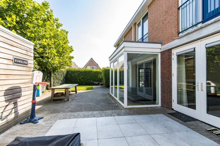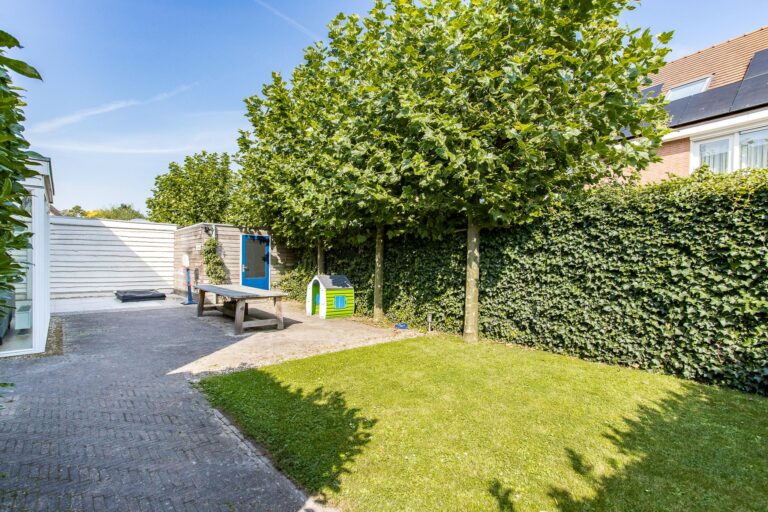 Buiten treft u een onderhoudsvriendelijke tuin op het oosten, ingericht met een fraai gazon, sierbestrating en moderne terrastegels. De tuin biedt zowel zonnige plekken als voldoende schaduw voor ontspanning. Aan de voorzijde van de woning bevindt zich een eigen oprit en een vrijstaande berging, aangevuld met 2 extra bergingen aan de woning voor extra opslagruimte.