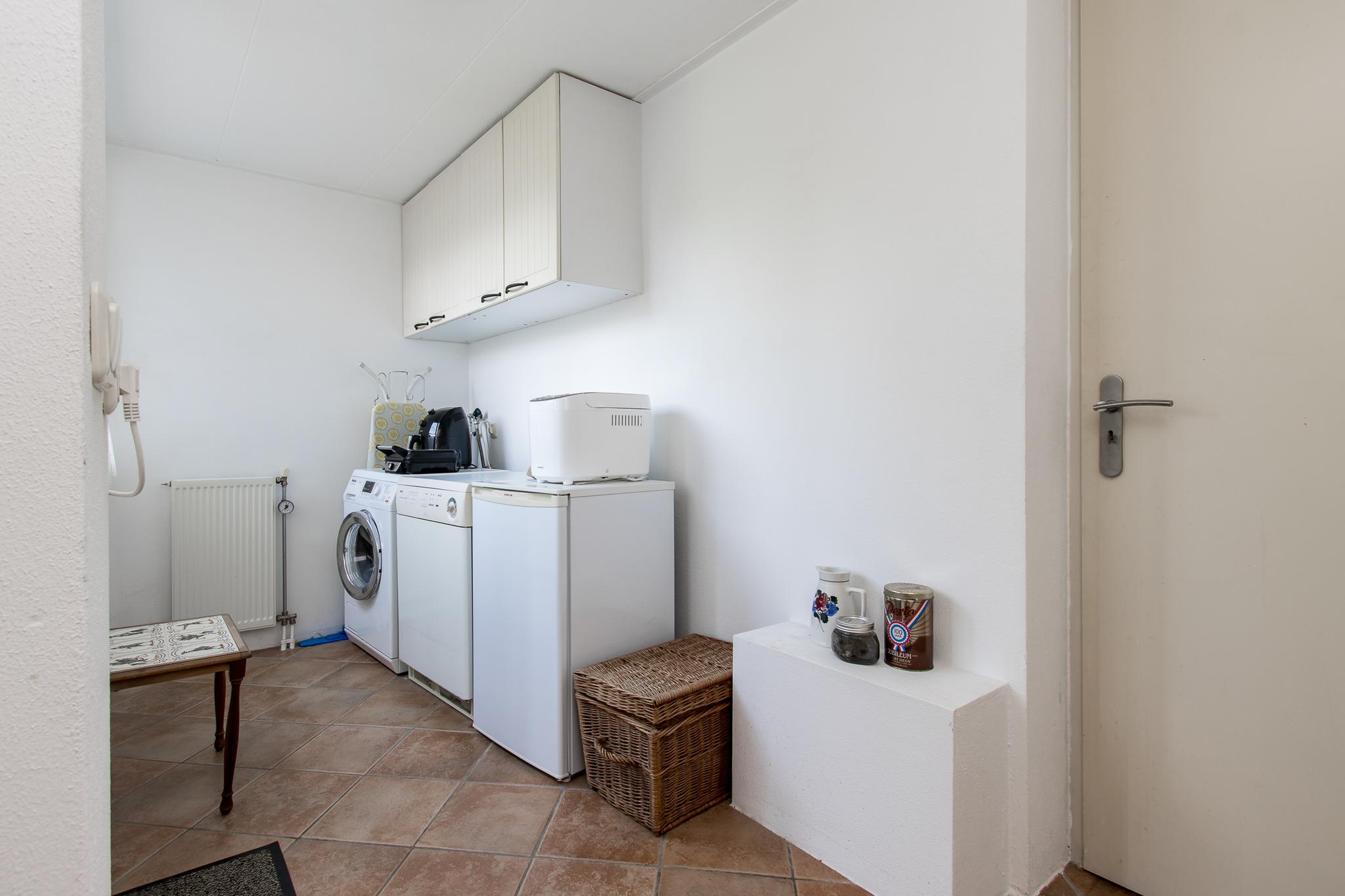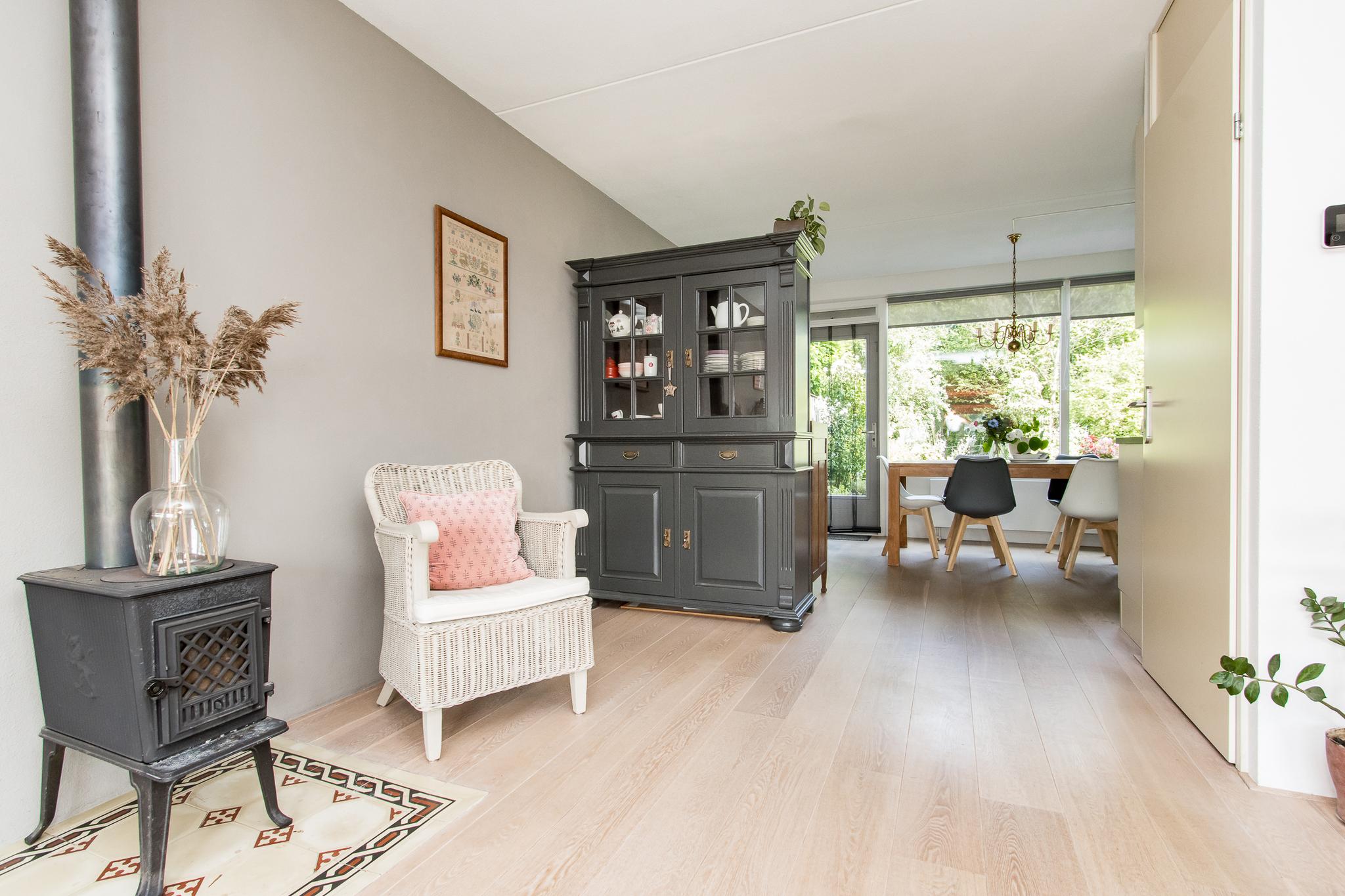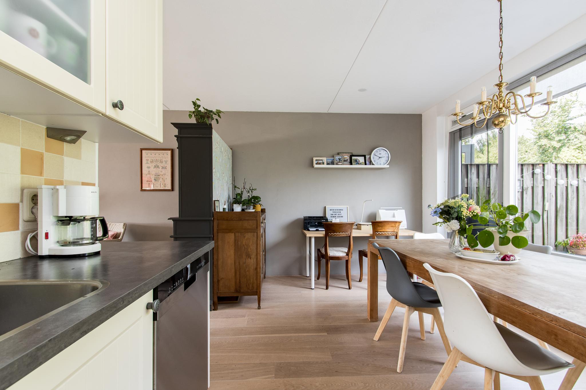 Indeling woonhuis: via de overdekte entree bereikt u de ruime hal met garderobe, meterkast, toiletruimte en trapopgang naar de eerste verdieping. Vanuit de hal is de sfeervolle woonkamer te bereiken, die in open verbinding staat met de keuken aan de achterzijde. De keuken in hoekopstelling is voorzien van diverse inbouwapparatuur, zoals; 5-pits kookplaat, afzuigkap, oven en koelkast. Aangrenzend bevindt zich de bijkeuken met aansluitingen voor het witgoed. Vanuit de bijkeuken is de achtertuin en de garage bereikbaar.