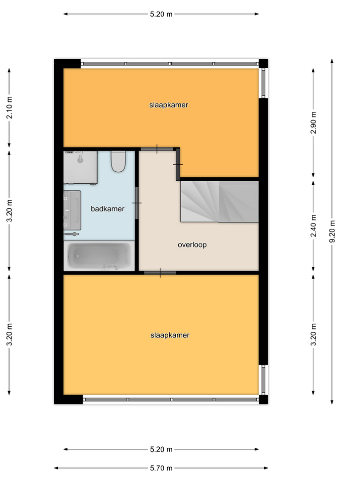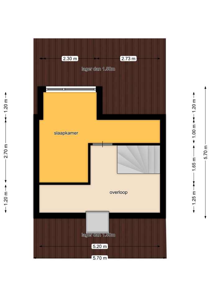 Tweede verdieping: een vaste trap geeft toegang tot de ruime overloop voorzien van dakvenster. Via de overloop bereikt u de 3e slaapkamer met dakkapel voor extra ruimte en licht.