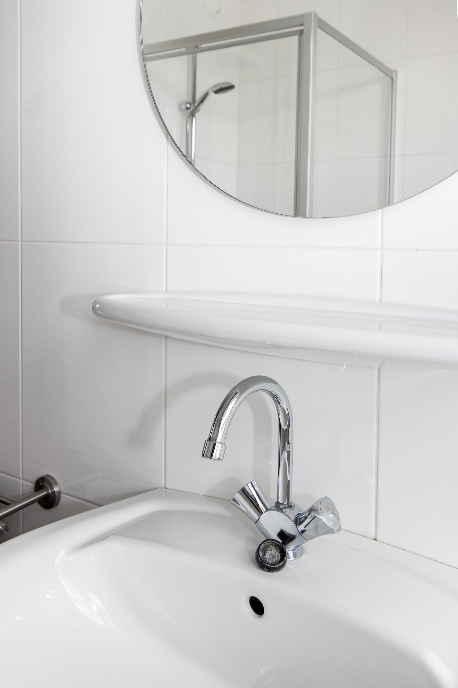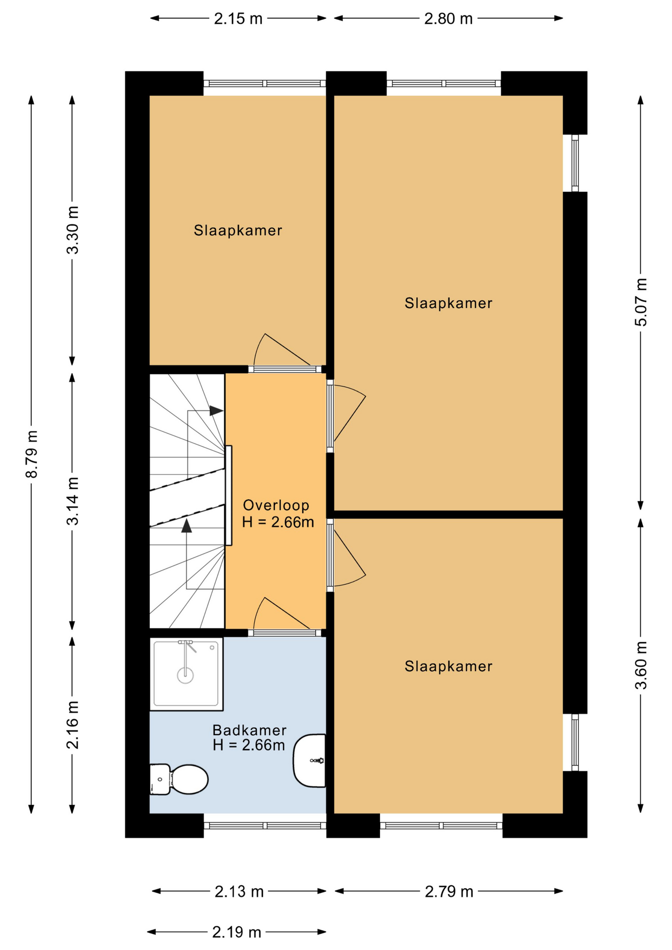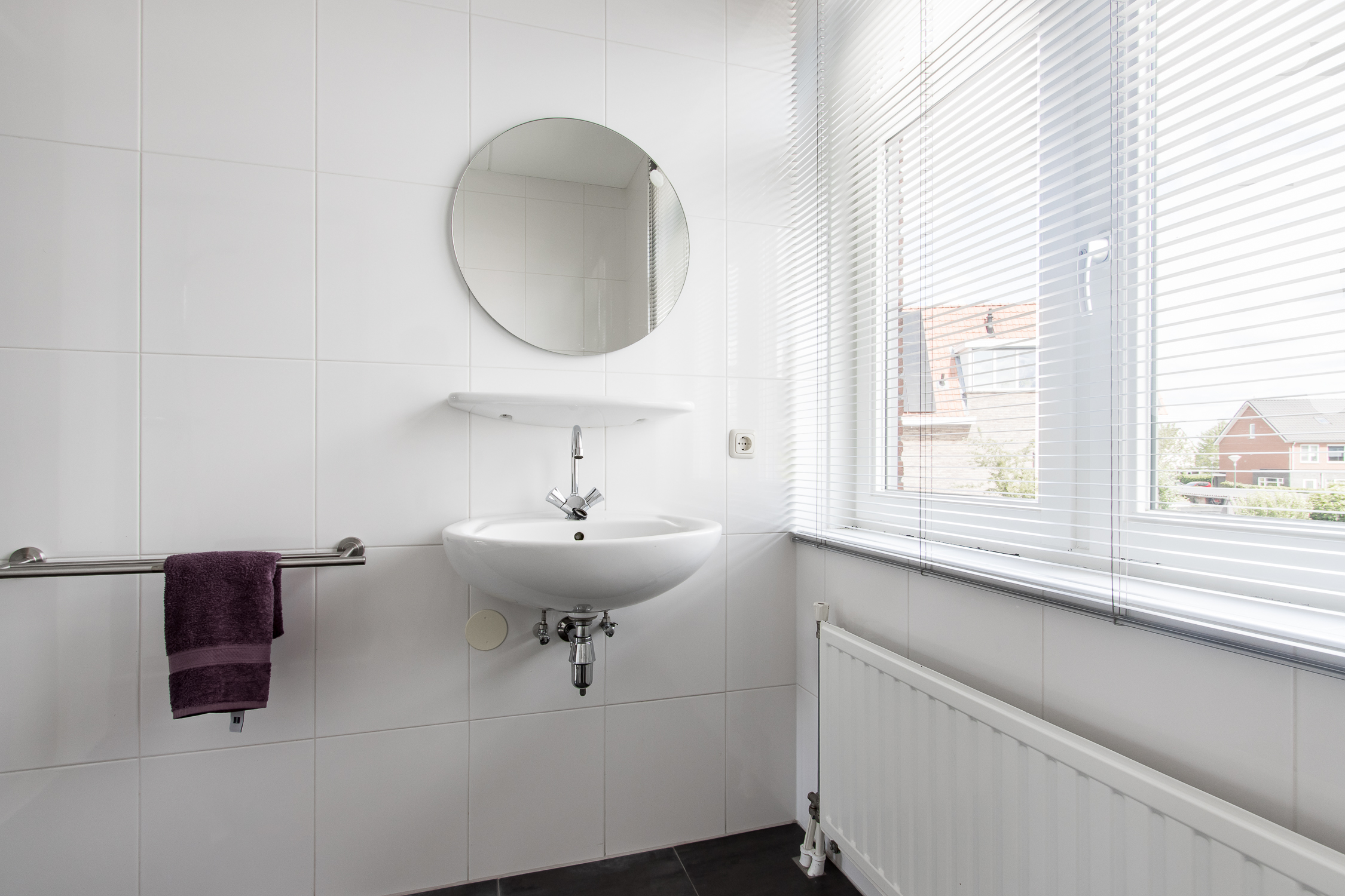 Eerste verdieping: de overloop leidt naar drie slaapkamers en nette badkamer met douche, toilet en wastafel.