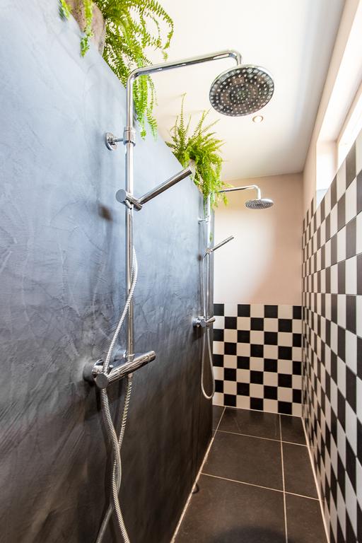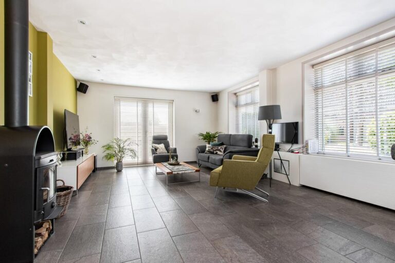 Aan de voorzijde bevindt zich de sfeervolle woonkamer met houtkachel en openslaande deuren naar het terras.