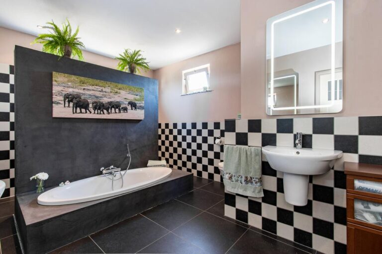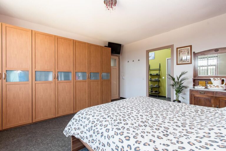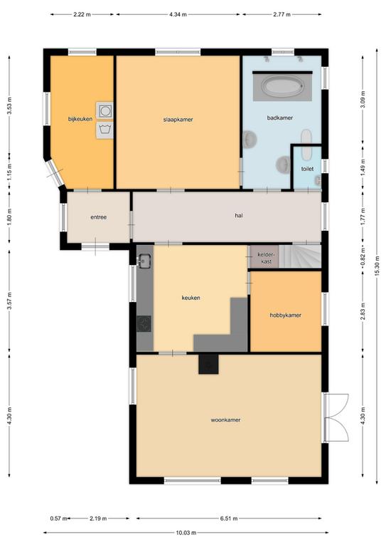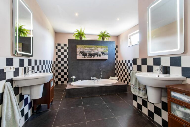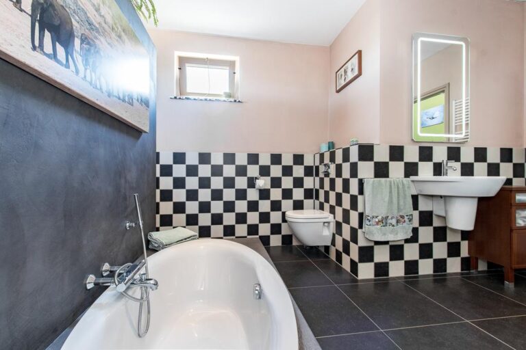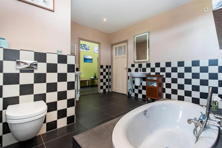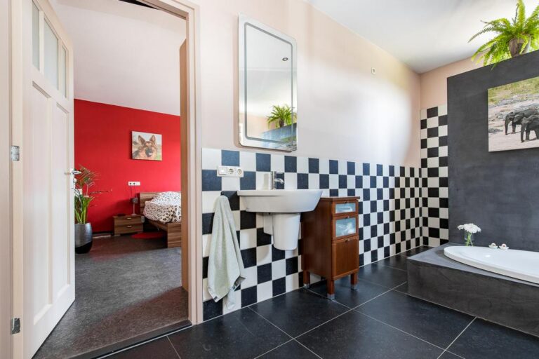 Begane grond: via de oprit bereikt u de entree aan de linkerzijde van de woning. De entree verschaft toegang tot de bijkeuken met witgoedaansluiting en de hal met meterkast en trapopgang naar de verdieping. Vanuit de hal is de grote slaapkamer aan de achterzijde van de woning toegankelijk, alsmede de woonkeuken, toiletruimte en royale badkamer v.v. vrijstaand verzonken ligbad, inloopdouche met dubbele stortdouche, 2 wastafels en wandcloset. Deze badkamer is eveneens vanuit de slaapkamer bereikbaar. De ruime woonkeuken met moderne keukenunit heeft een landelijke uitstraling en is v.v. diverse inbouwapparatuur zoals; inductiekookplaat, afzuigkap, combi-oven, vaatwasser, koelkast en vriezer. Vanuit de keuken heeft u toegang tot de praktische kelderkast en kleinere slaapkamer.