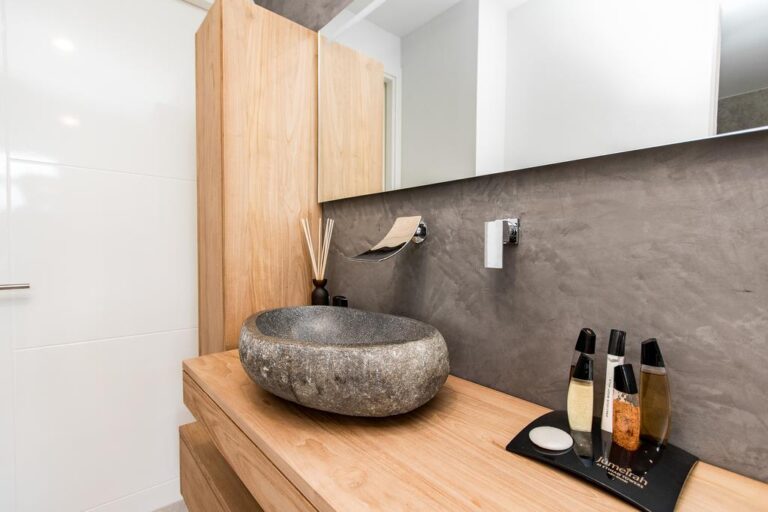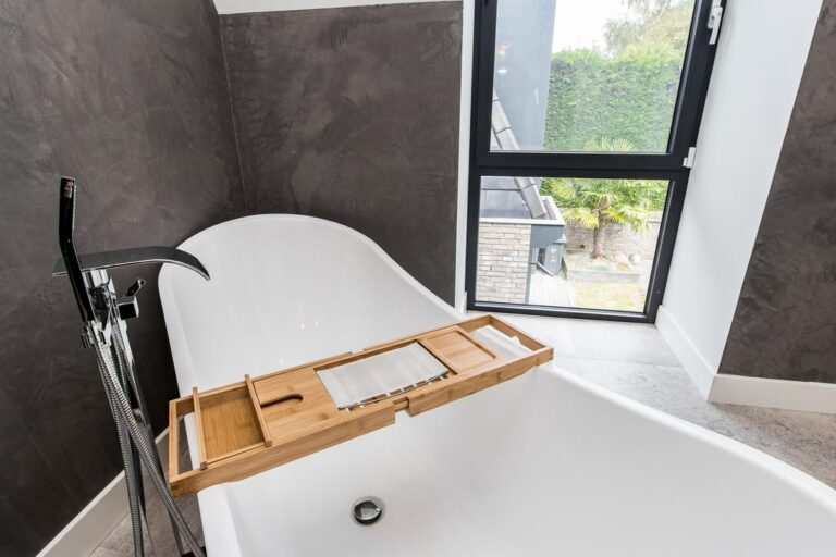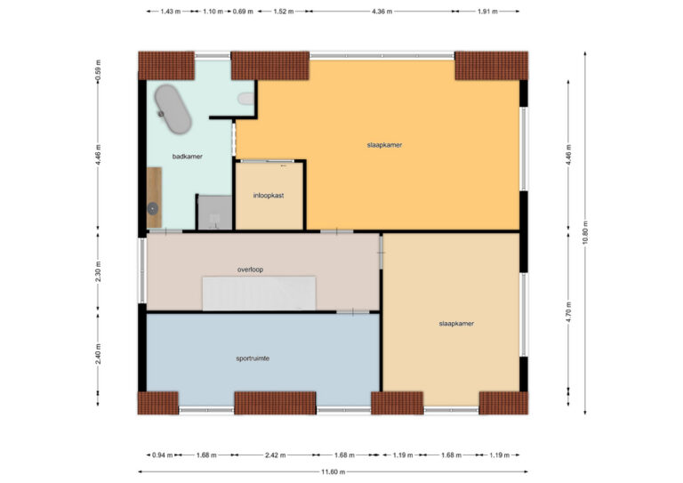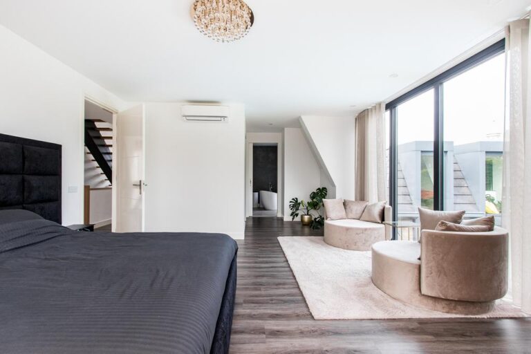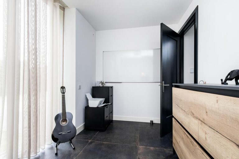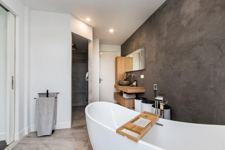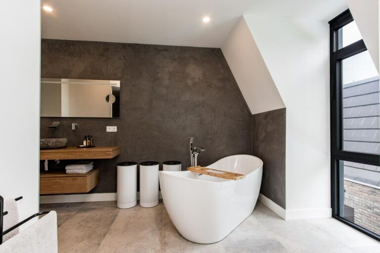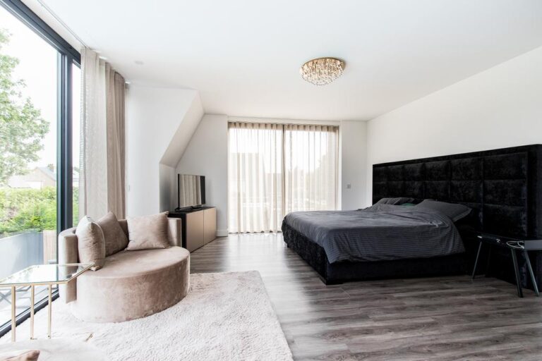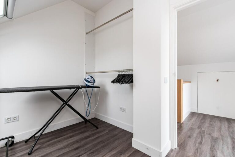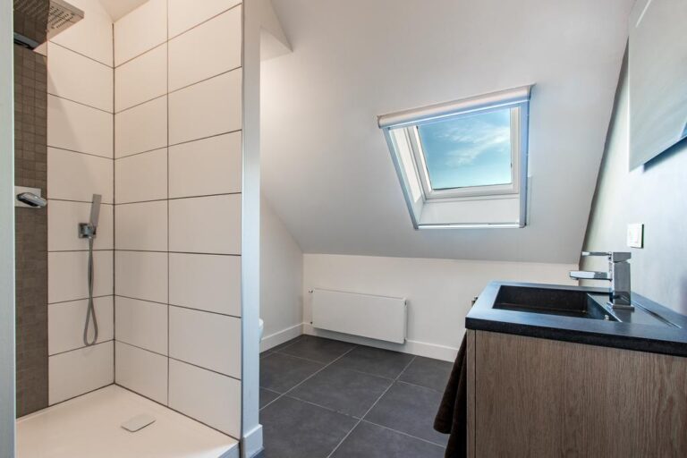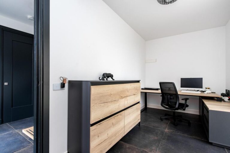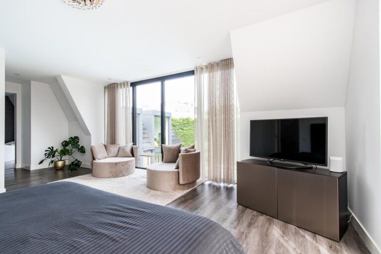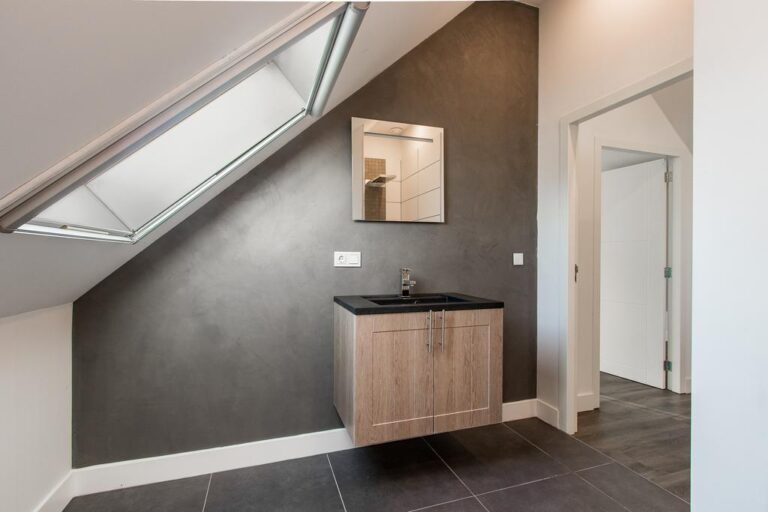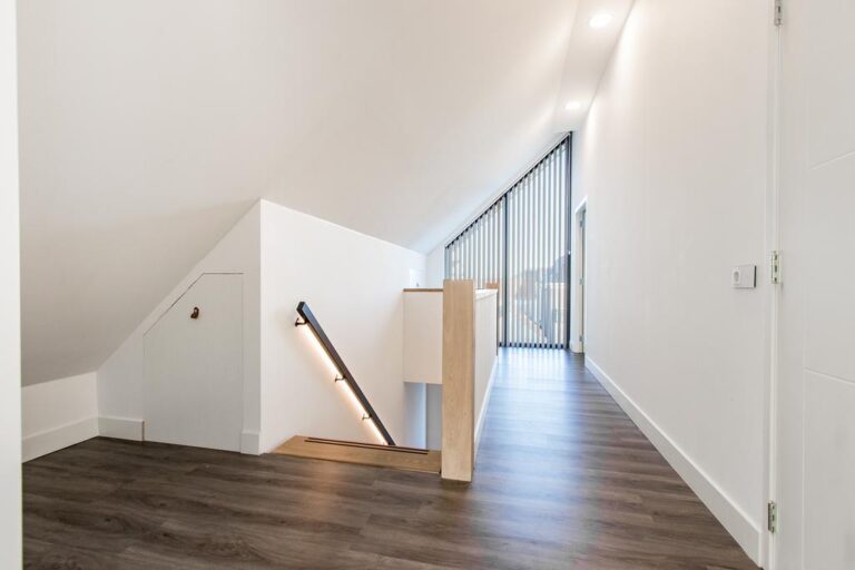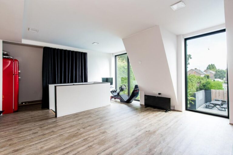 Eerste verdieping: de overloop biedt toegang tot de 2 slaapkamers en luxe badkamer met vrijstaand bad, inloopdouche, wastafelmeubel en wandcloset. De riante masterbedroom bevindt zich aan de achterzijde en is voorzien van inloopkast en geeft eveneens toegang tot de badkamer. Aan de voorzijde bevindt zich de sportruimte met aansluitingen voor het witgoed.