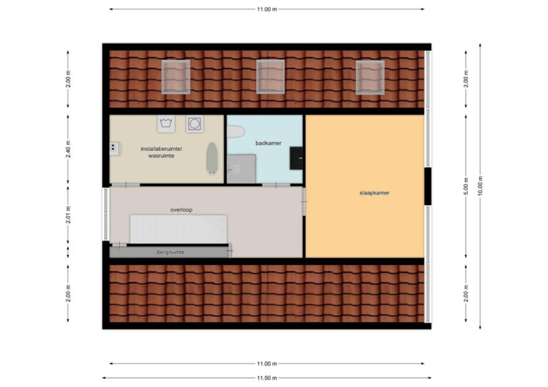 Tweede verzieping: middels vaste trap is de tweede verdieping te bereiken. Via de overloop v.v. bergruimte bereikt u de 3e slaap- en 2e badkamer. Tevens bevindt hier de installatie- en wasruimte met C.V. ketel, wasmachine en droger.