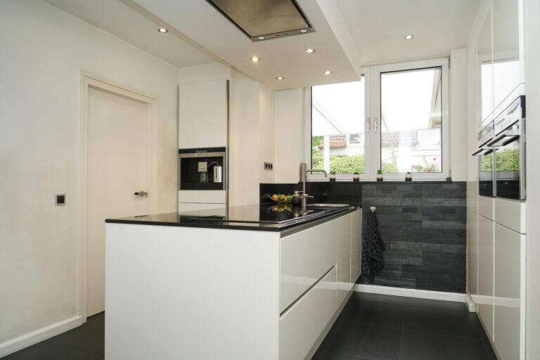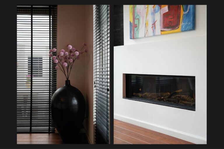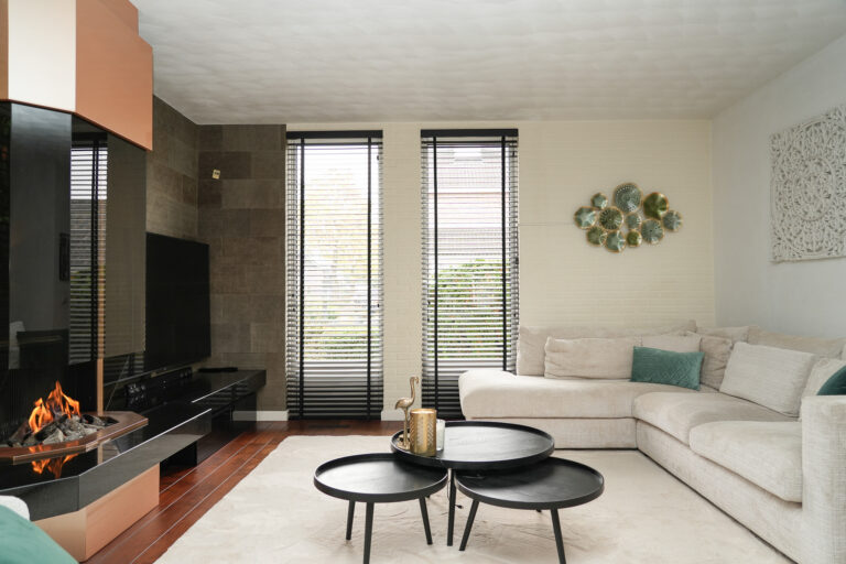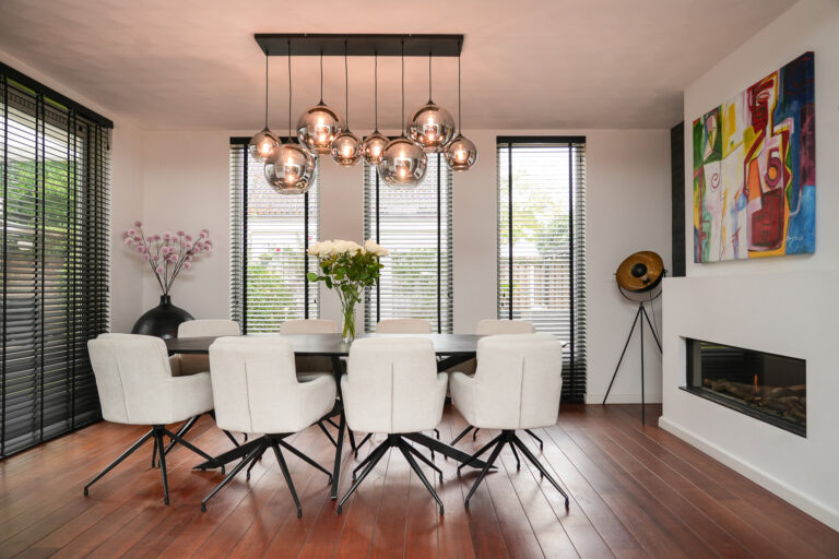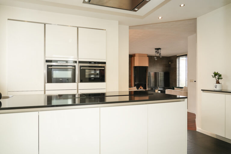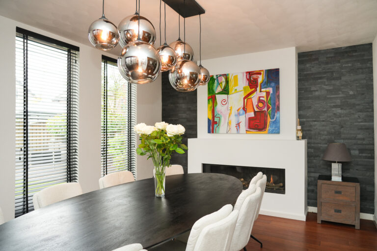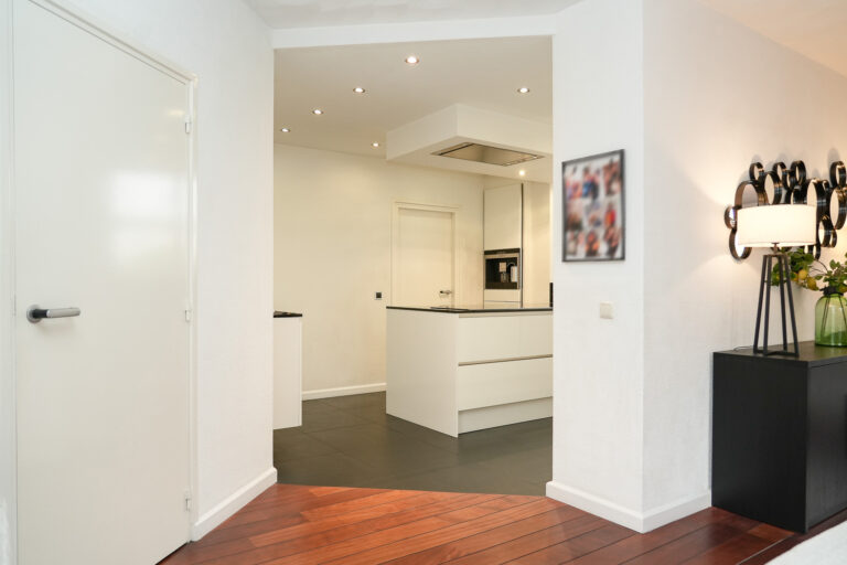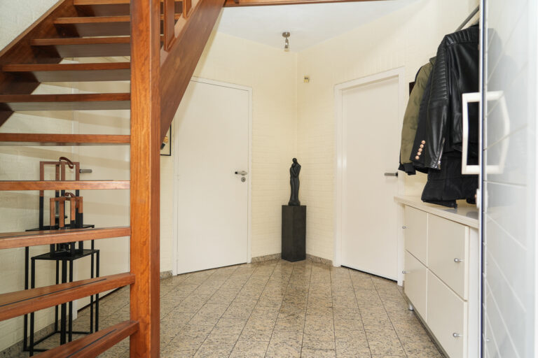 Bij binnenkomst voelt de lichte hal direct ruim en open aan. Vanuit hier heeft u toegang tot de sfeervolle woonkamer, de moderne keuken, de werkkamer en het toilet. De woonkamer is een heerlijke plek om te ontspannen: de gashaard zorgt voor gezelligheid en de twee schuifpuien laten een overvloed aan daglicht binnenstromen en verbinden het interieur naadloos met de tuin.