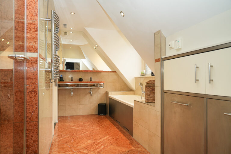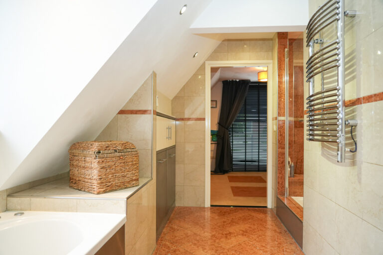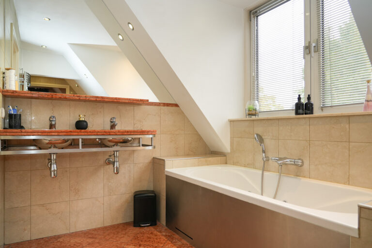 Op de eerste verdieping liggen vier comfortabele slaapkamers, een luxe badkamer en een apart tweede toilet. De badkamer is afgewerkt met marmer en voorzien van een ligbad met whirlpool, een douchecabine met massagestralen en een dubbele wastafel. De hoofdslaapkamer beschikt over een schuifpui naar het balkon en een brede kastenwand, terwijl de overige slaapkamers royaal zijn en veel daglicht ontvangen.