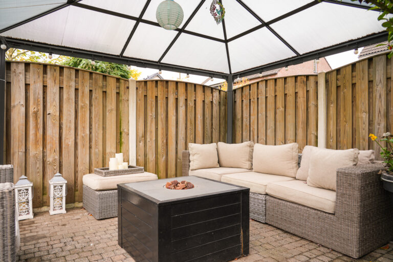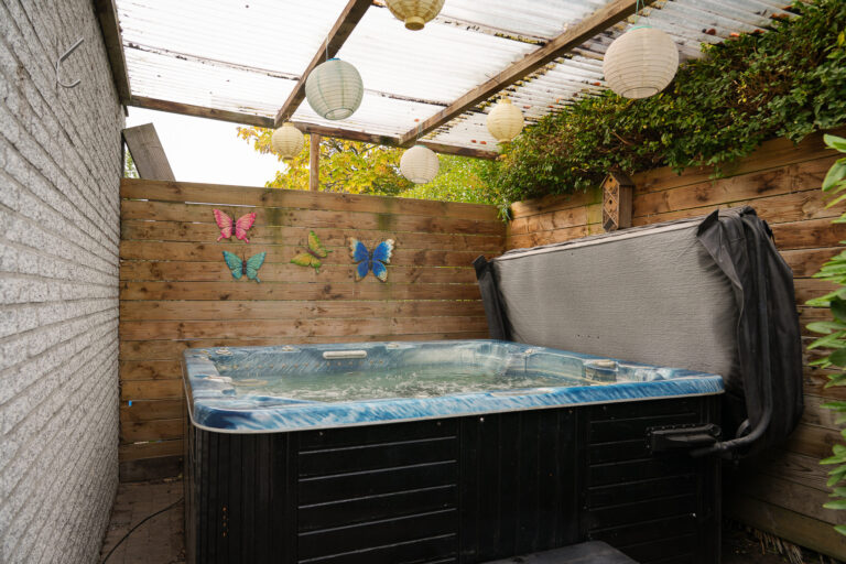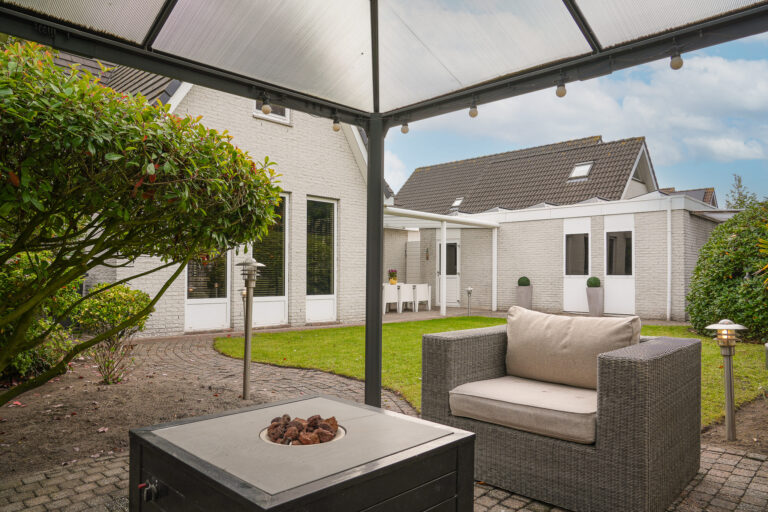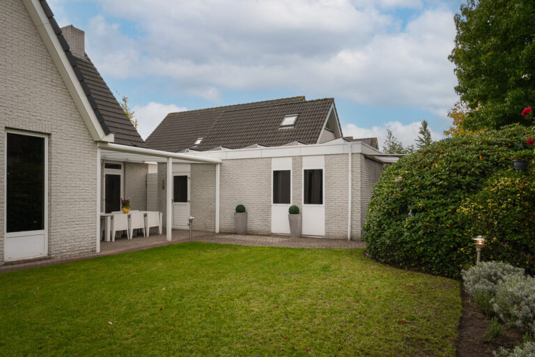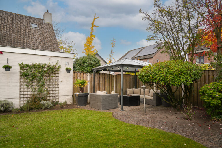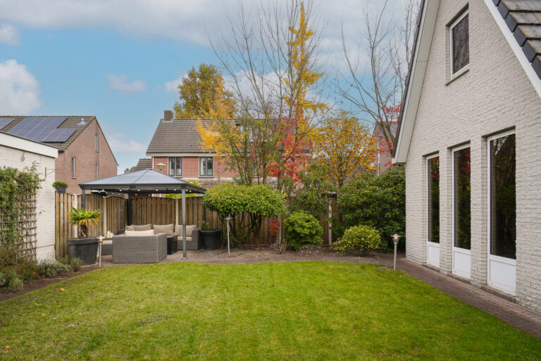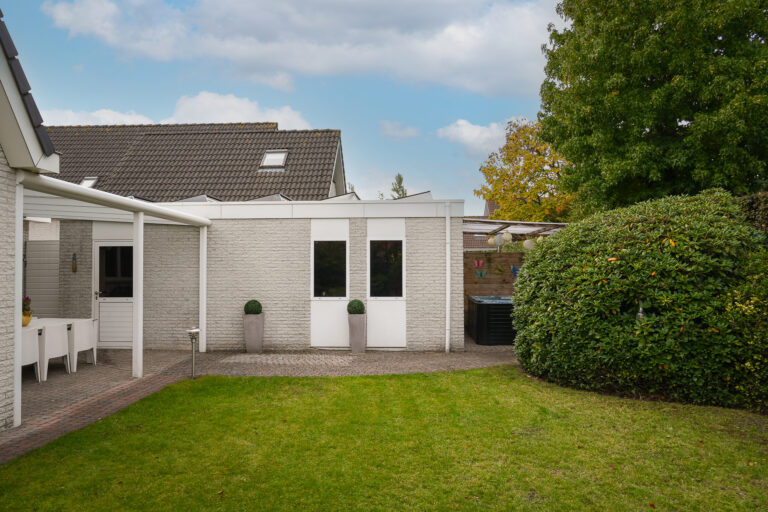 De achtertuin is een oase van rust en privacy. Meerdere terrassen bieden plek voor zon en schaduw, en voor ontspanning is er zelfs een jacuzzi aanwezig. De vrijstaande garage met elektrische kanteldeur is zowel vanuit de tuin als de oprit bereikbaar.