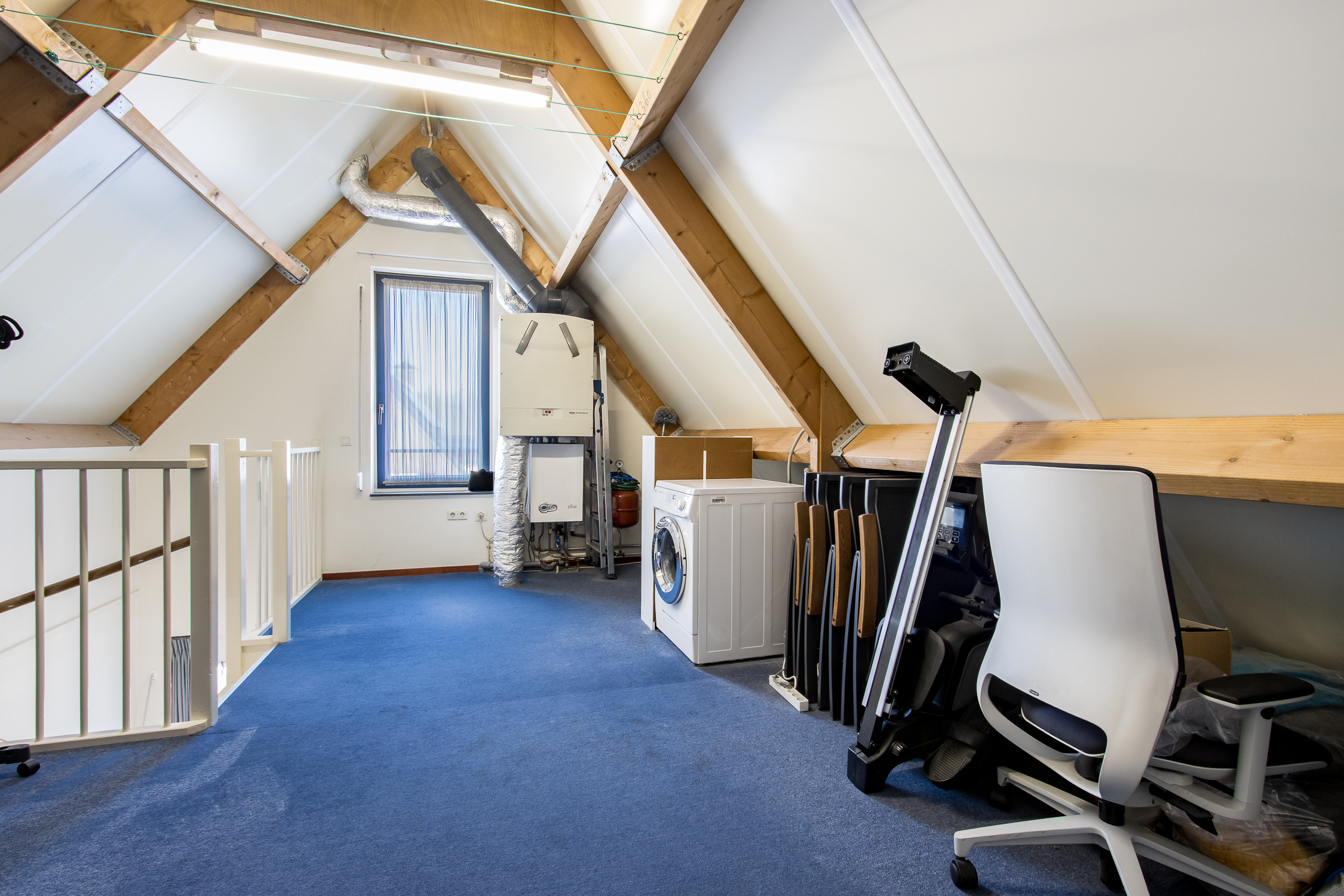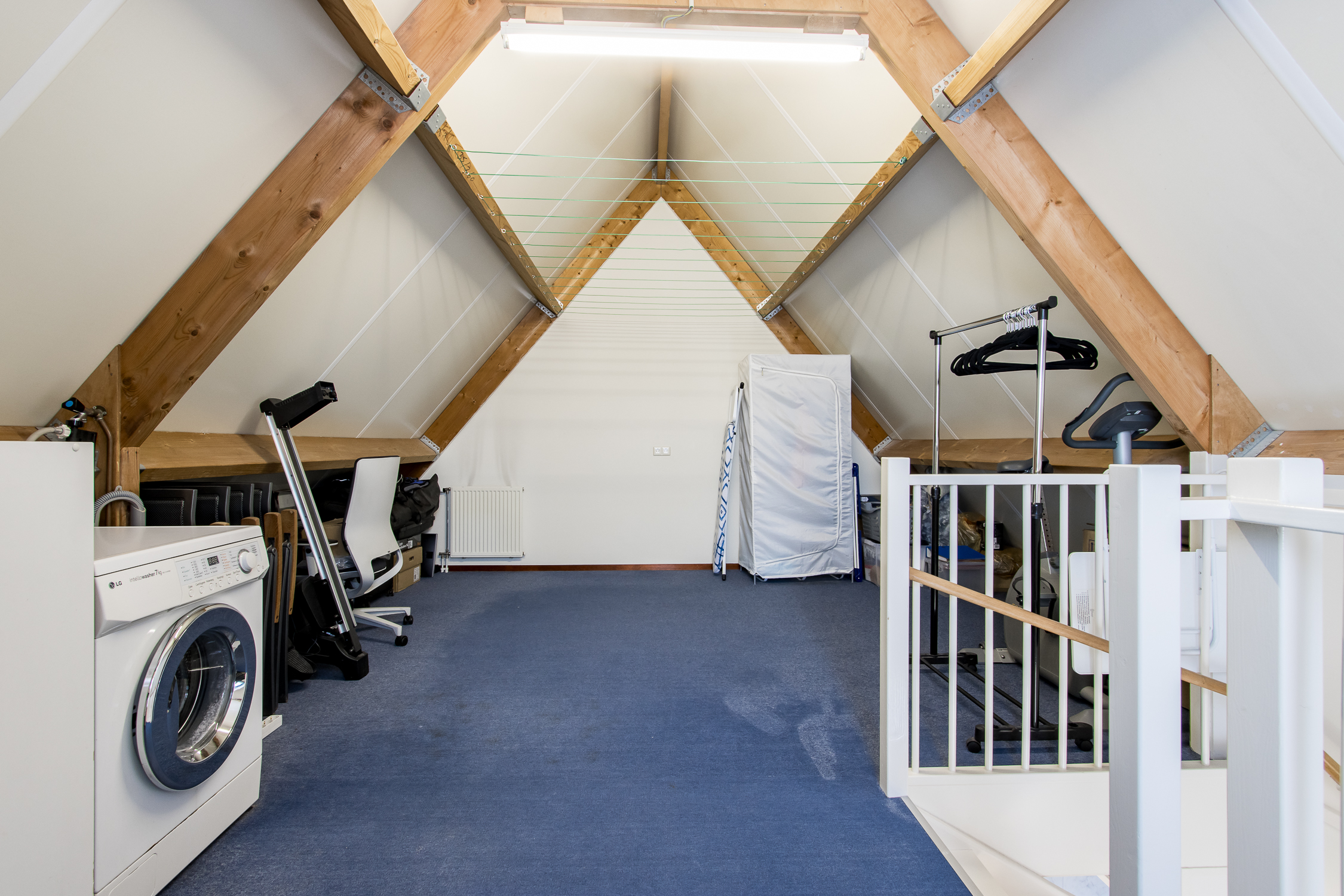 Tweede verdieping: een vaste trap brengt je naar de zolderverdieping, waar de cv-opstelling en aansluitingen voor de wasmachine en droger te vinden zijn. De ruime zolderkamer doet momenteel dienst als werkkamer en berging, maar biedt volop mogelijkheden om in te richten als extra slaap- of hobbykamer.