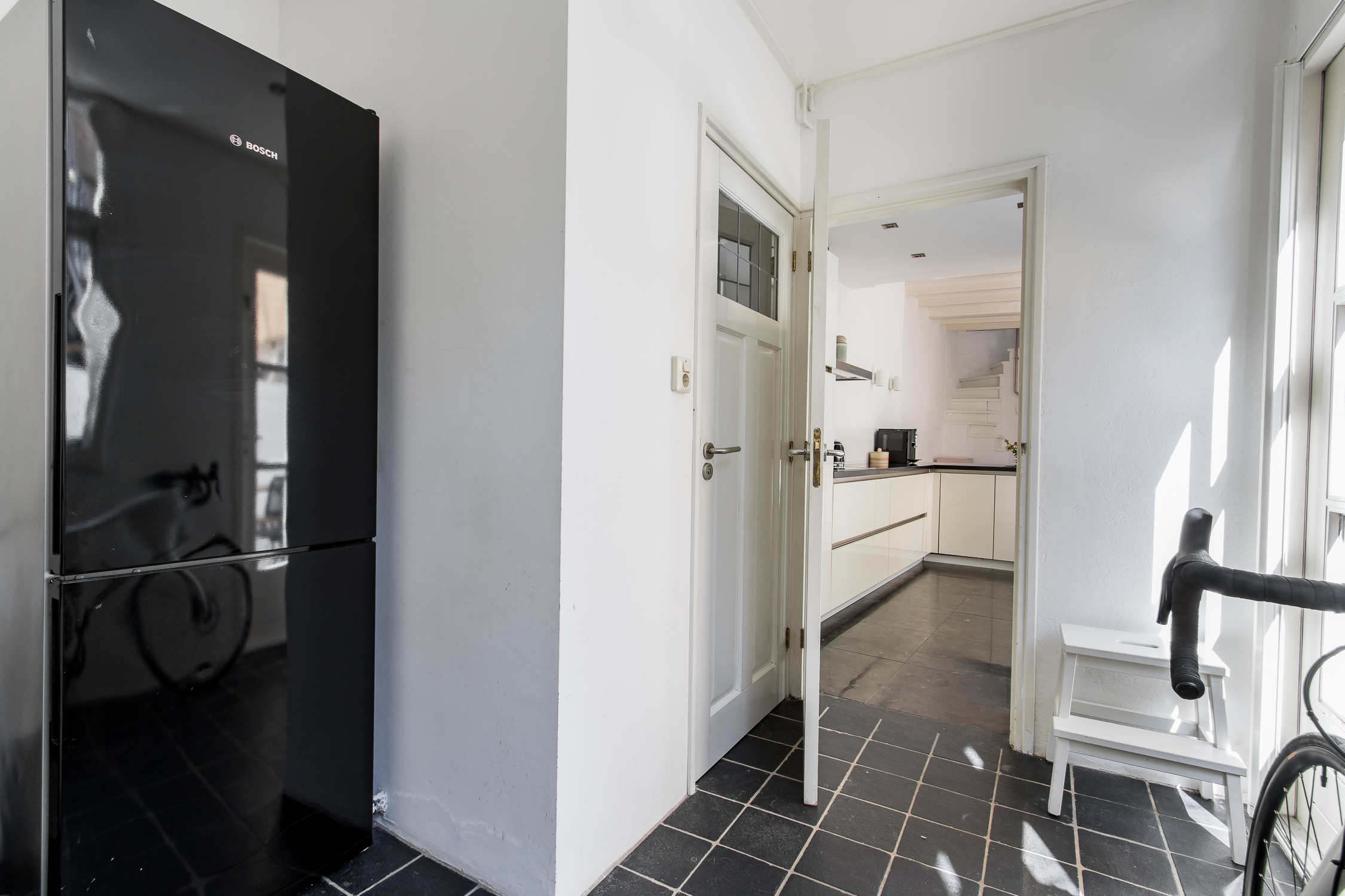 Indeling woning: via de fraaie hardhouten voordeur met glas-in-lood bovenlicht stap je de hoge entreehal binnen met doorkijk naar de leefruimte. In de woonkamer zorgt het bijna drie meter hoge balkenplafond voor een ruimtelijk gevoel en zorgt aan de voorzijde de geluidswerende pui voor veel lichtinval. De living staat in open verbinding met de strak vormgegeven keuken, voorzien van L-vormige keukenunit met greeploze witte lades en hoogwaardige inbouwapparatuur. Grenzend aan de keuken bevindt zich de praktische bijkeuken met toiletruimte en vaste kastenwand. Hier zijn de witgoedaansluitingen en de CV-ketel netjes weggewerkt. Via een klassieke buitendeur met roedeverdeling stap je de besloten binnenplaats op, gunstig gelegen op het zuidwesten.