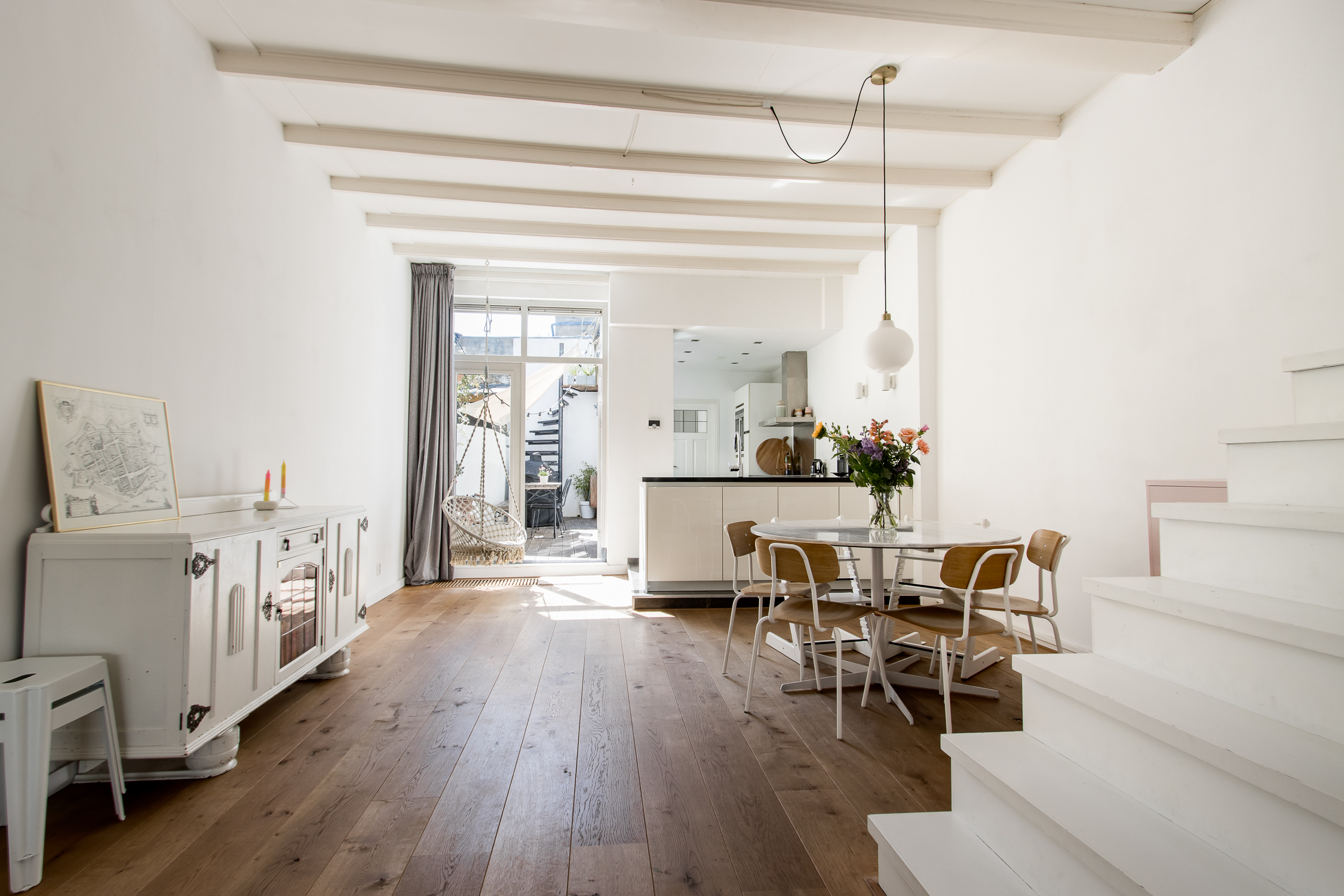 • in de woonkamer ligt een fraaie vloer met brede, eiken delen;