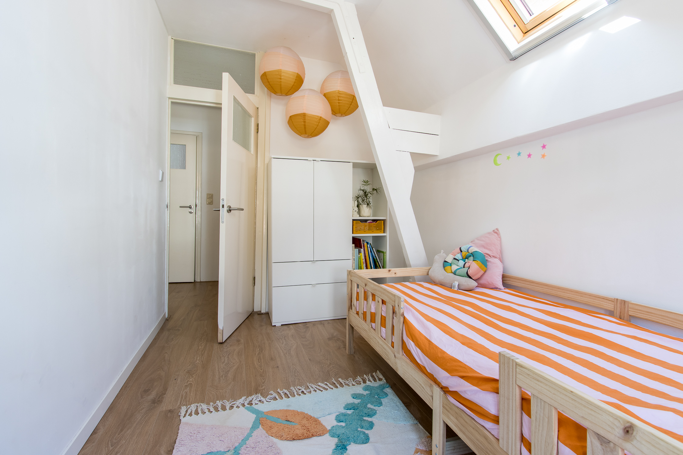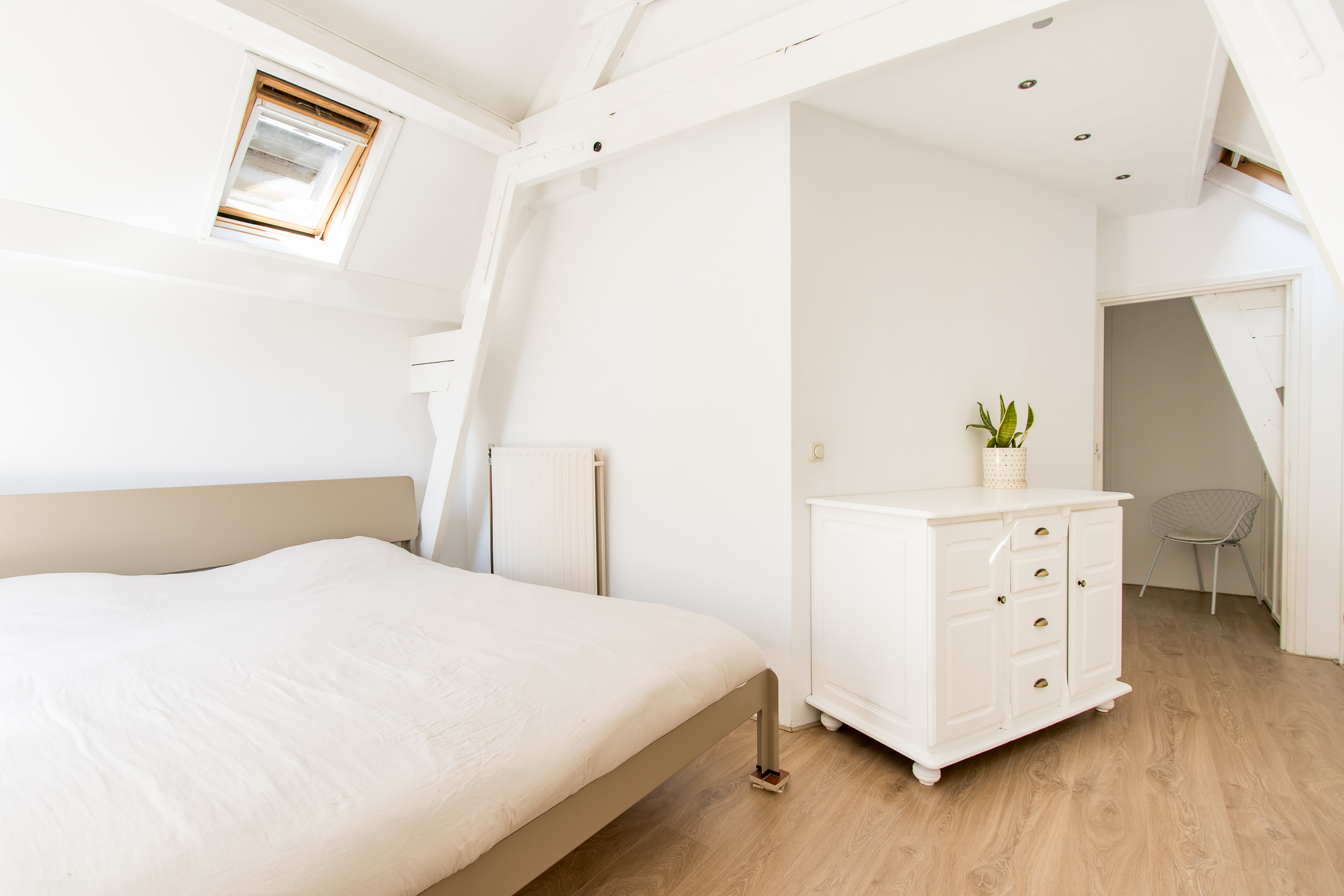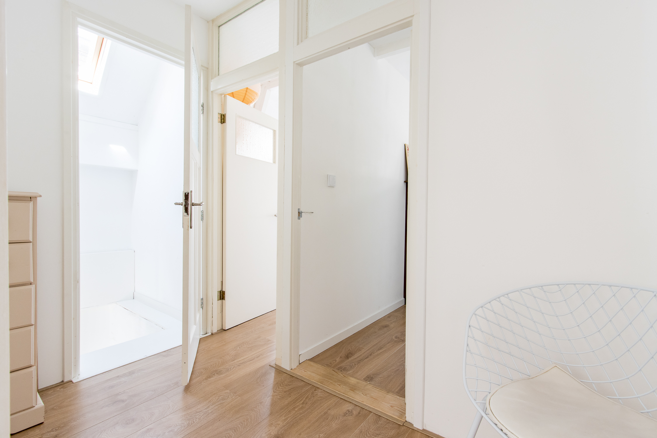 Eerste verdieping: de trapopgang in de woonkamer leidt naar de eerste verdieping. Hier geeft de overloop toegang tot een comfortabele badkamer en drie lichte slaapkamers. Aan de voorzijde zijn twee kamers gecreëerd, elk met karakteristieke glas-in-lood bovenlichten en Velux dakvensters die het ochtendlicht binnenlaten. De slaapkamer aan de achterzijde beschikt over ingebouwde wandkasten, drie dakramen en openslaande deuren naar het zonnige dakterras. De badkamer is modern en verzorgd afgewerkt met een inloopdouche, toilet en badkamermeubel. Dankzij het dakraam is er veel natuurlijk licht en ventilatie, naast de aanwezige mechanische ventilatie.