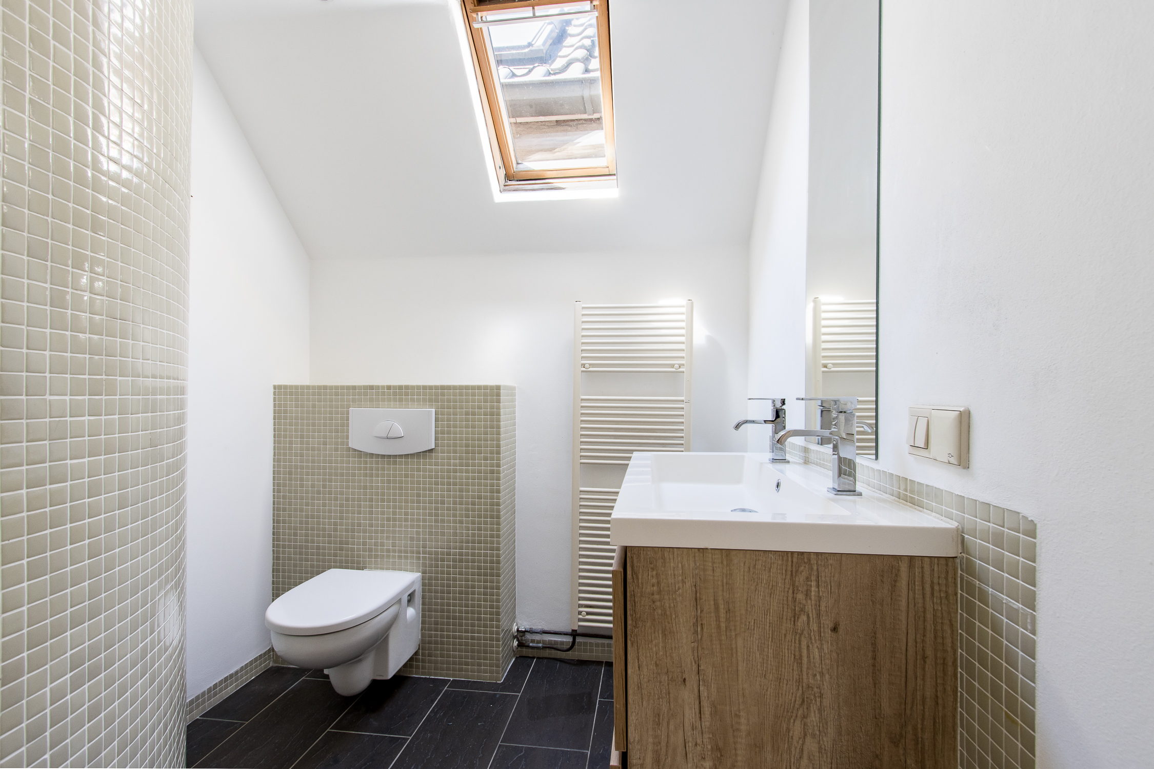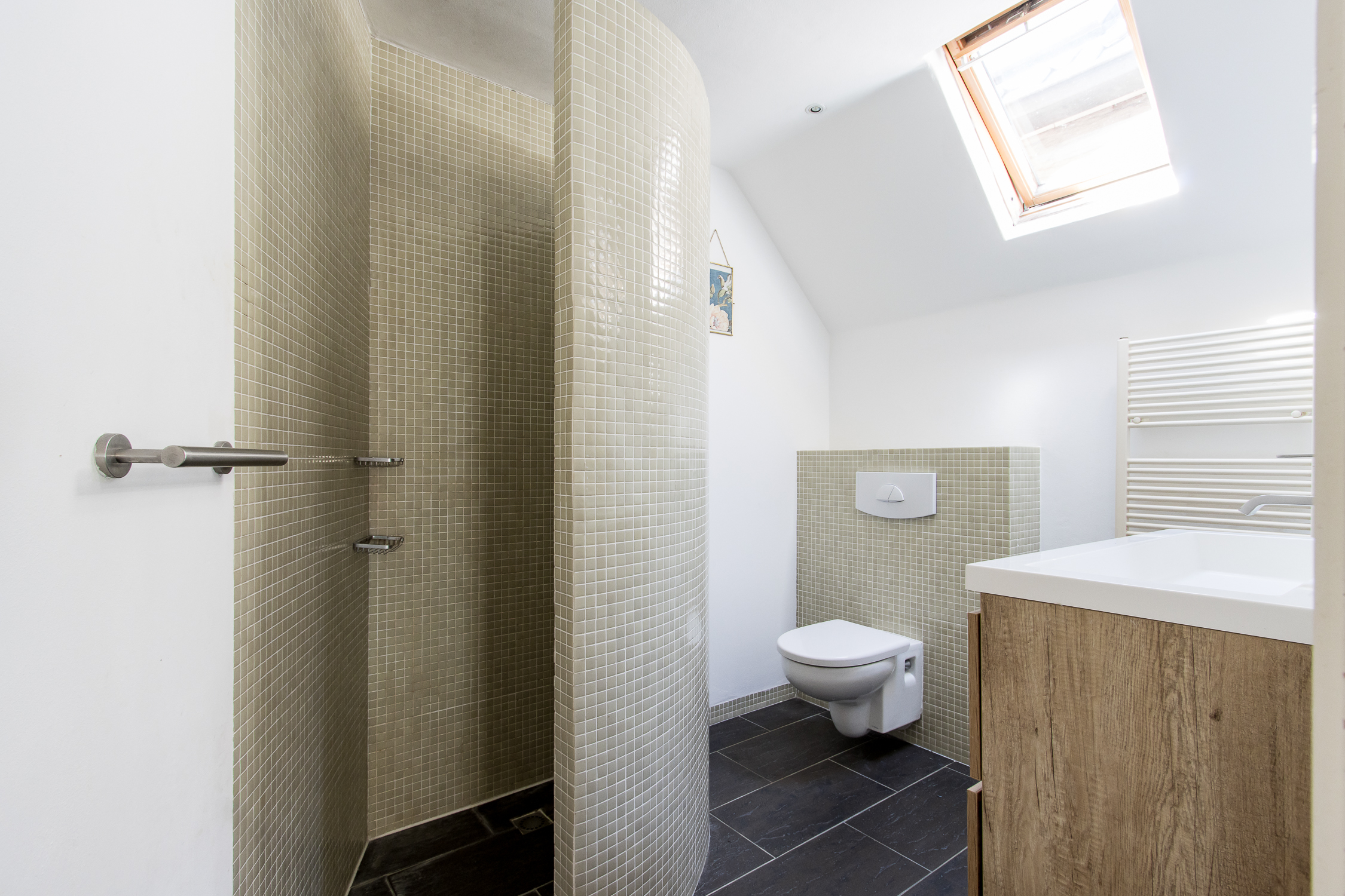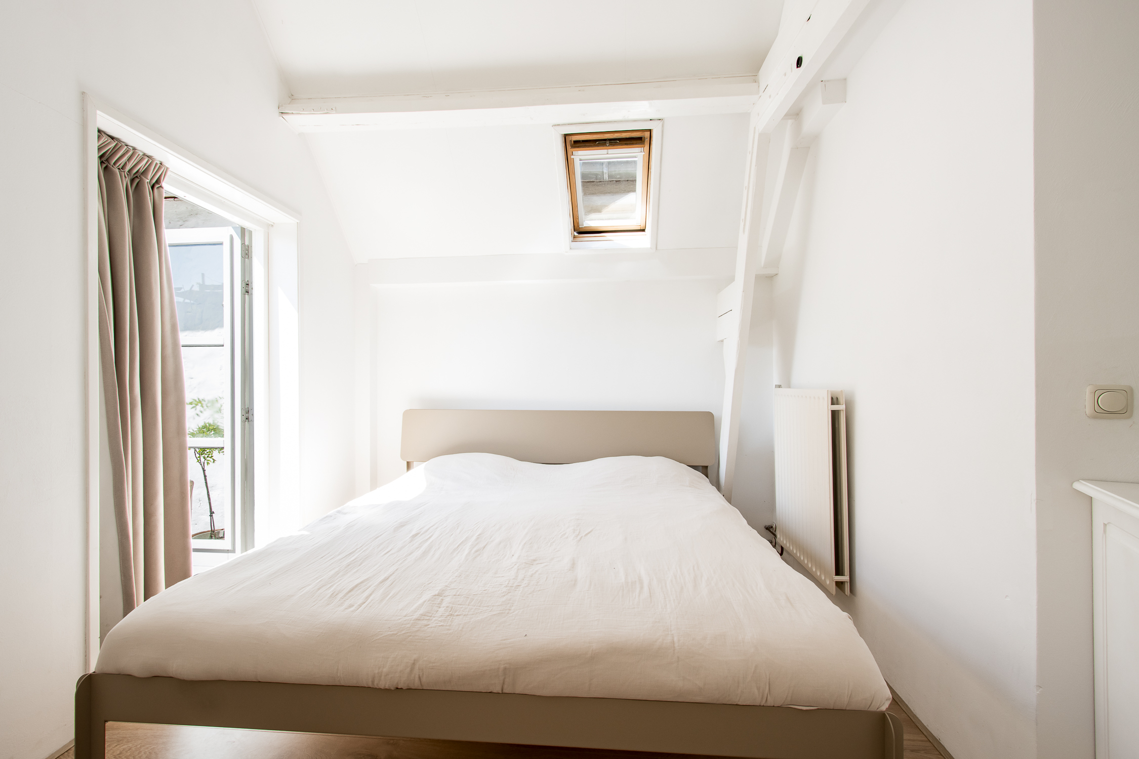 Eerste verdieping: de trapopgang in de woonkamer leidt naar de eerste verdieping. Hier geeft de overloop toegang tot een comfortabele badkamer en drie lichte slaapkamers. Aan de voorzijde zijn twee kamers gecreëerd, elk met karakteristieke glas-in-lood bovenlichten en Velux dakvensters die het ochtendlicht binnenlaten. De slaapkamer aan de achterzijde beschikt over ingebouwde wandkasten, drie dakramen en openslaande deuren naar het zonnige dakterras. De badkamer is modern en verzorgd afgewerkt met een inloopdouche, toilet en badkamermeubel. Dankzij het dakraam is er veel natuurlijk licht en ventilatie, naast de aanwezige mechanische ventilatie.