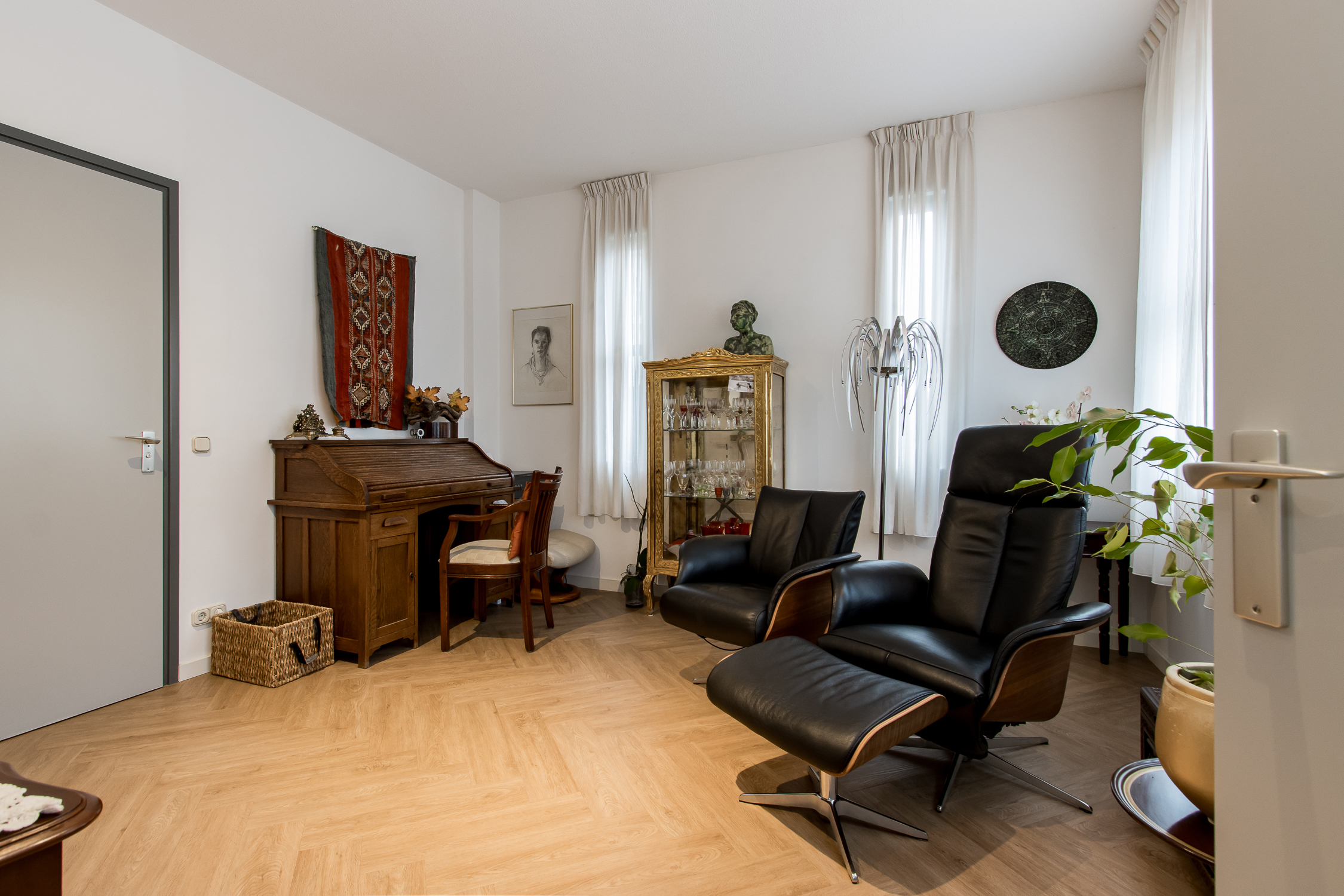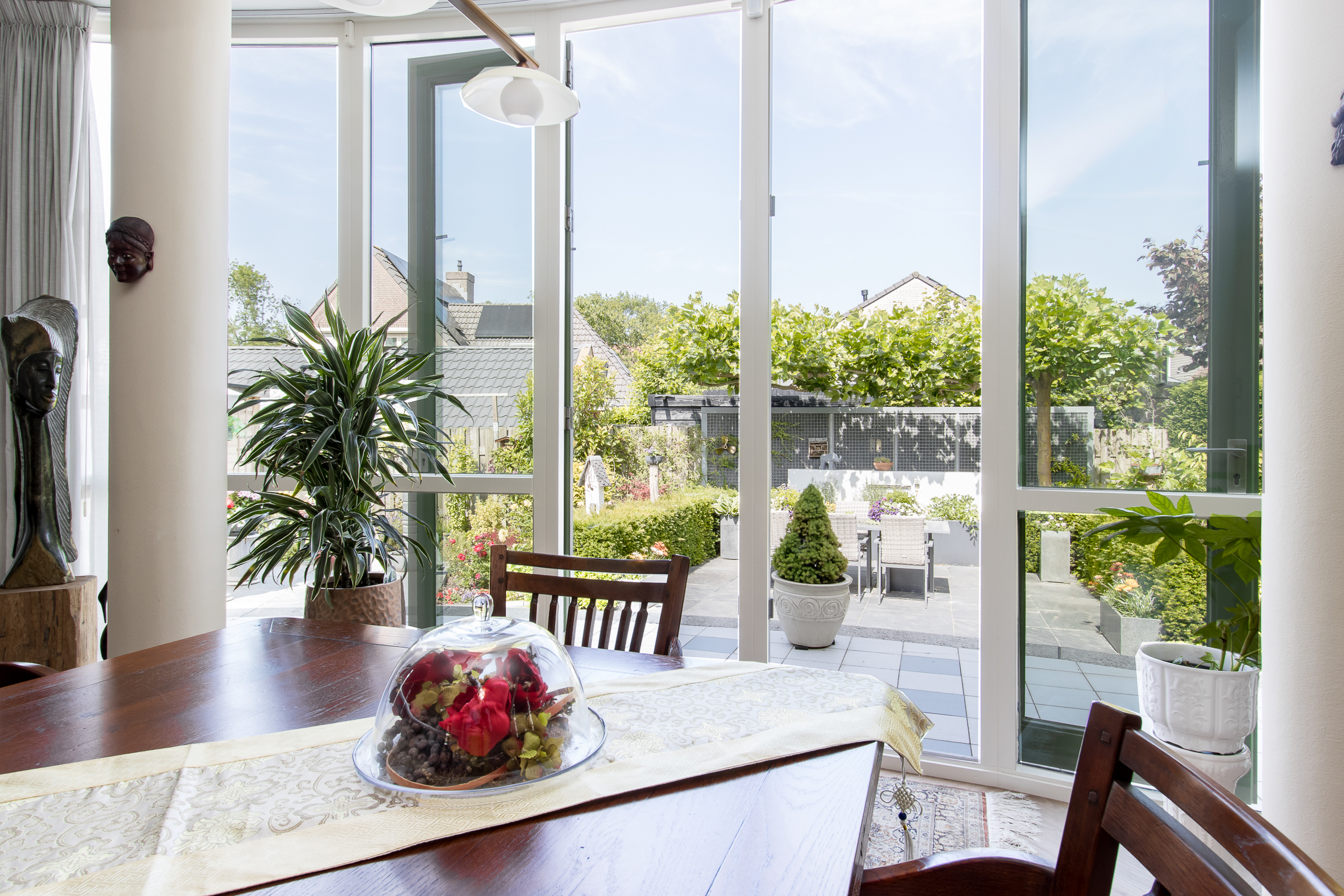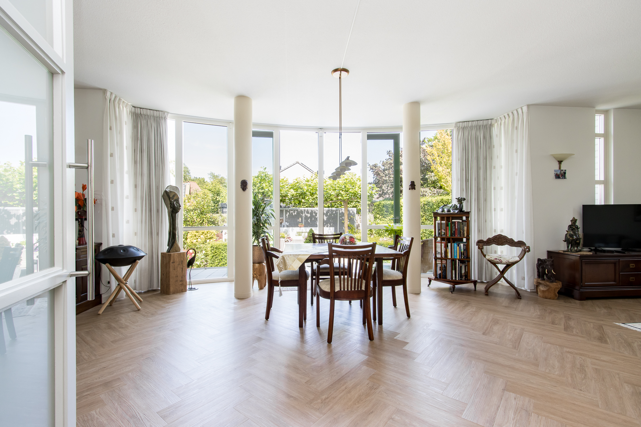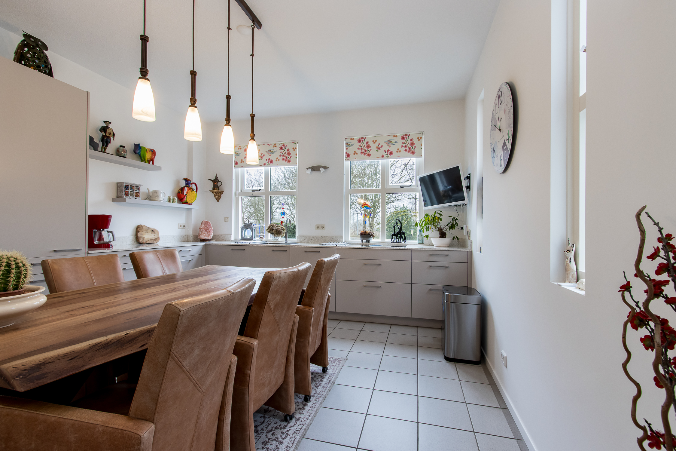 De lichte woonkamer is gelegen aan de achterzijde en biedt een prachtig uitzicht op de fraai aangelegde achtertuin. De woonkamer beschikt over een airco tevens verwarmingsunit van 2023. In voor-en najaar kan hiermee de kamer verwarmd worden maar ook in de winter als bijverwarming voldoet deze unit. Uiteraard kan de kamer ook goed gekoeld worden. Vanuit de woonkamer komt u via de bijkeuken met een tweede elektrische kookplaat en vaatwasser in de compleet ingerichte woonkeuken met vrij uitzicht. De keuken in hoekopstelling is uitgerust met diverse inbouwapparatuur zoals een Bora inductiekookplaat met geïntegreerde afzuiging, (stoom)oven, koelkast, vaatwasser en Quooker.
