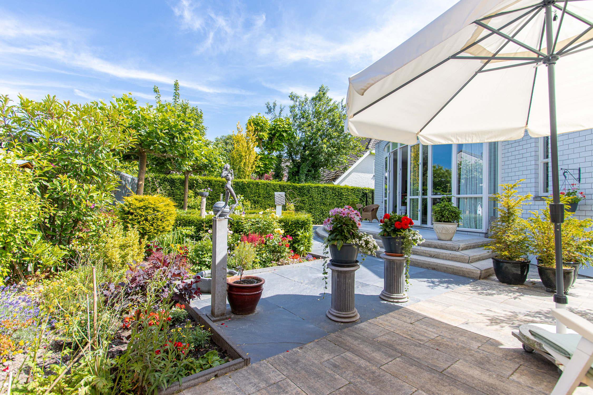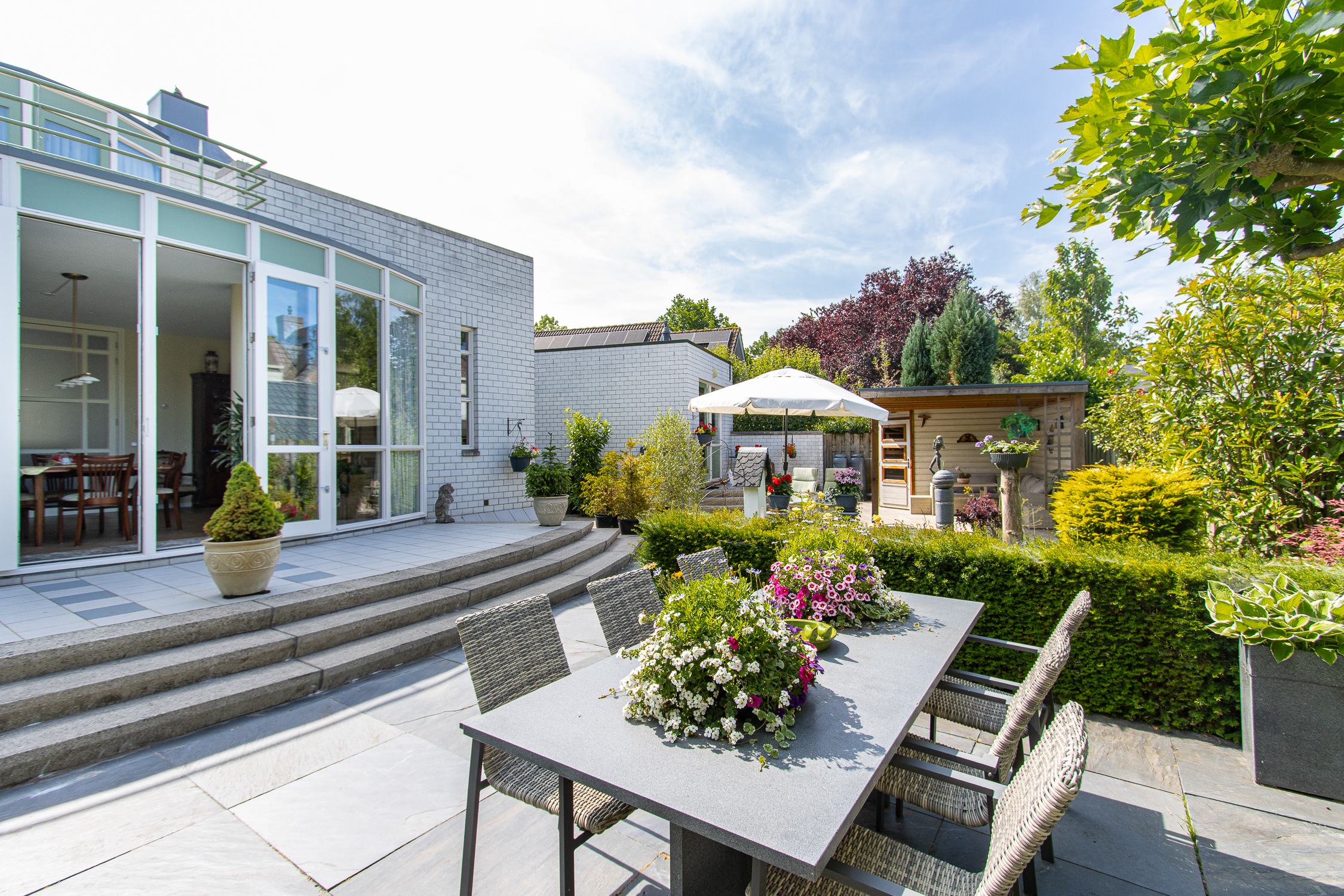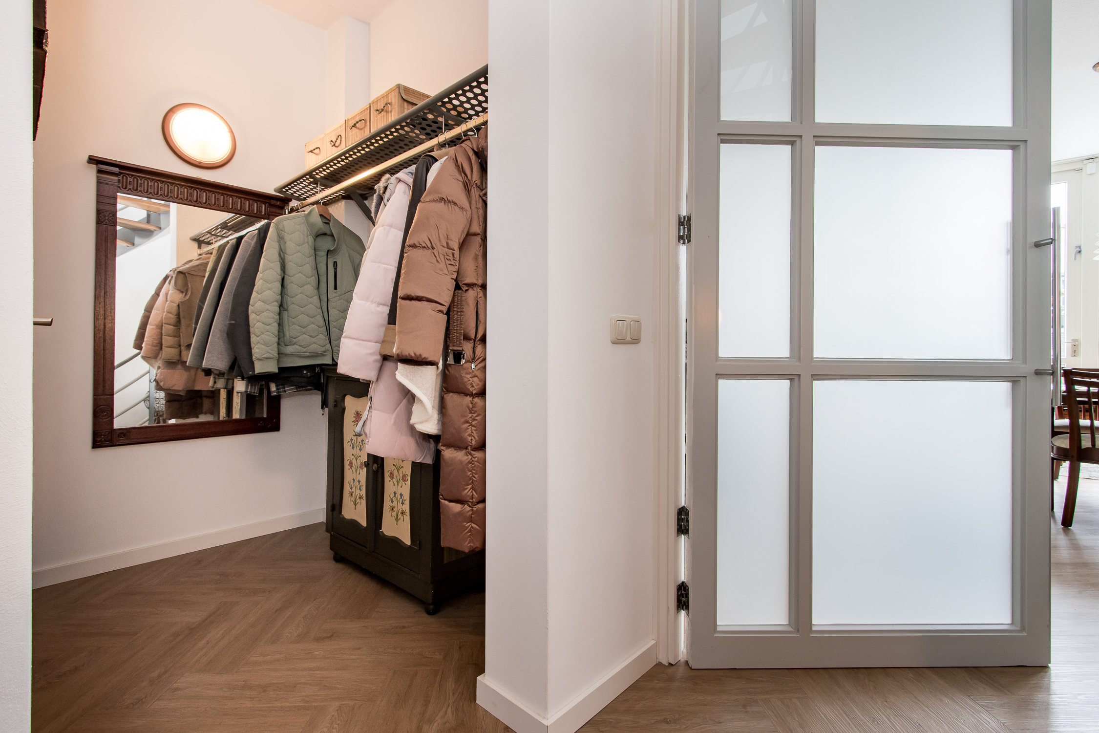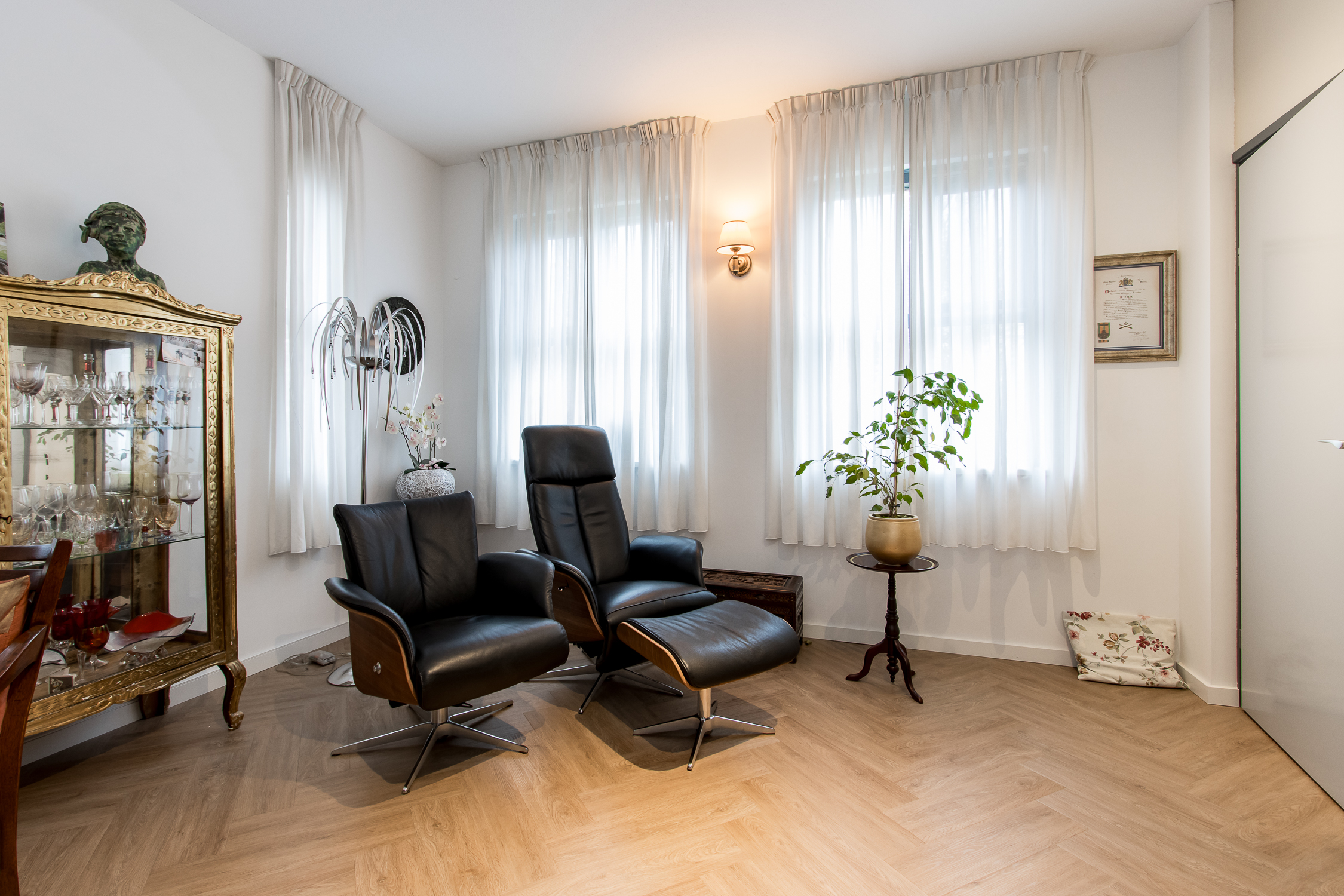 De lichte woonkamer is gelegen aan de achterzijde en biedt een prachtig uitzicht op de fraai aangelegde achtertuin. De woonkamer beschikt over een airco tevens verwarmingsunit van 2023. In voor-en najaar kan hiermee de kamer verwarmd worden maar ook in de winter als bijverwarming voldoet deze unit. Uiteraard kan de kamer ook goed gekoeld worden. Vanuit de woonkamer komt u via de bijkeuken met een tweede elektrische kookplaat en vaatwasser in de compleet ingerichte woonkeuken met vrij uitzicht. De keuken in hoekopstelling is uitgerust met diverse inbouwapparatuur zoals een Bora inductiekookplaat met geïntegreerde afzuiging, (stoom)oven, koelkast, vaatwasser en Quooker.