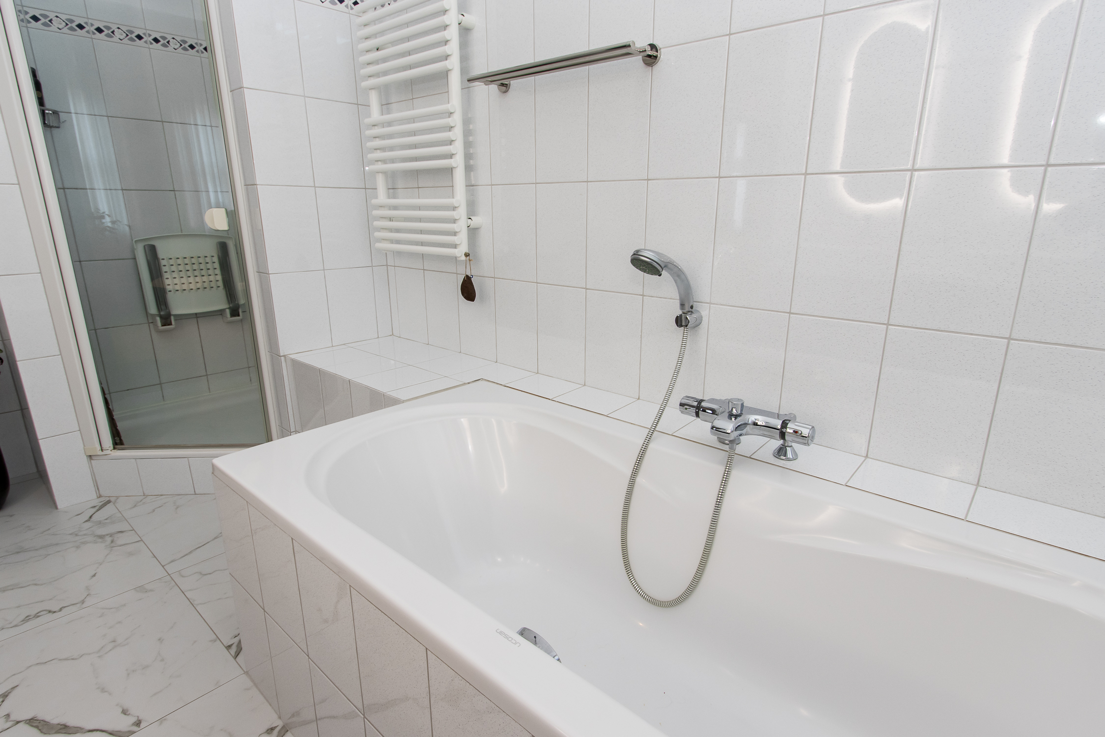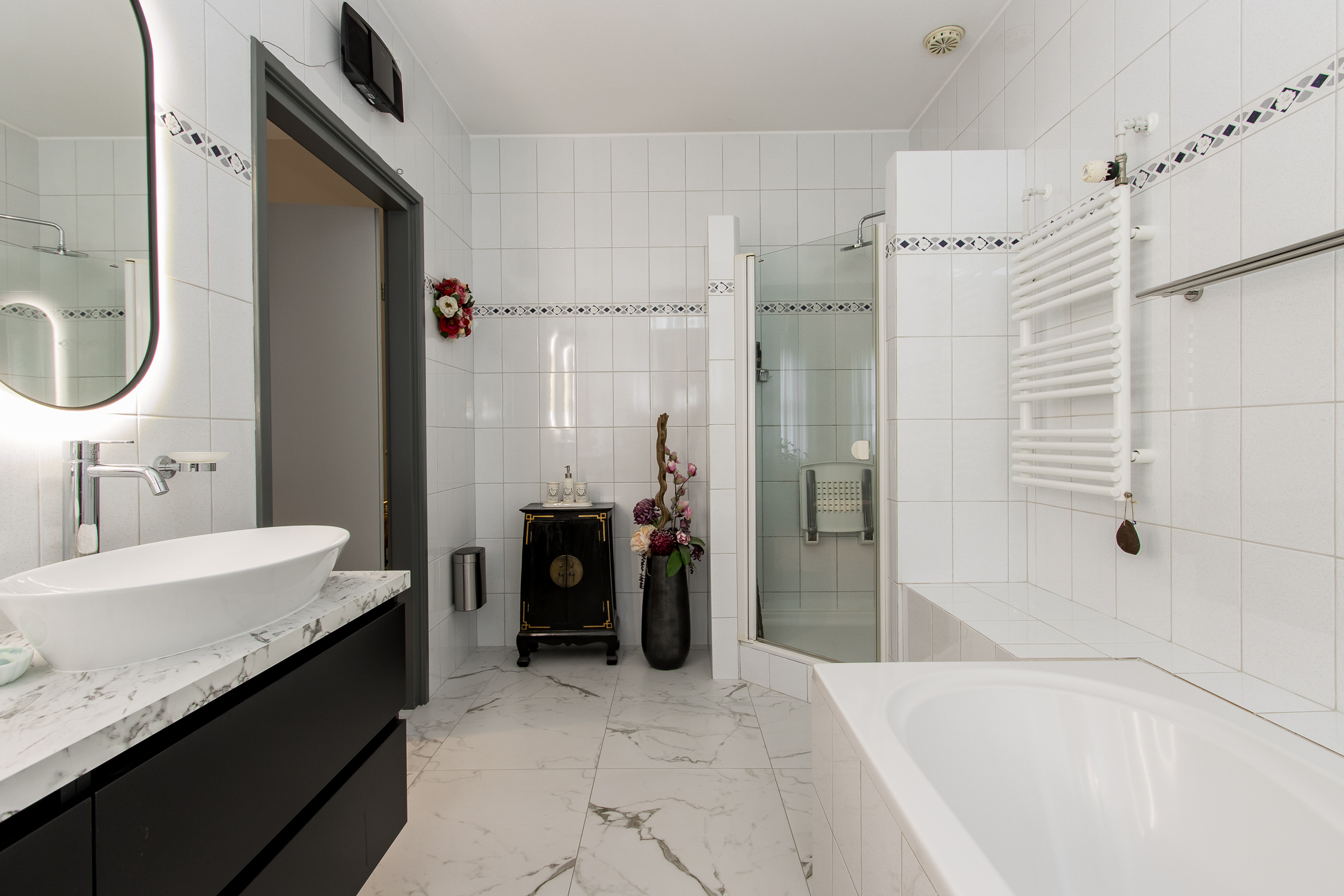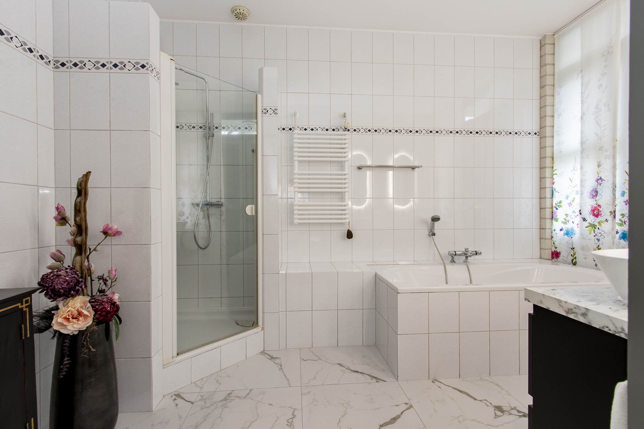 Indeling woning: via de overdekte entree komt u in de ruime, statige hal voorzien van een garderobe, meterkast, toiletruimte, trapopgang naar de eerste verdieping en keldertrap. Aan de voorzijde van de woning bevindt zich een royaal bemeten slaapkamer met een aangrenzende, fraai afgewerkte badkamer. Deze is uitgerust met een ligbad, douche en een stijlvol wastafelmeubel met dubbele waskom en LED-verlichte spiegels. Momenteel is de slaapkamer in gebruik als tv-kamer, maar deze multifunctionele ruimte biedt diverse mogelijkheden, waaronder wonen, werken of als gastenverblijf.