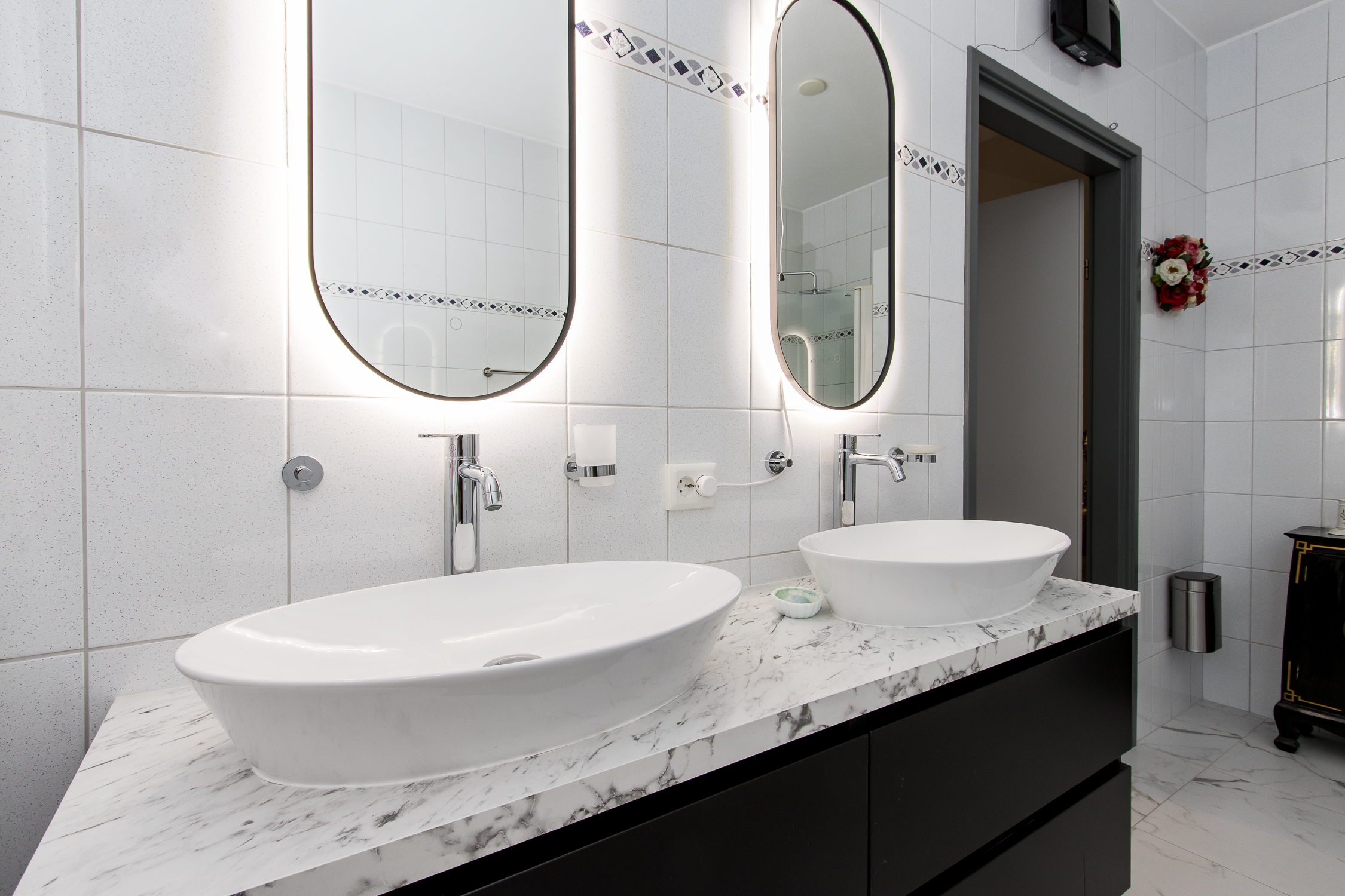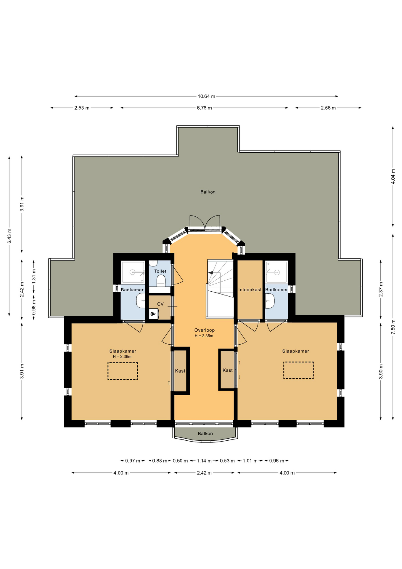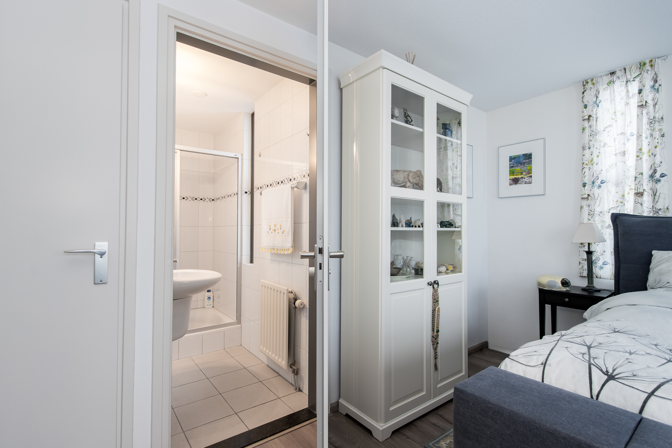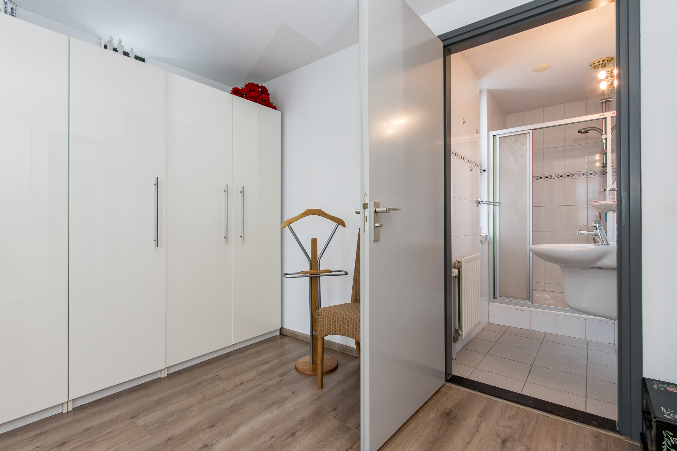 Op de eerste verdieping bevinden zich twee ruime slaapkamers, elk met een eigen badkamer met douche en wastafel. De beide slaapkamers hebben een ruime inbouwkast waarbij 1 slaapkamer nog een extra inloopkast heeft.