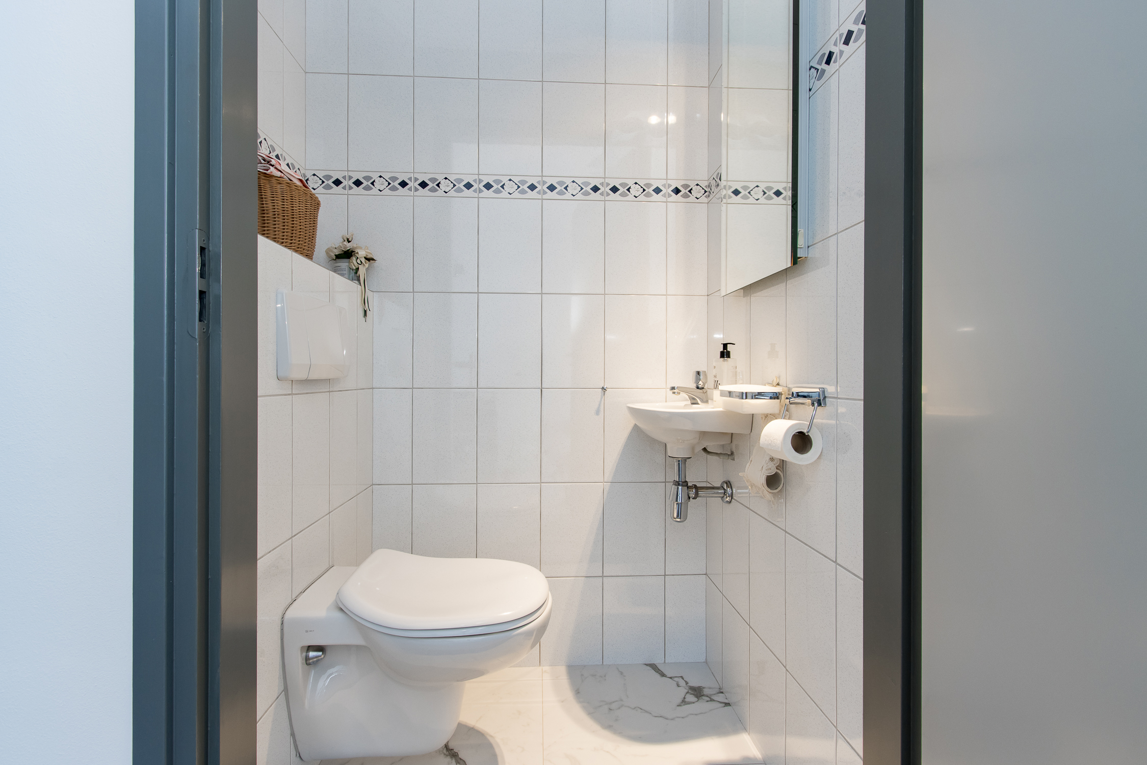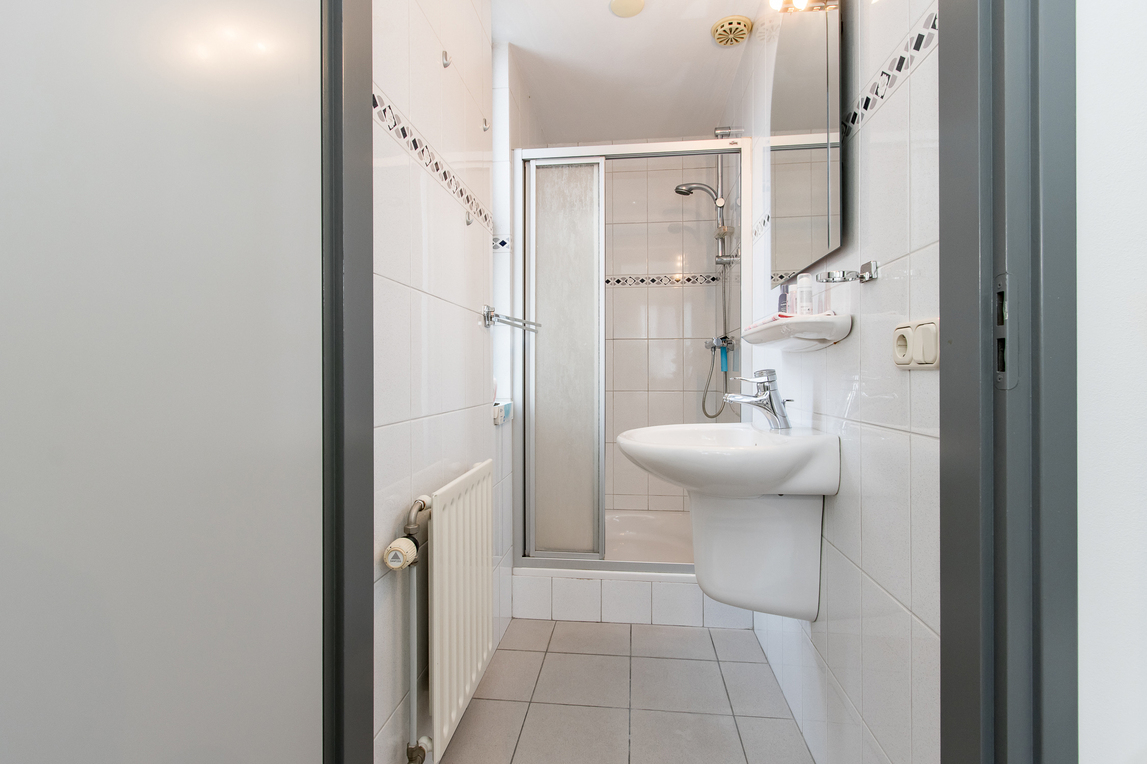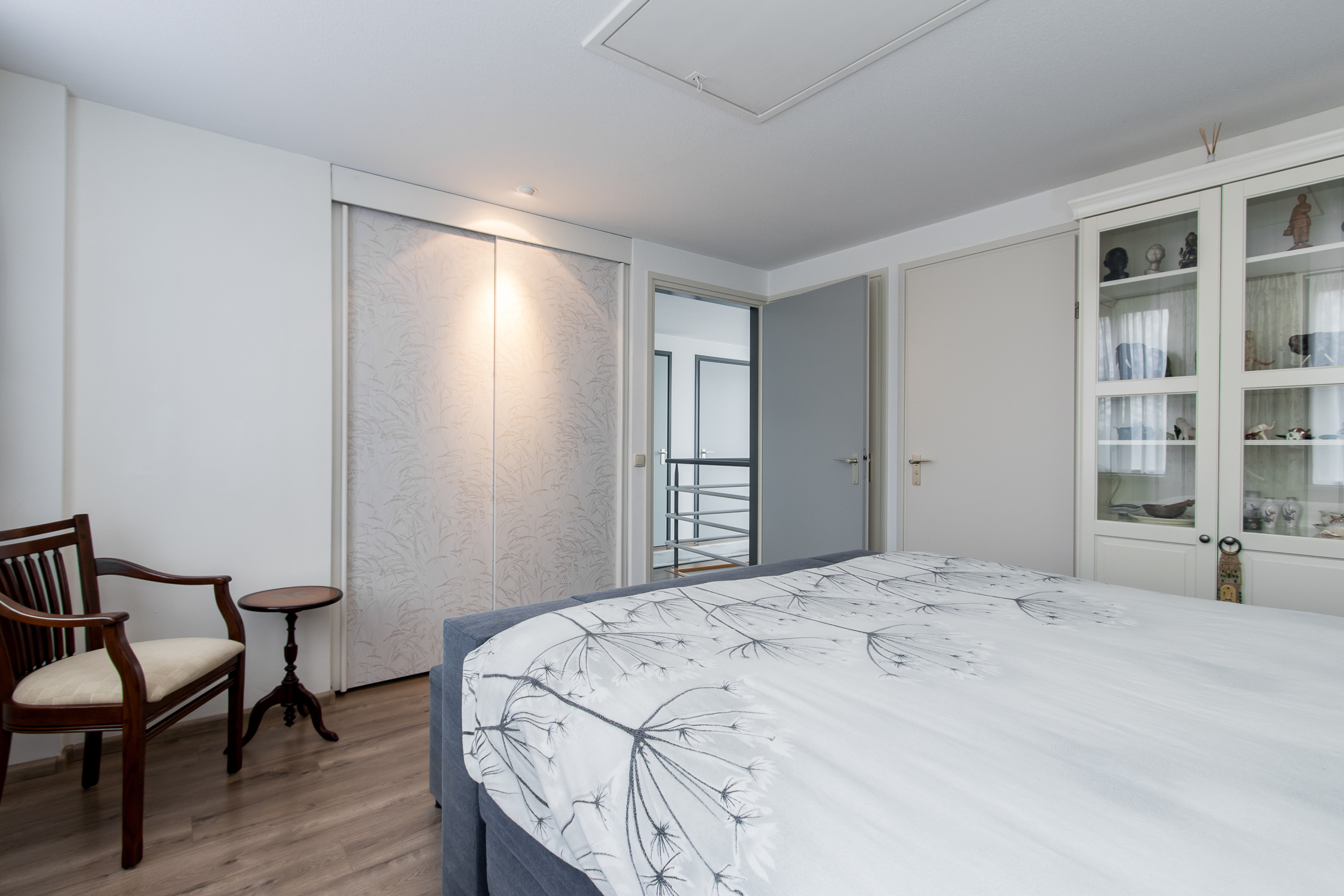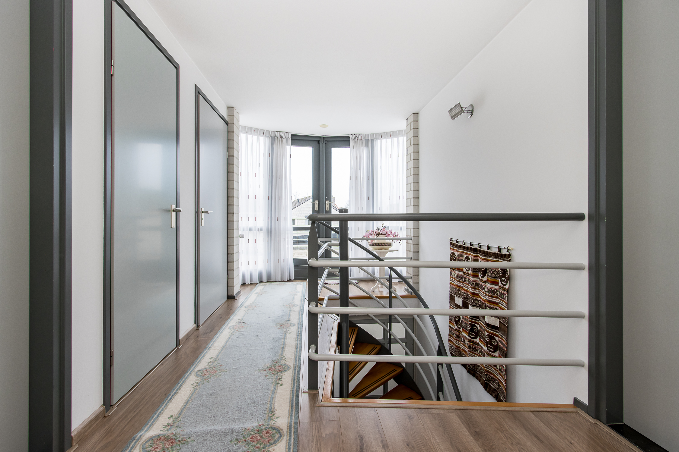 Eerste verdieping: de ruime overloop biedt toegang tot twee royale slaapkamers, elk met een eigen badkamer voorzien van een douche en wastafel. Daarnaast bevindt zich op de overloop een separaat toilet en een bergkast waarin zich ook de elektrische boiler bevindt. De voorzijde is uitgerust met een balkon en aan de achterzijde leiden openslaande deuren naar het riante dakterras.