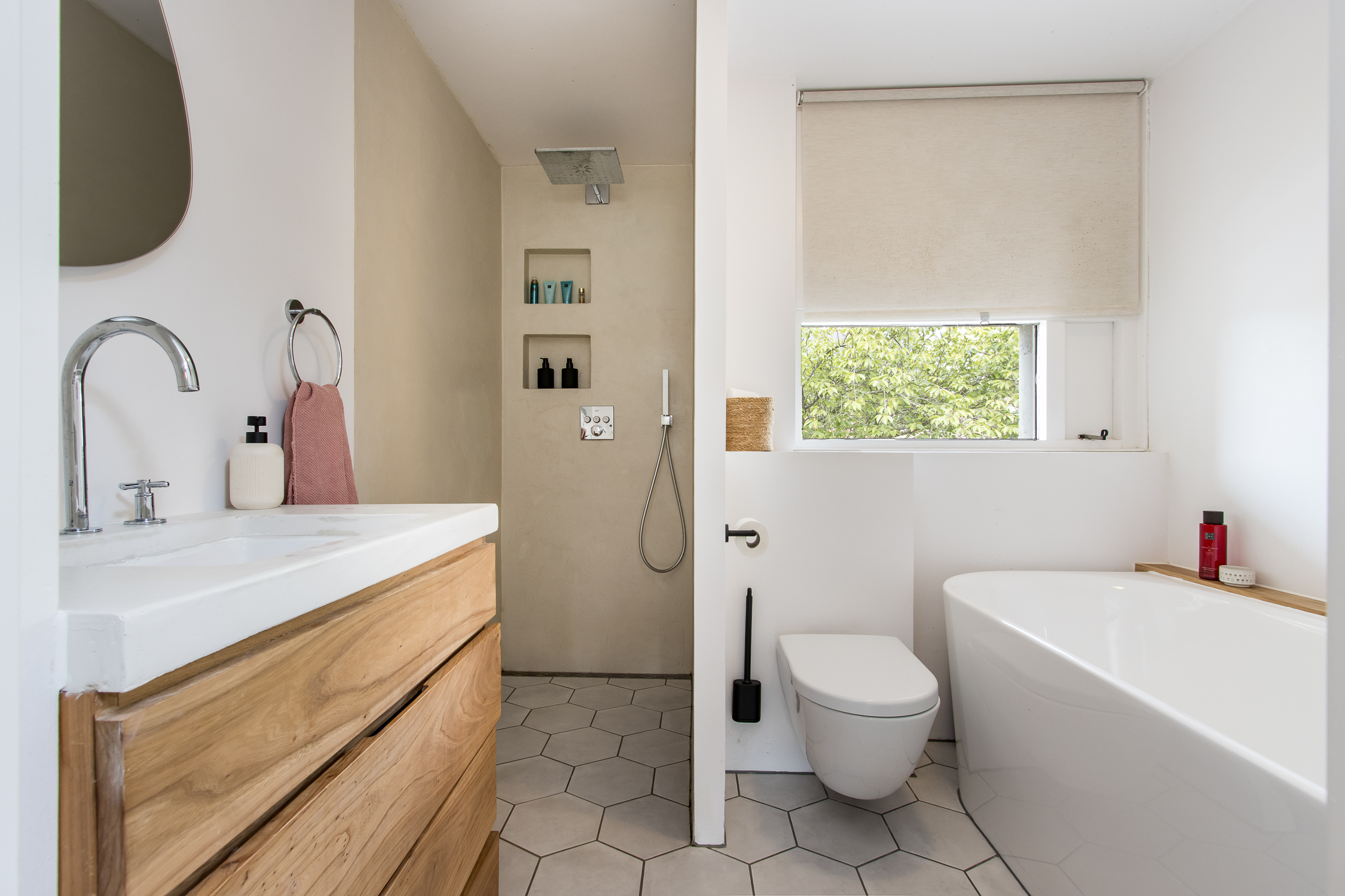 Eerste verdieping: de overloop biedt toegang tot drie goed bemeten slaapkamers en de moderne badkamer. Deze is ingericht met een ligbad, een ruime inloopdouche, een wandcloset en een stijlvol badkamermeubel met wastafel.