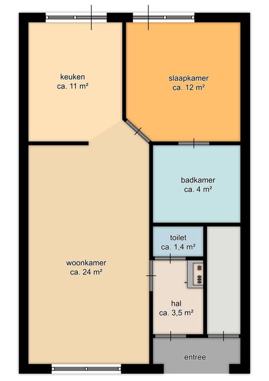 Het appartement beschikt over een open keuken, woonkamer, één slaapkamer, badkamer en apart toilet.