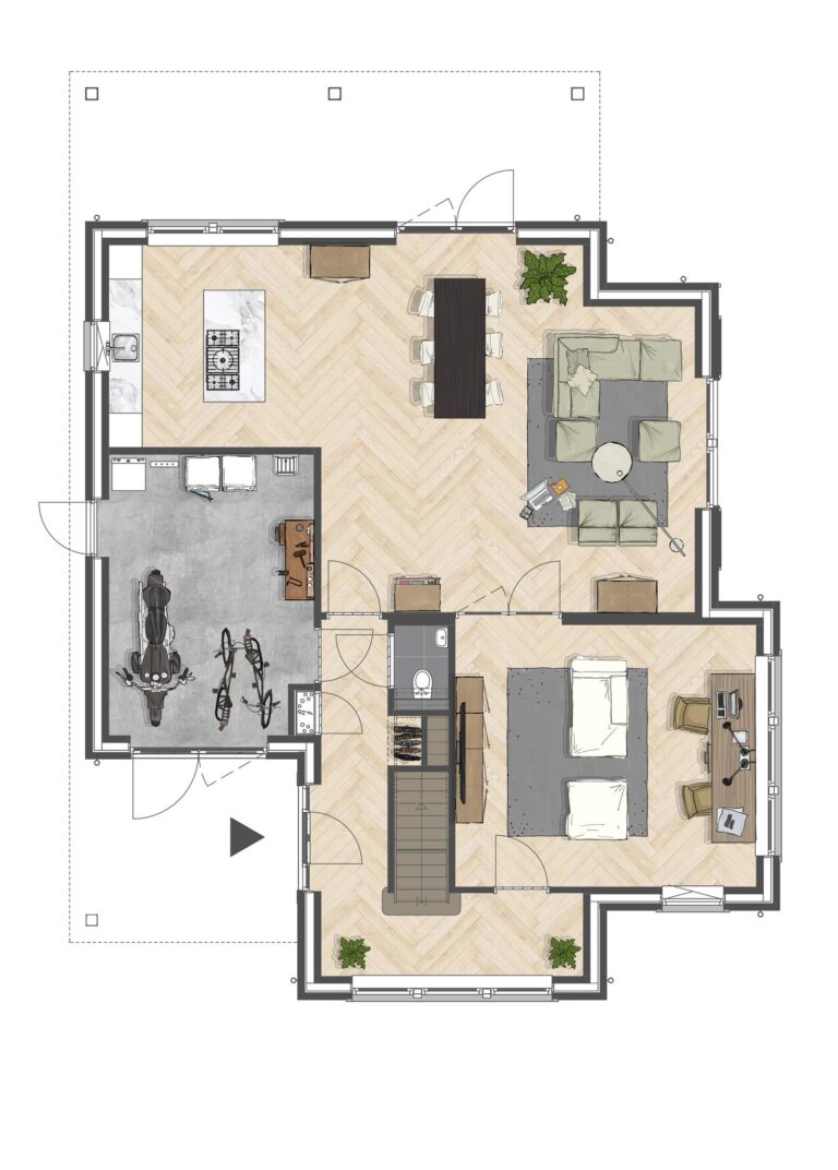 Begane grond: via de karakteristieke Virieusingel bereikt u de villa. Via de zijentree komt u in de ontvangsthal met toiletruimte en trapopgang naar de eerste verdieping. De hal biedt toegang tot het kantoor en de royale living met open keuken waar een directe verbinding is naar de royale tuin.