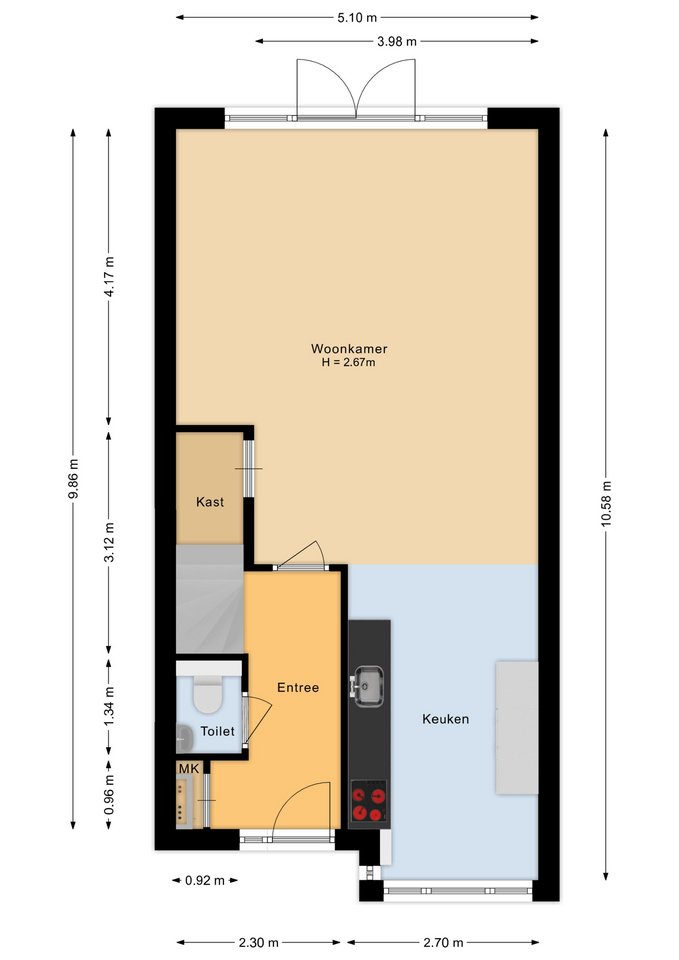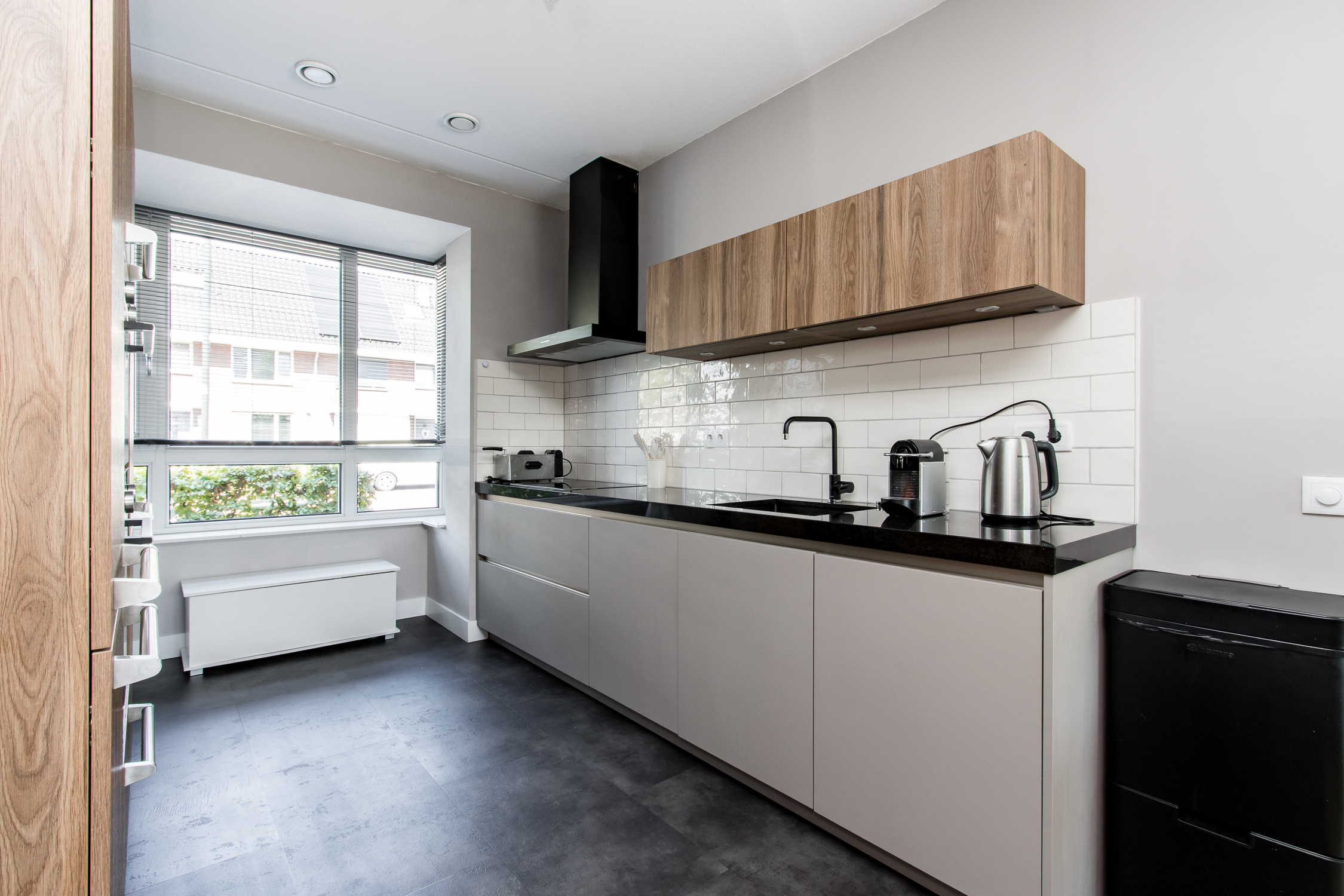 Indeling woonhuis: aan de voorzijde van de woning is de entree gesitueerd. In de hal bevindt zich de meterkast, toiletruimte en de trapopgang naar verdieping. De hal geeft toegang tot de tuingerichte woonkamer met open keuken. De moderne keuken is voorzien van diverse inbouwapparatuur waaronder een koelkast, inductie kookplaat, afzuigkap, combioven en vaatwasser. Openslaande deuren geven toegang tot de achtertuin.