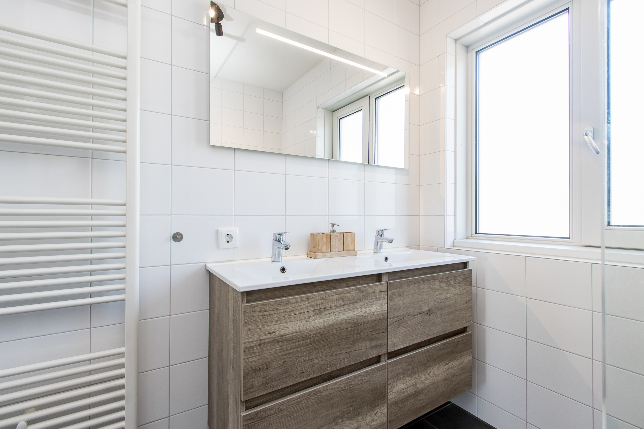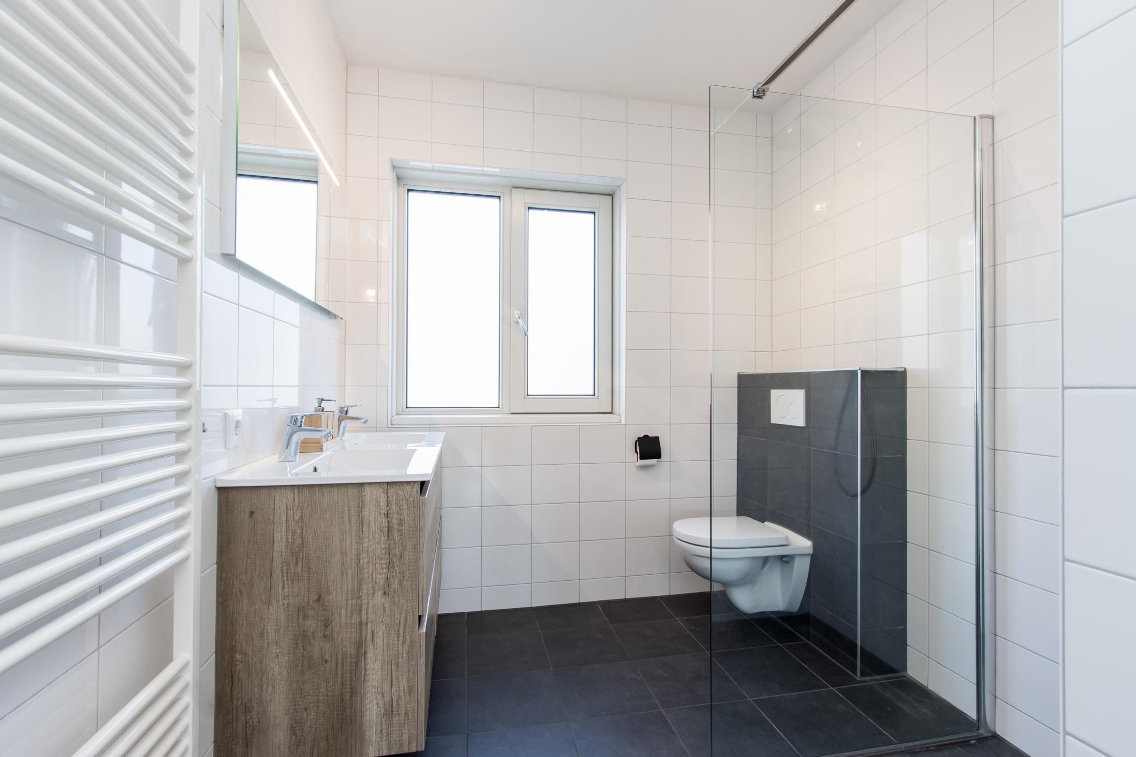 Eerste verdieping: de overloop leidt naar drie slaapkamers en moderne badkamer met inloopdouche, wastafelmeubel, wandcloset en designradiator.