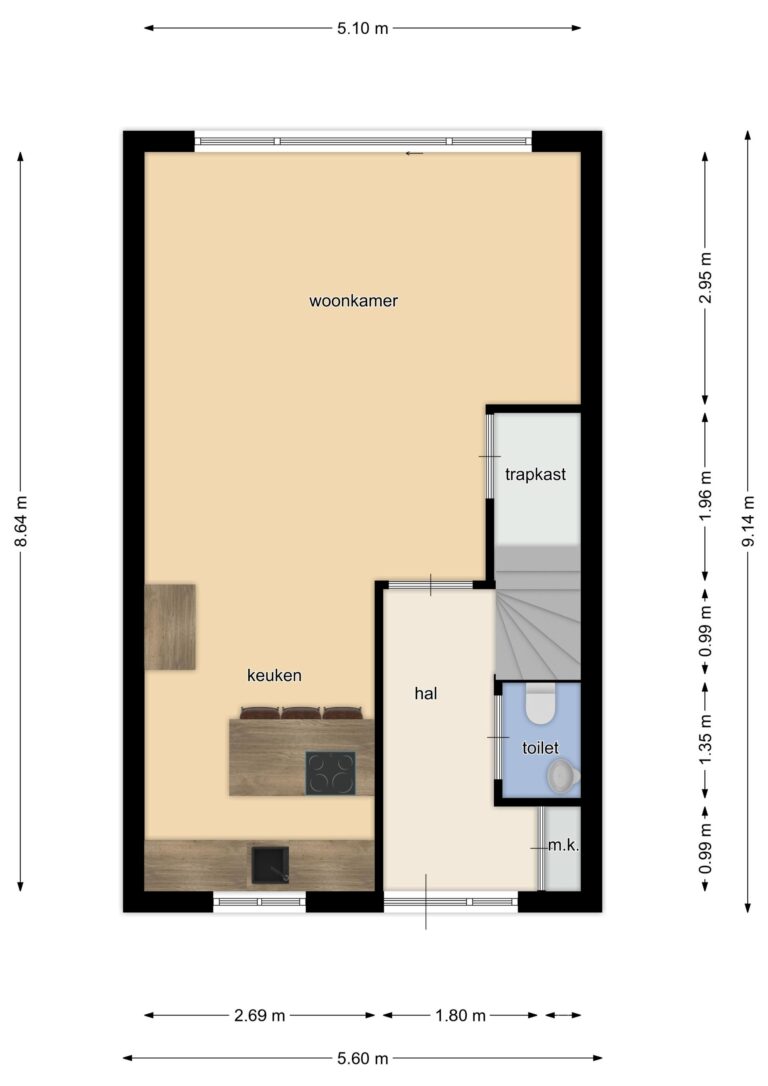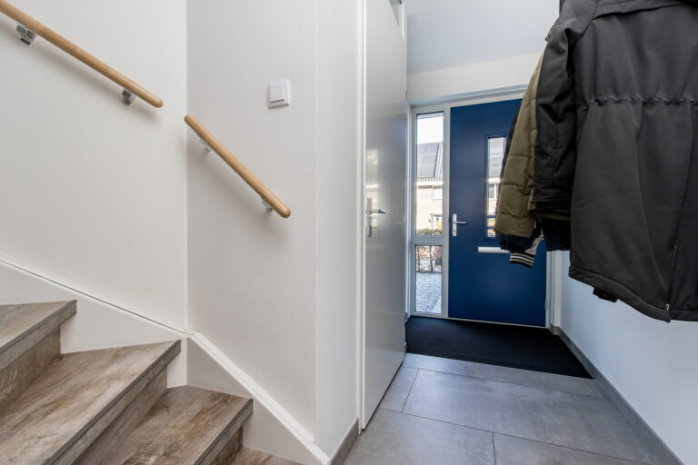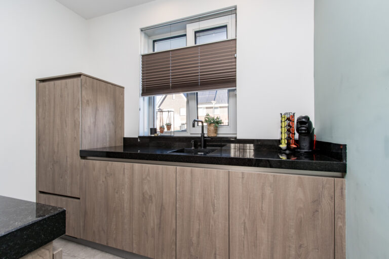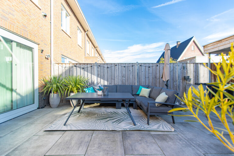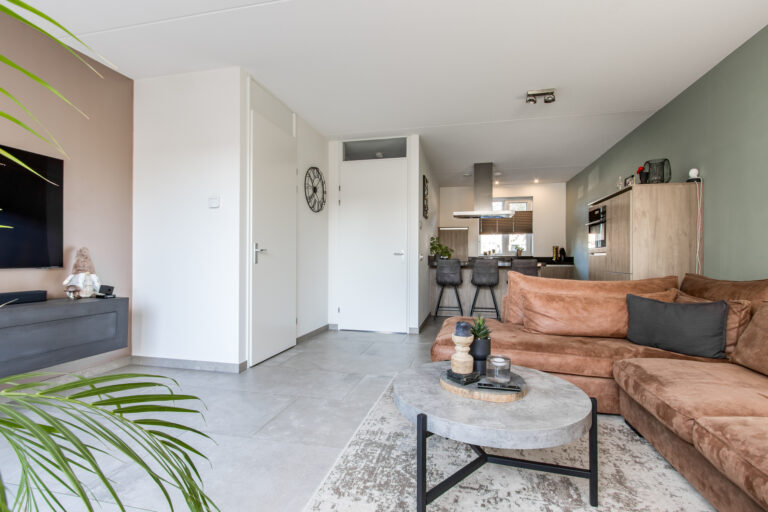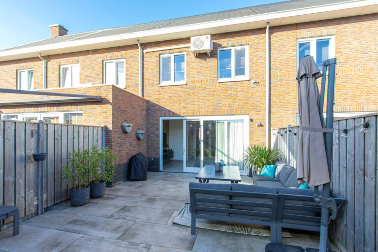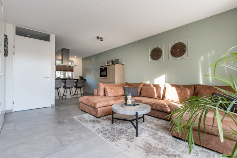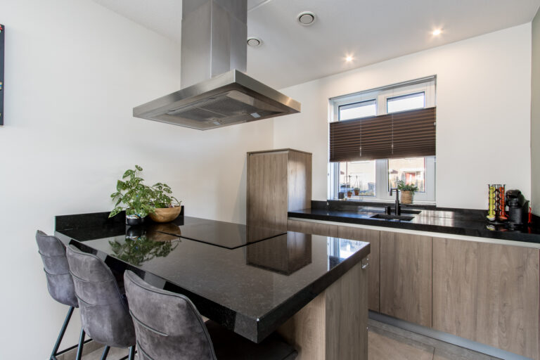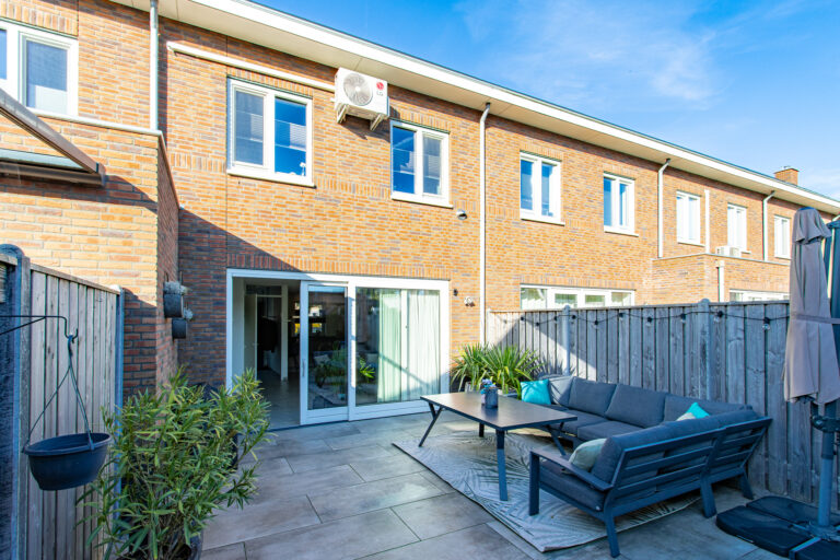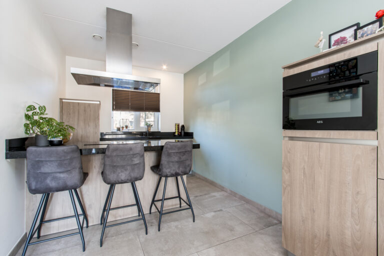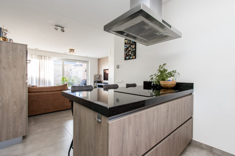 Indeling van de woning: bij binnenkomst stap je in de hal met meterkast, toilet en trap naar de eerste verdieping. Vanuit de hal loop je de lichte woonkamer in, die overgaat in de moderne open keuken. De keuken is voorzien van een kookeiland en diverse inbouwapparatuur, waaronder een koelkast, inductiekookplaat, afzuigkap, combi-oven, vaatwasser en Quooker. Via de schuifpui heb je direct toegang tot de zonnige achtertuin.