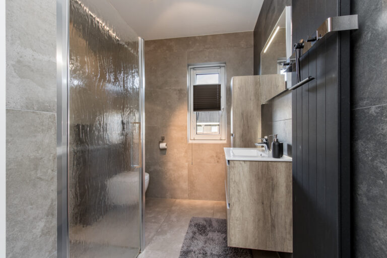 Eerste verdieping: op de eerste verdieping geeft de overloop toegang tot twee ruime slaapkamers en de moderne badkamer met douche, wastafelmeubel, wandcloset en designradiator.