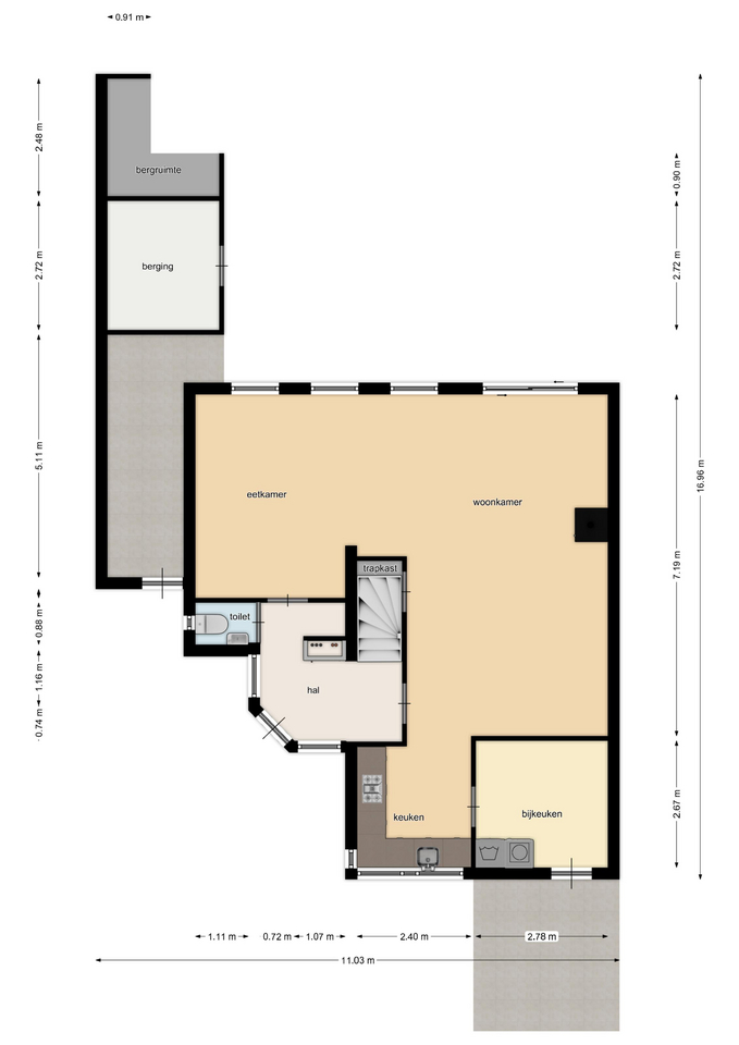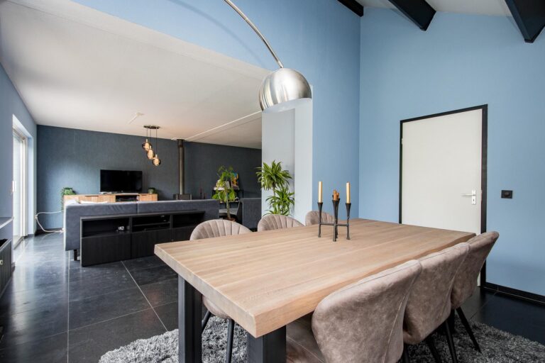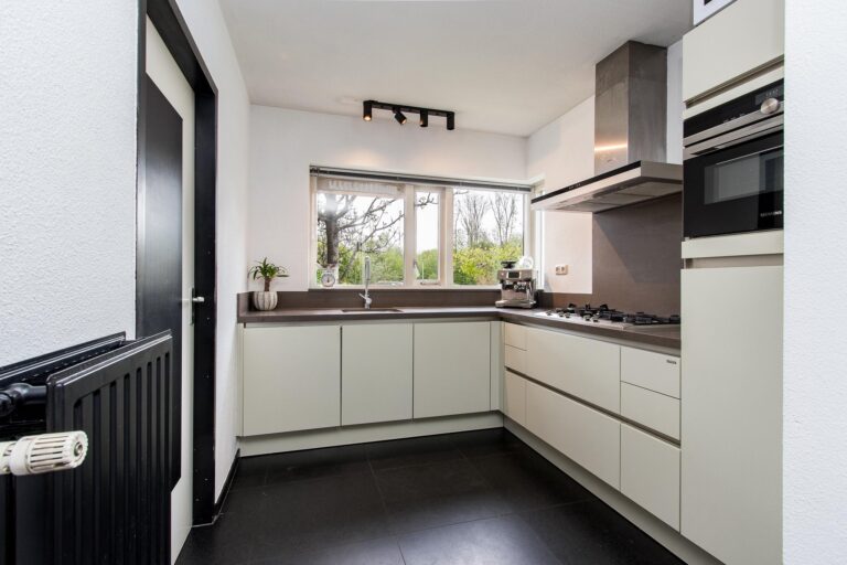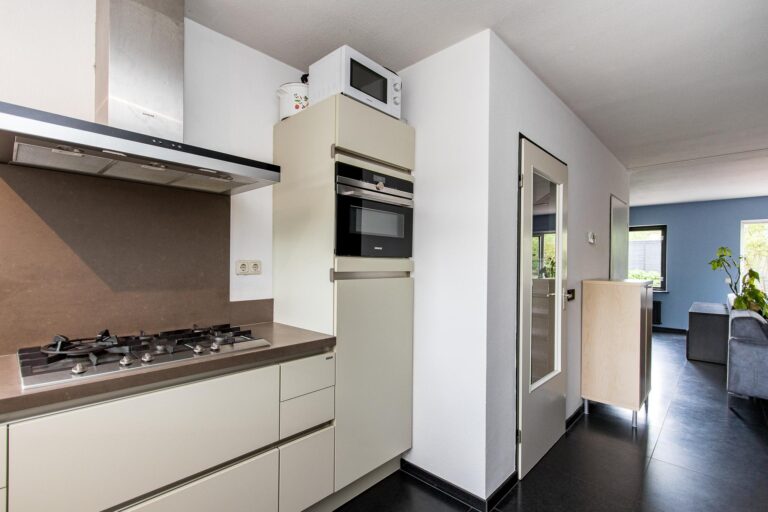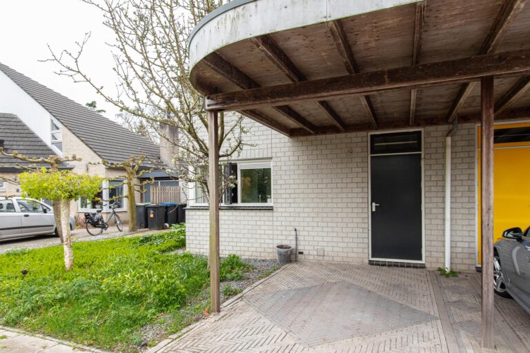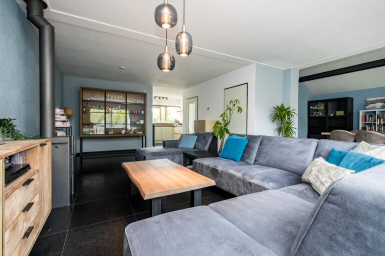 Indeling woonhuis: de entree bevindt zich aan de linker voorzijde van de woning. In de hal bevinden zich de meterkast, toiletruimte en trapopgang naar de eerste verdieping. De hal geeft toegang tot de royale woonkamer met sfeervolle houtkachel (ter overname) en schuifpui met directe toegang tot het terras. De woonkamer staat in halfopen verbinding met de moderne keuken voorzien van diverse inbouwapparatuur. Aansluitend bevindt zich de bijkeuken met aansluitingen voor het witgoed en loopdeur naar de carport.