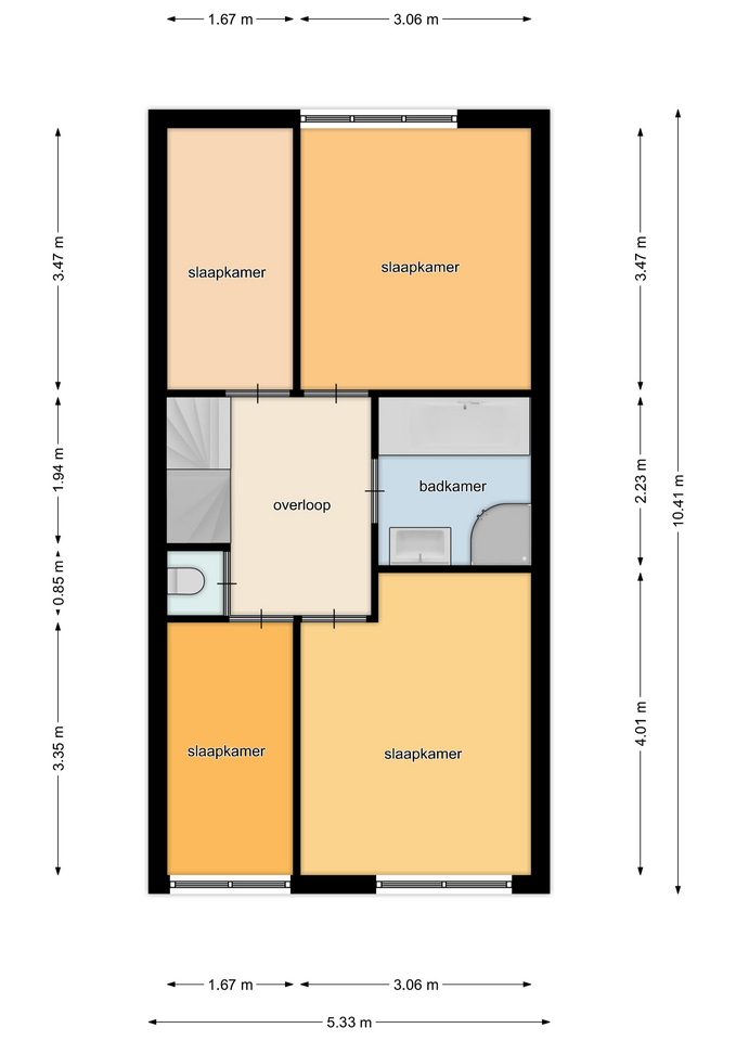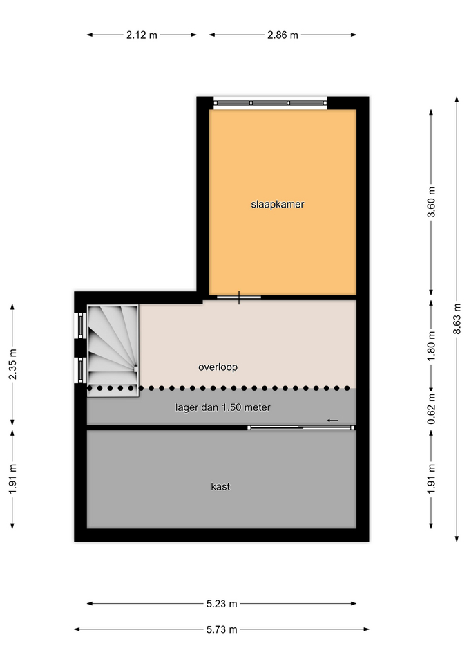 Tweede verdieping: op de tweede verdieping bevindt zich een 5e slaapkamer, die via de overloop met handige vaste kast te bereiken is.
