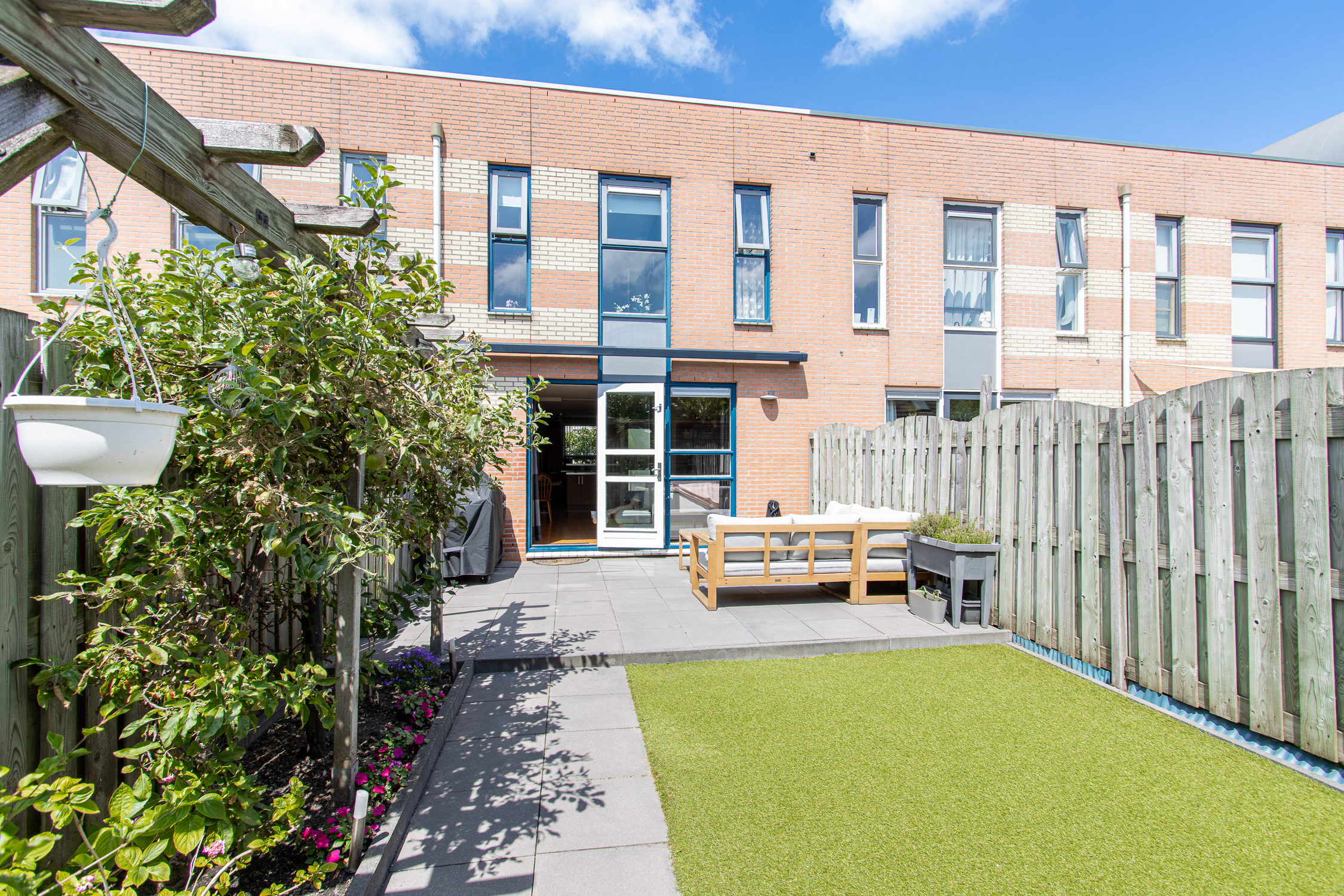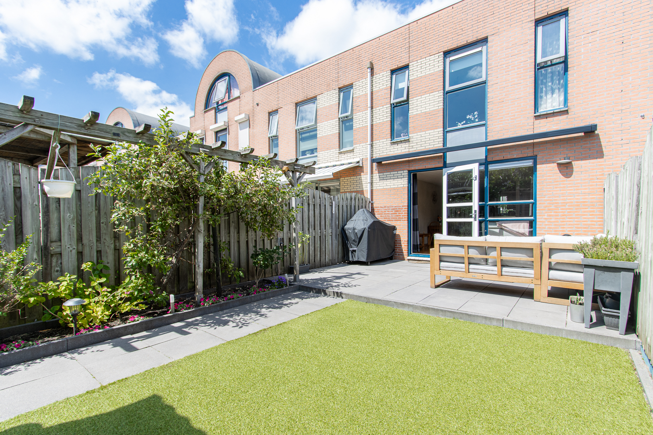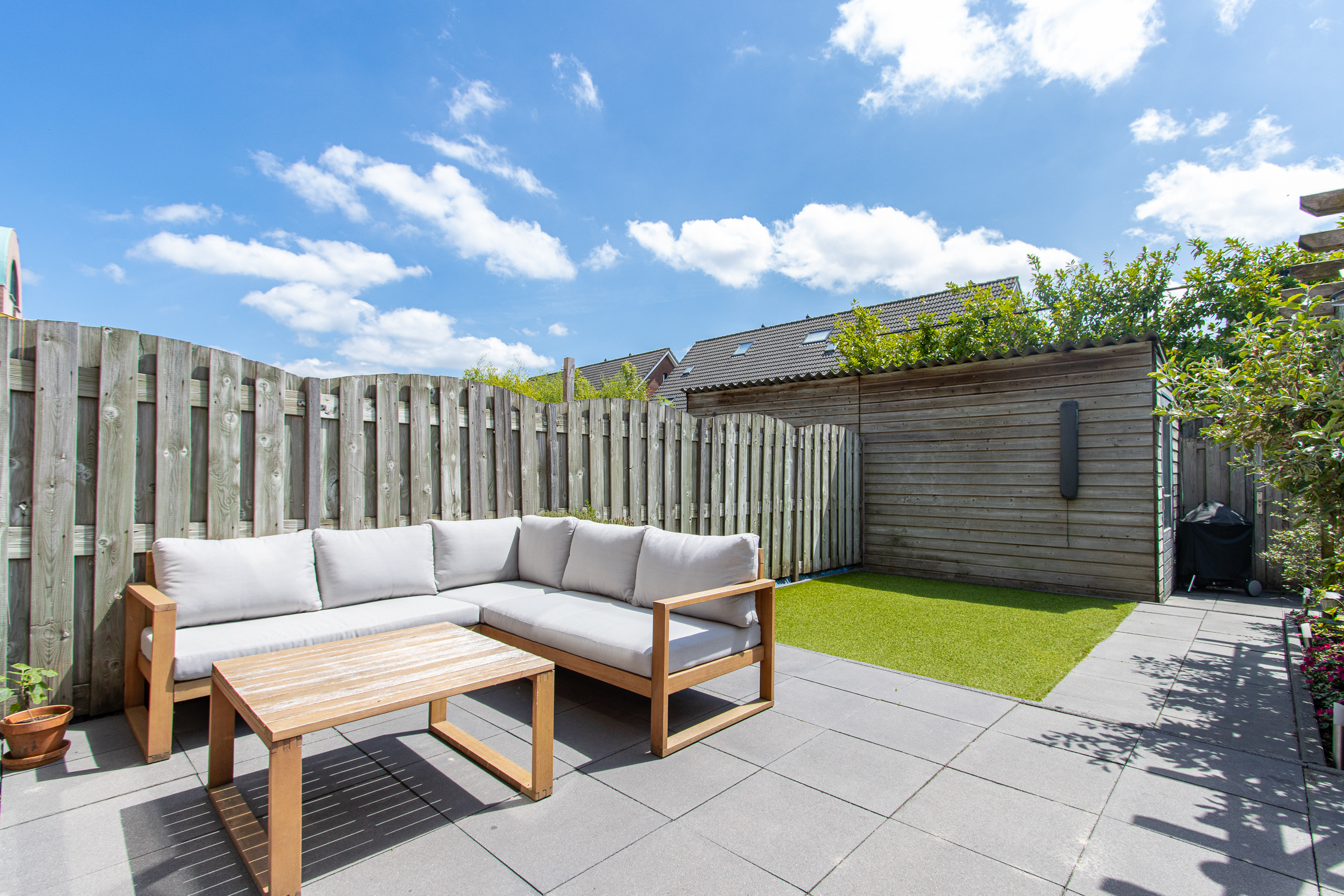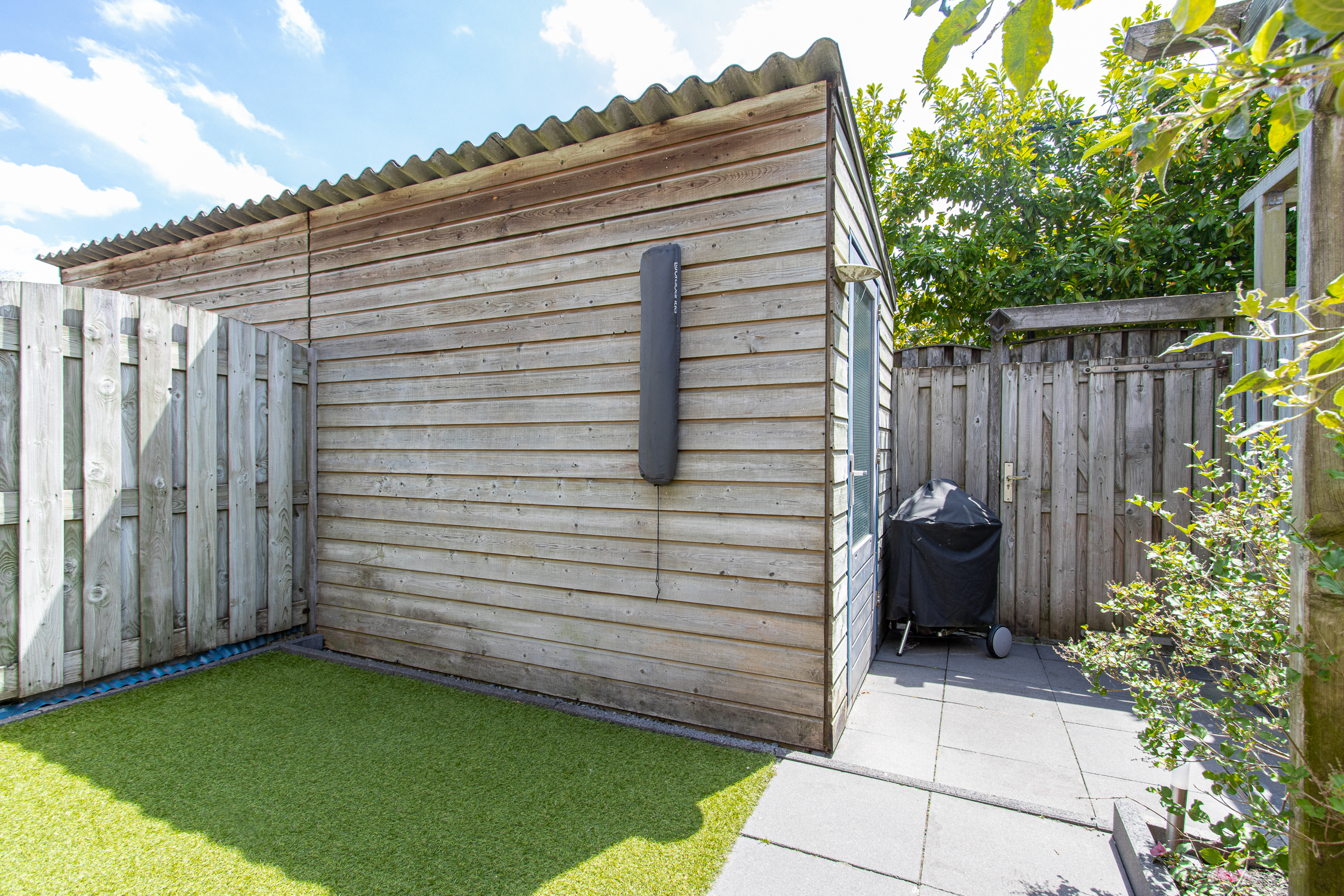 Aan de achterzijde bevindt zich de verzorgde tuin met zonnige ligging op het zuiden. De tuin is sfeervol ingericht met moderne terrastegels, plantenborders, kunstgras, een vrijstaande houten berging en heeft een achterom.