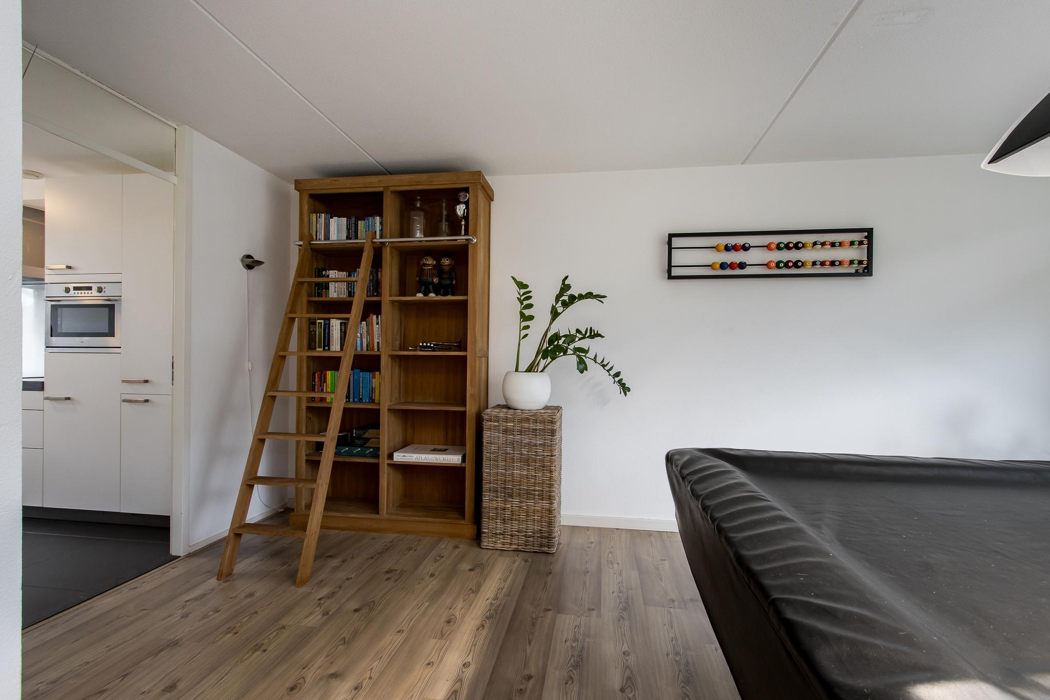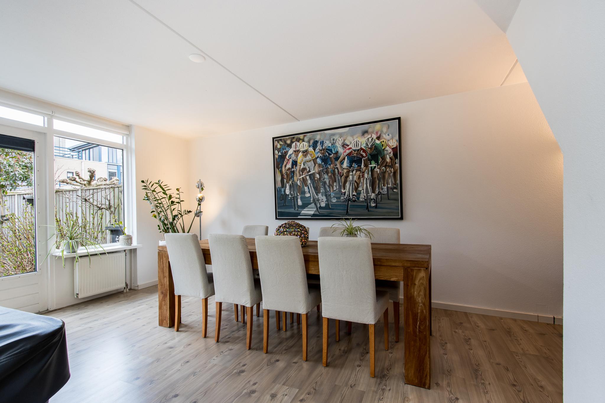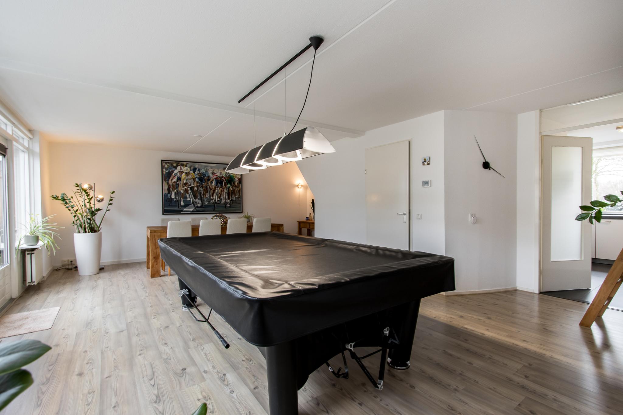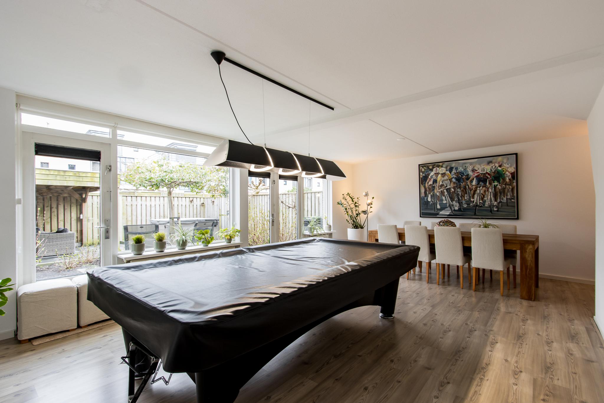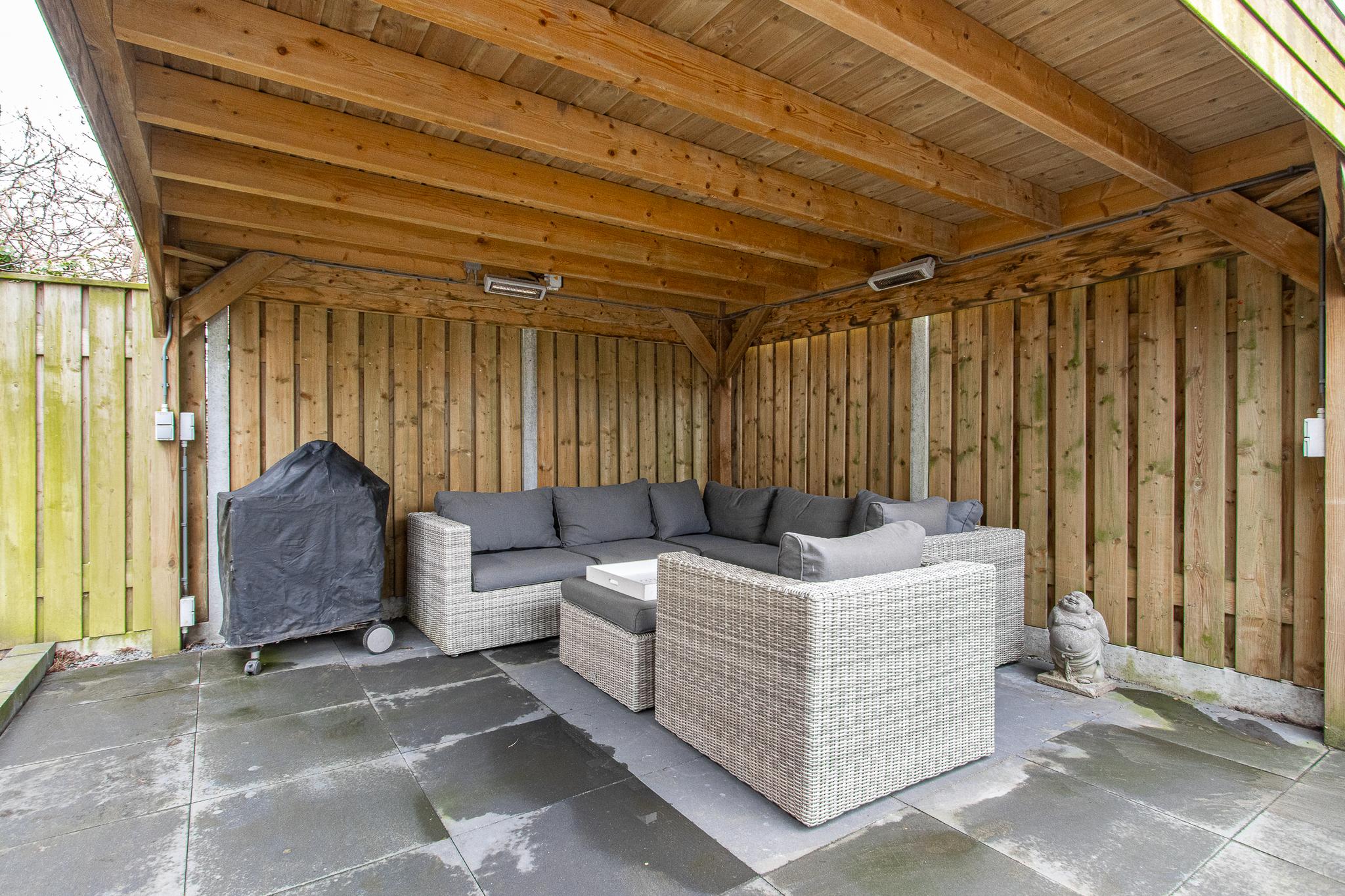 De lichte en ruime woonkamer vormt het hart van de woning. Dankzij de grote raampartijen en de openslaande deuren naar de fraai aangelegde achtertuin met sfeervolle overkapping geniet je hier volop van het daglicht en het buitenleven.
