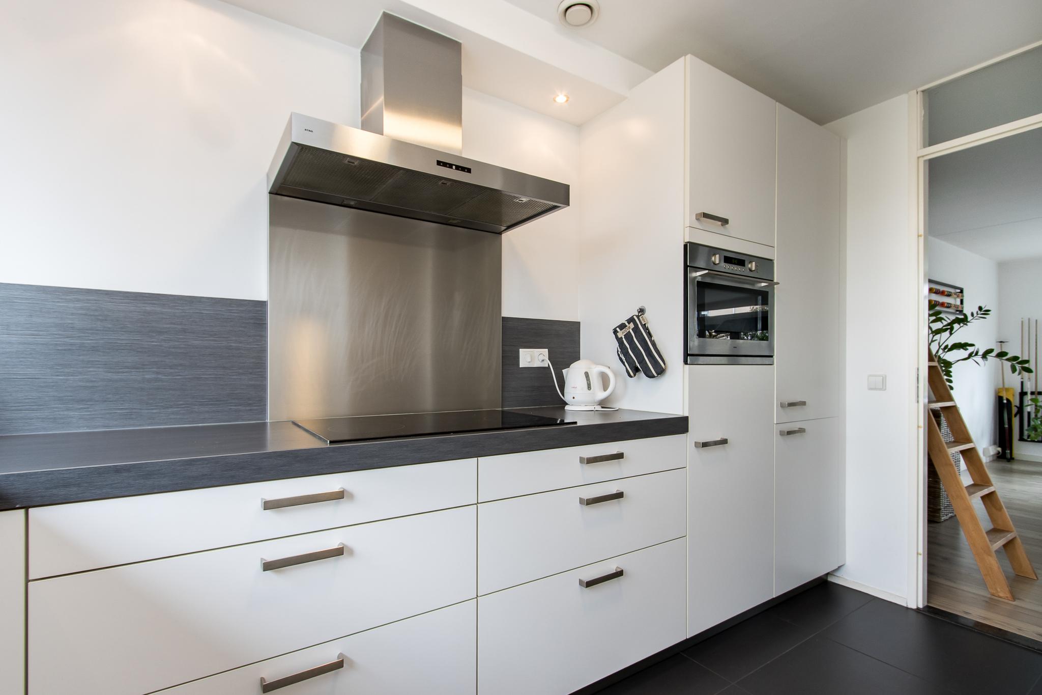 Aan de voorzijde van de woning bevindt zich de moderne keuken, die is uitgerust met een L-vormig keukenblok en diverse inbouwapparatuur, waaronder een inductiekookplaat, afzuigkap, dubbele spoelbak, combi-oven, koel-vriescombinatie en vaatwasser.