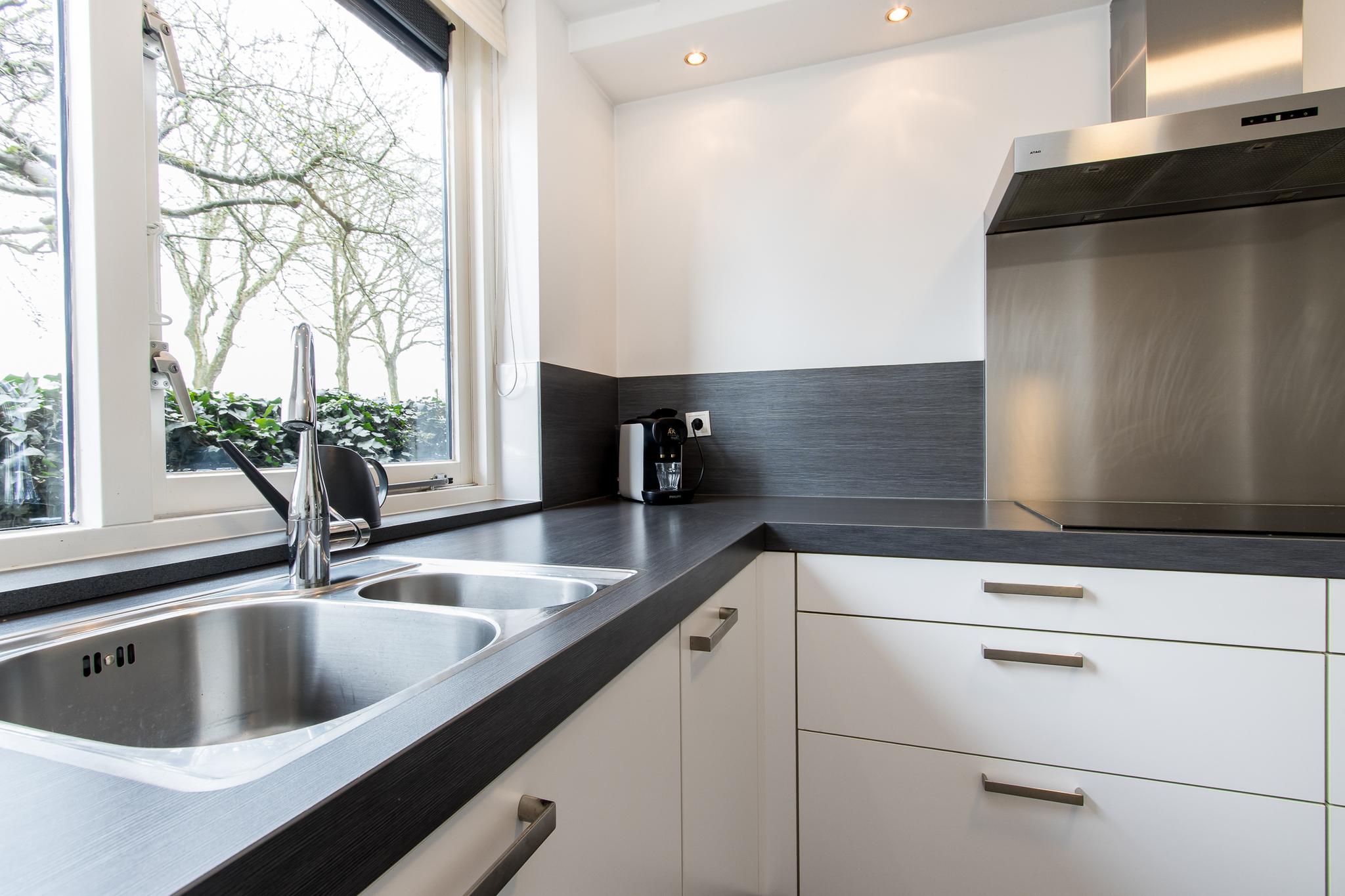 Aan de voorzijde biedt de moderne dichte keuken een vrij uitzicht op de autoluwe straat en het groene Esplanadepark.