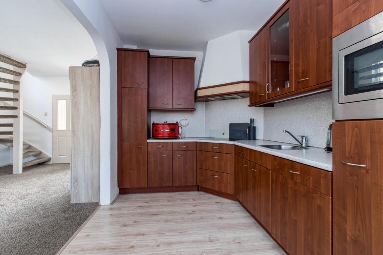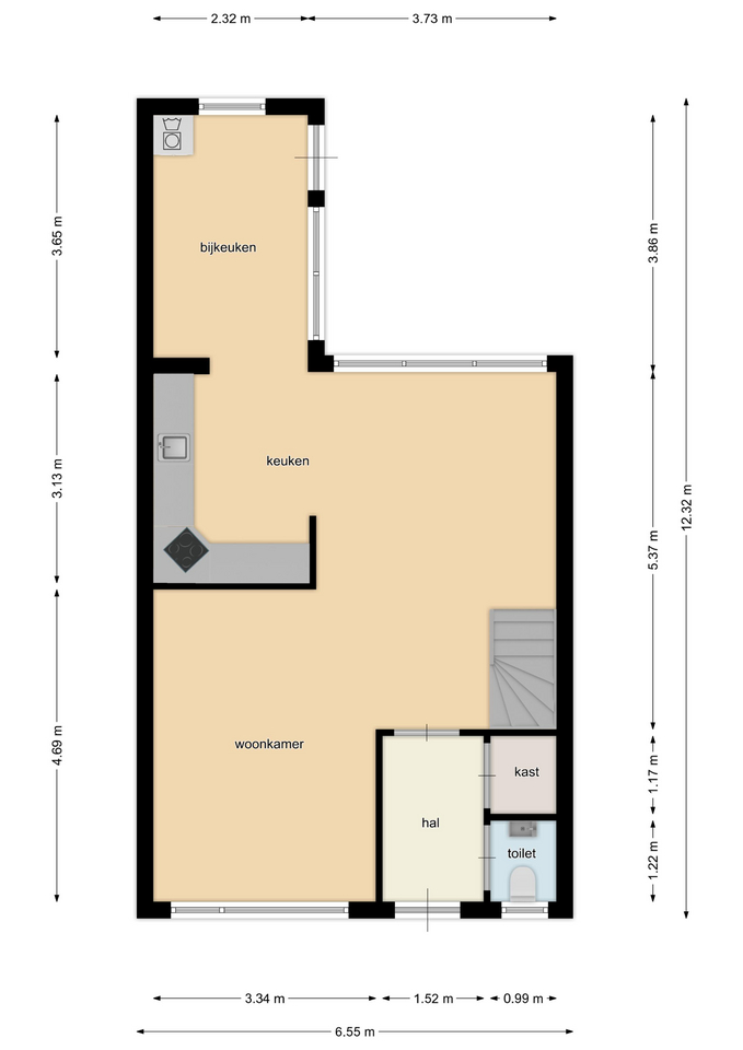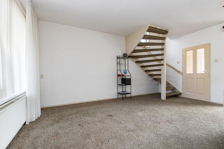 Begane grond: de hal met toiletruimte, meterkast en vaste bergkast geeft toegang tot de royale woonkamer met trapopgang naar de eerste verdieping. De keuken staat in open verbinding met de woonkamer en is voorzien van hoekkeuken voorzien van diverse inbouwapparatuur zoals een elektrische kookplaat met afzuigkap, combi-magnetron (2018), vaatwasser en koelkast. Aangrenzend bevindt zich een royale uitbouw met aansluiting voor wasmachine en droger. Via deze uitbouw is de achtertuin te bereiken.