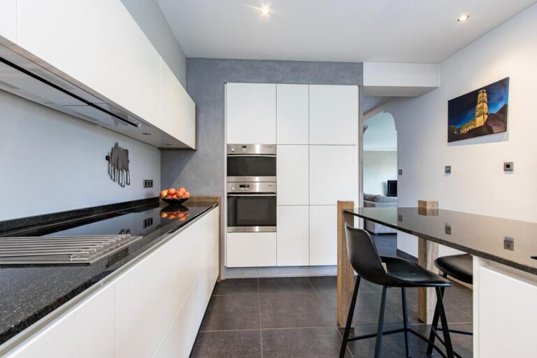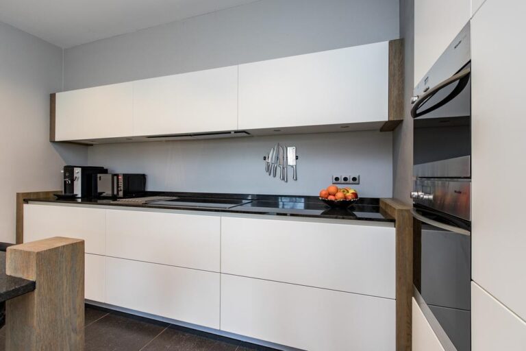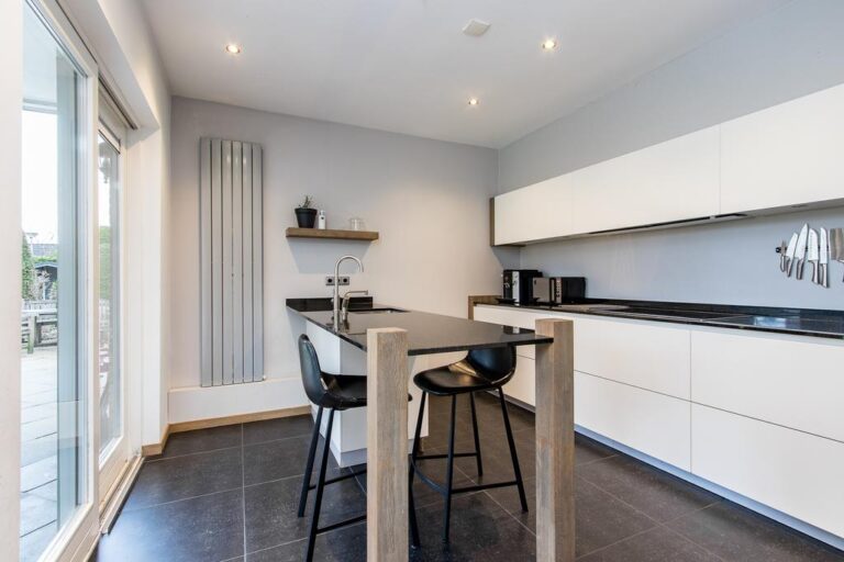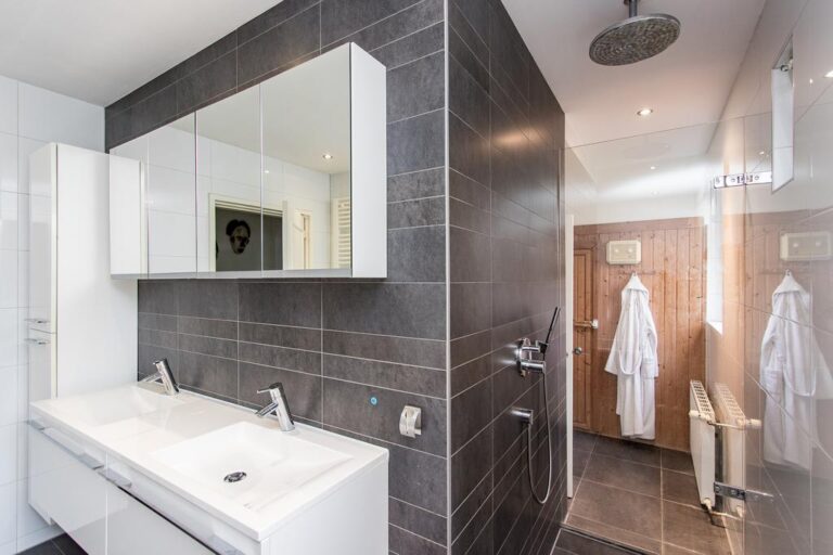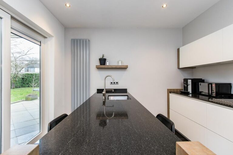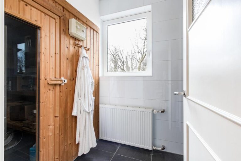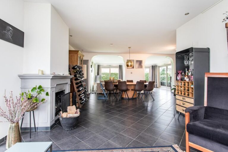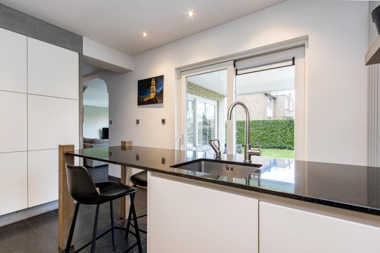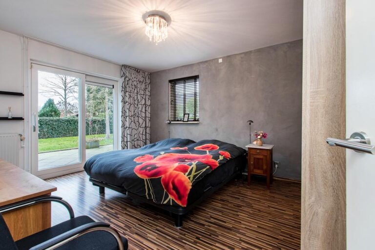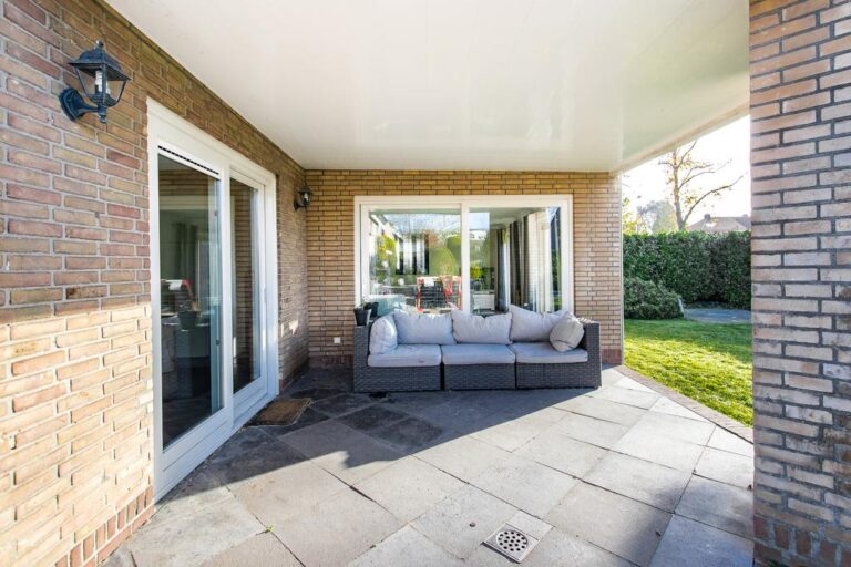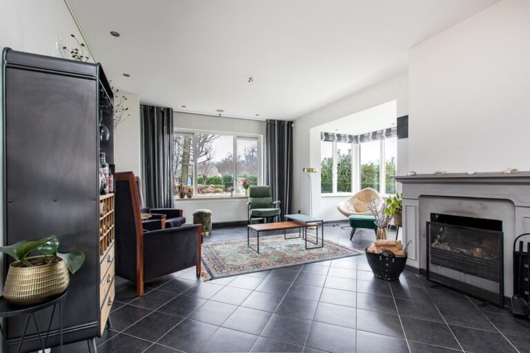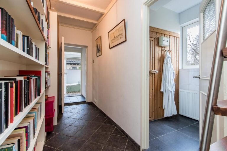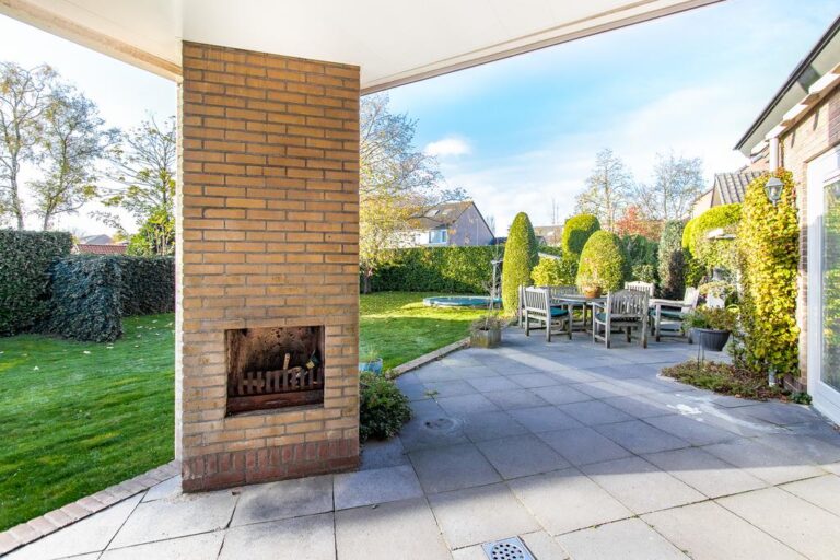 Begane grond: aan de voorzijde van de woning is de ruime entree gesitueerd. In de hal met vide bevindt zich de trapopgang naar de verdieping en ruime gang met toegang tot de luxe badkamer met whirlpool, dubbele wastafel, inloopdouche en sauna. Via deze gang zijn tevens 2 slaapkamers en de praktische bijkeuken met witgoedaansluiting bereikbaar. De ruime woonkamer met zit- en eetgedeelte bereikt u via de hal en beschikt over een erker, schouwhaard en fraaie tegelvloer. Aan de achterzijde beschikt de sfeervolle living over een drietal schuifpuien waardoor de ruimte van extra veel lichtinval geniet én het overdekte terras toegankelijk is. De moderne keuken is voorzien van luxueuze keukenunit met spoeleiland en vaste kastenwand en beschikt over diverse inbouwapparatuur. Ook hier biedt een schuifpui toegang tot het overdekte terras en tuin.