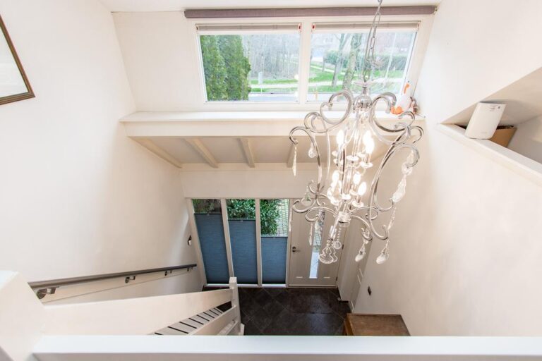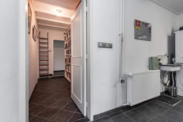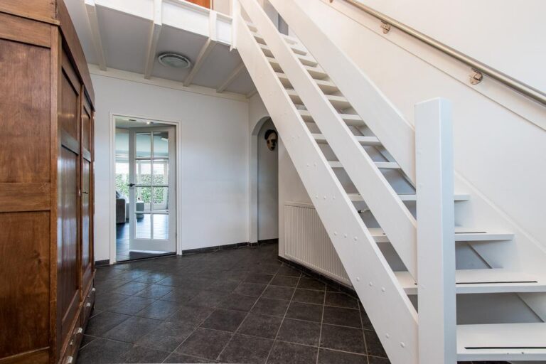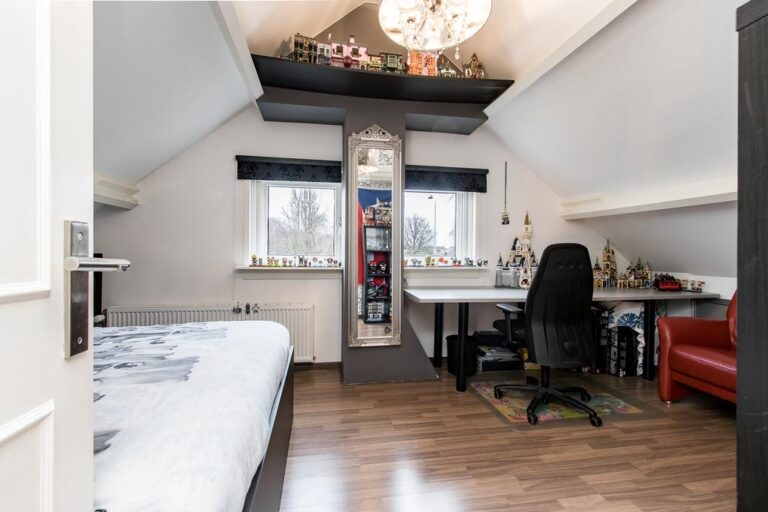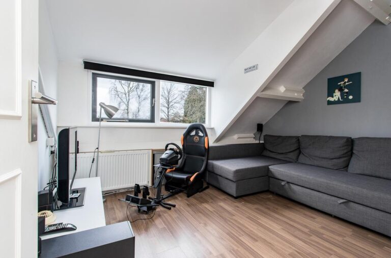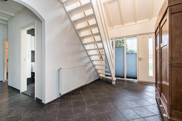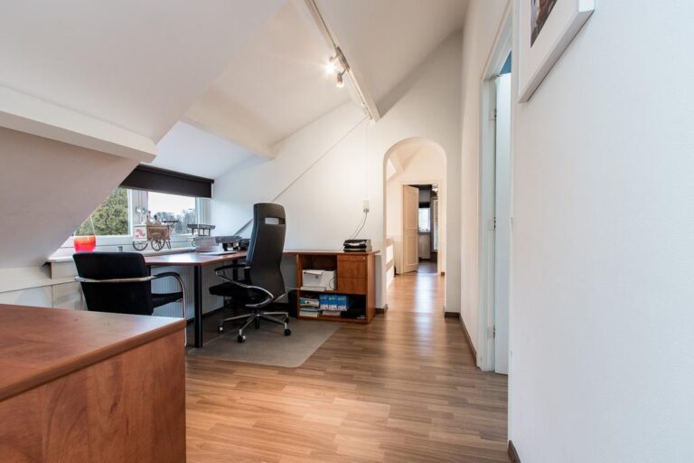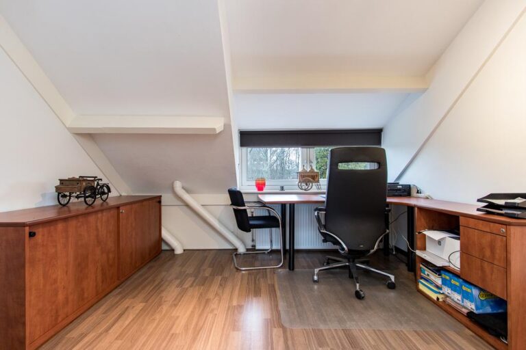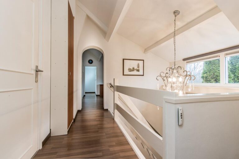Eerste verdieping: de ruime overloop beidt toegang tot 3 slaapkamers, een bergruimte met CV- installatie, hobbyruimte en extra badkamer met douche, wastafel en 2e toilet. Aan zowel voor- als achterzijde zijn er dakkapellen geplaatst voor extra ruimte en licht. De ruime overloop biedt voldoende ruimte voor bijvoorbeeld een werk-of hobbyplek.