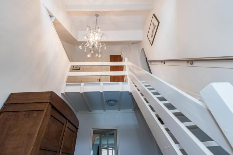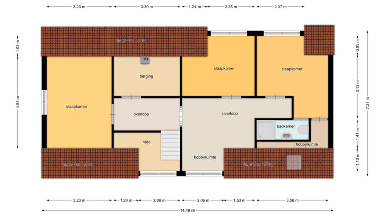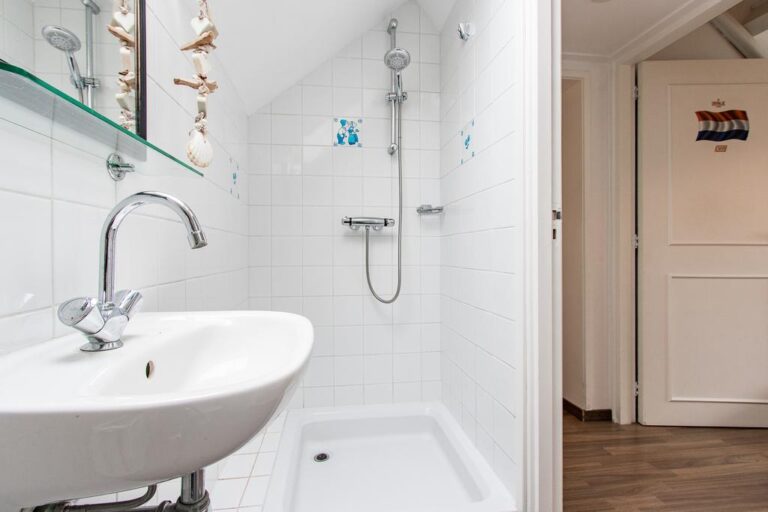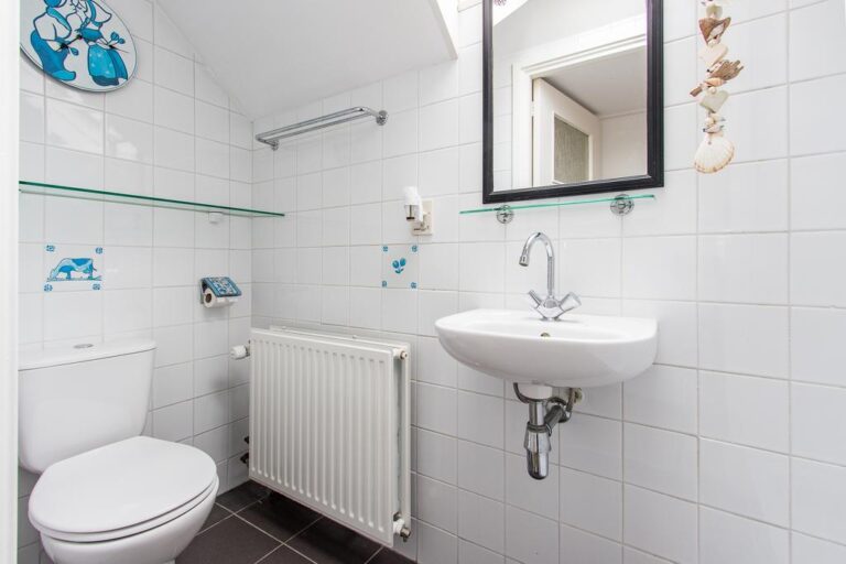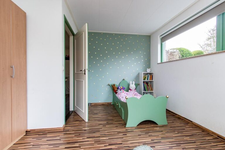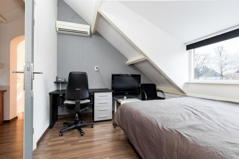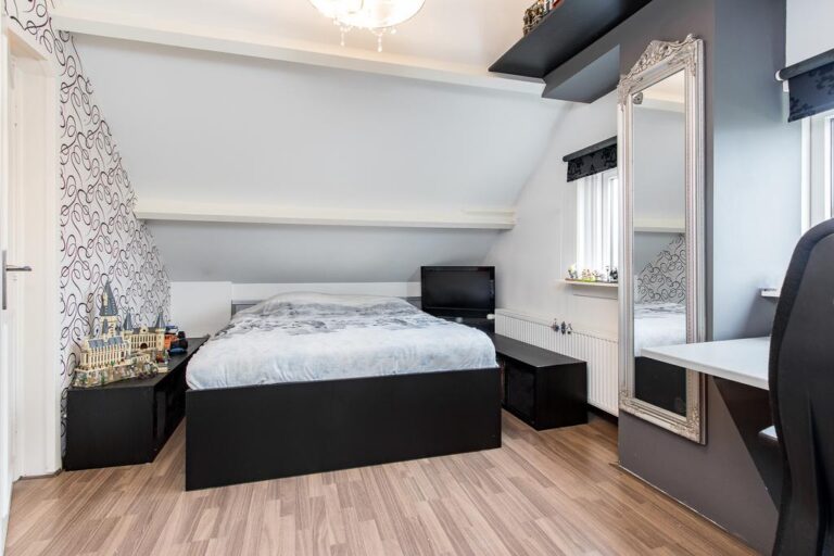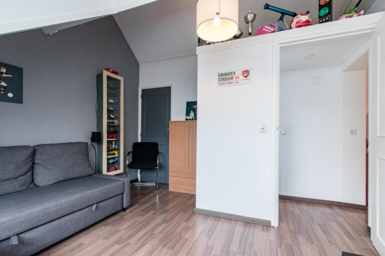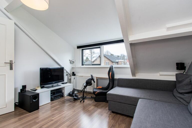 Eerste verdieping: de ruime overloop beidt toegang tot 3 slaapkamers, een bergruimte met CV- installatie, hobbyruimte en extra badkamer met douche, wastafel en 2e toilet. Aan zowel voor- als achterzijde zijn er dakkapellen geplaatst voor extra ruimte en licht. De ruime overloop biedt voldoende ruimte voor bijvoorbeeld een werk-of hobbyplek.