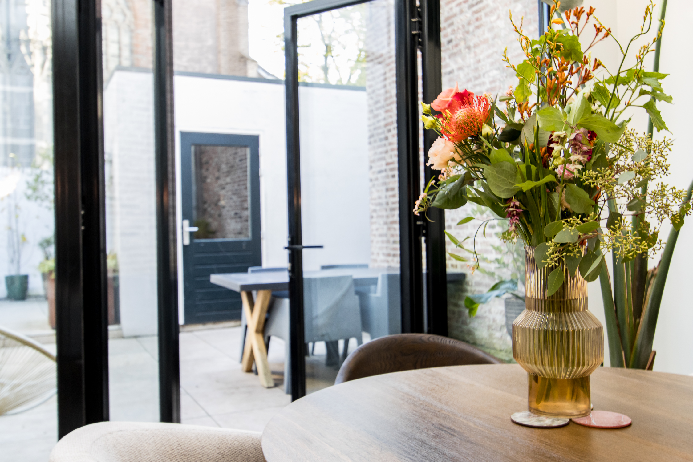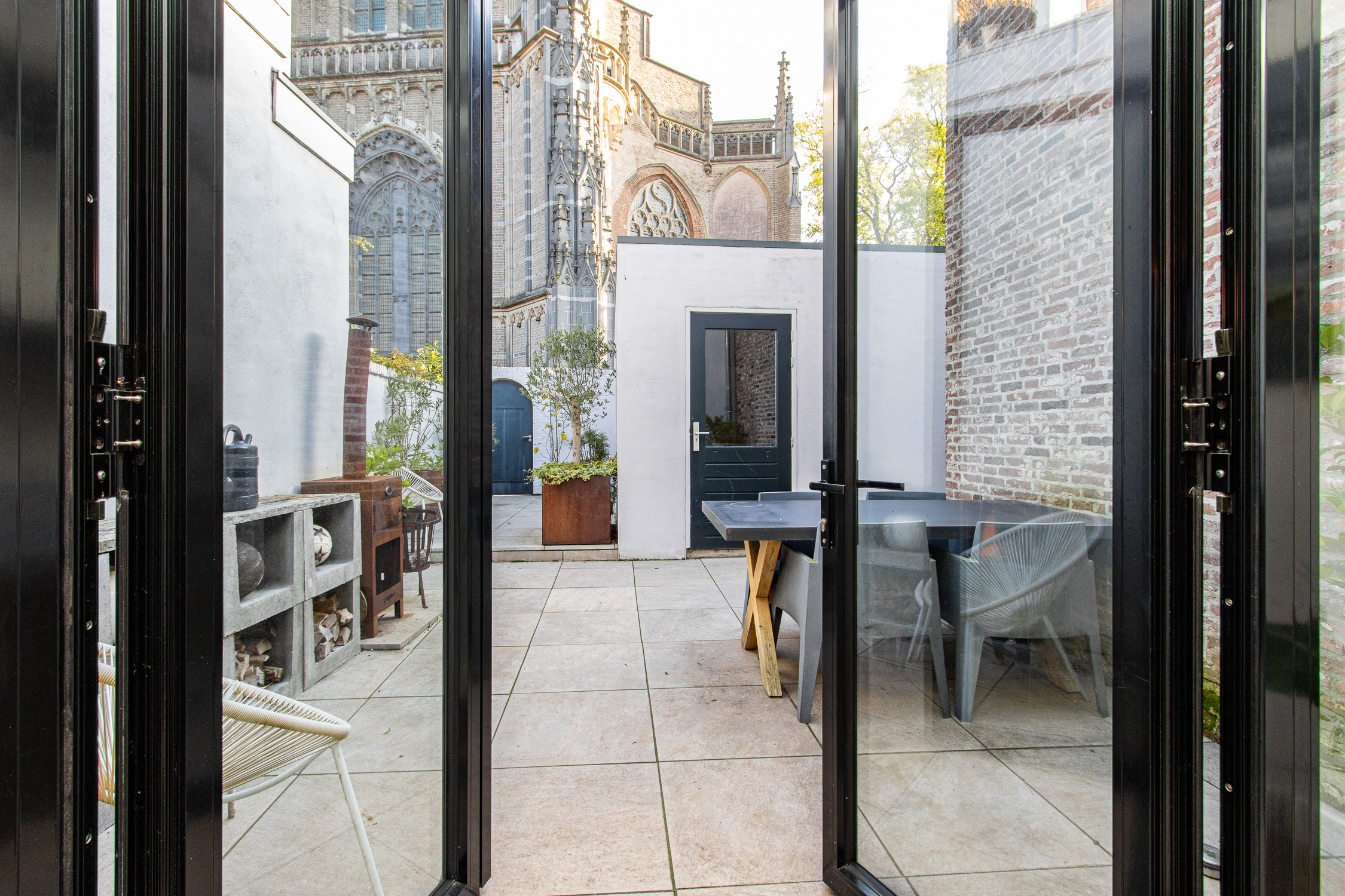 De woonkamer staat in open verbinding met de moderne woonkeuken, uitgevoerd met een stijlvolle vaste kastenwand en een spoeleiland. Aansluitend bevindt zich de ruime eetkamer, waar openslaande deuren direct toegang geven tot de knusse stadstuin. Hier geniet je van een bijzonder uitzicht op de Bommelse toren – een plek om in alle rust te ontspannen of gasten te ontvangen. Via een praktisch portaal met vaste kastruimte – voorzien van aansluiting voor witgoed – is het toilet bereikbaar. Een open trapopgang in de woonkamer leidt naar de eerste verdieping en versterkt het ruimtelijke gevoel van deze lichte en sfeervolle begane grond.