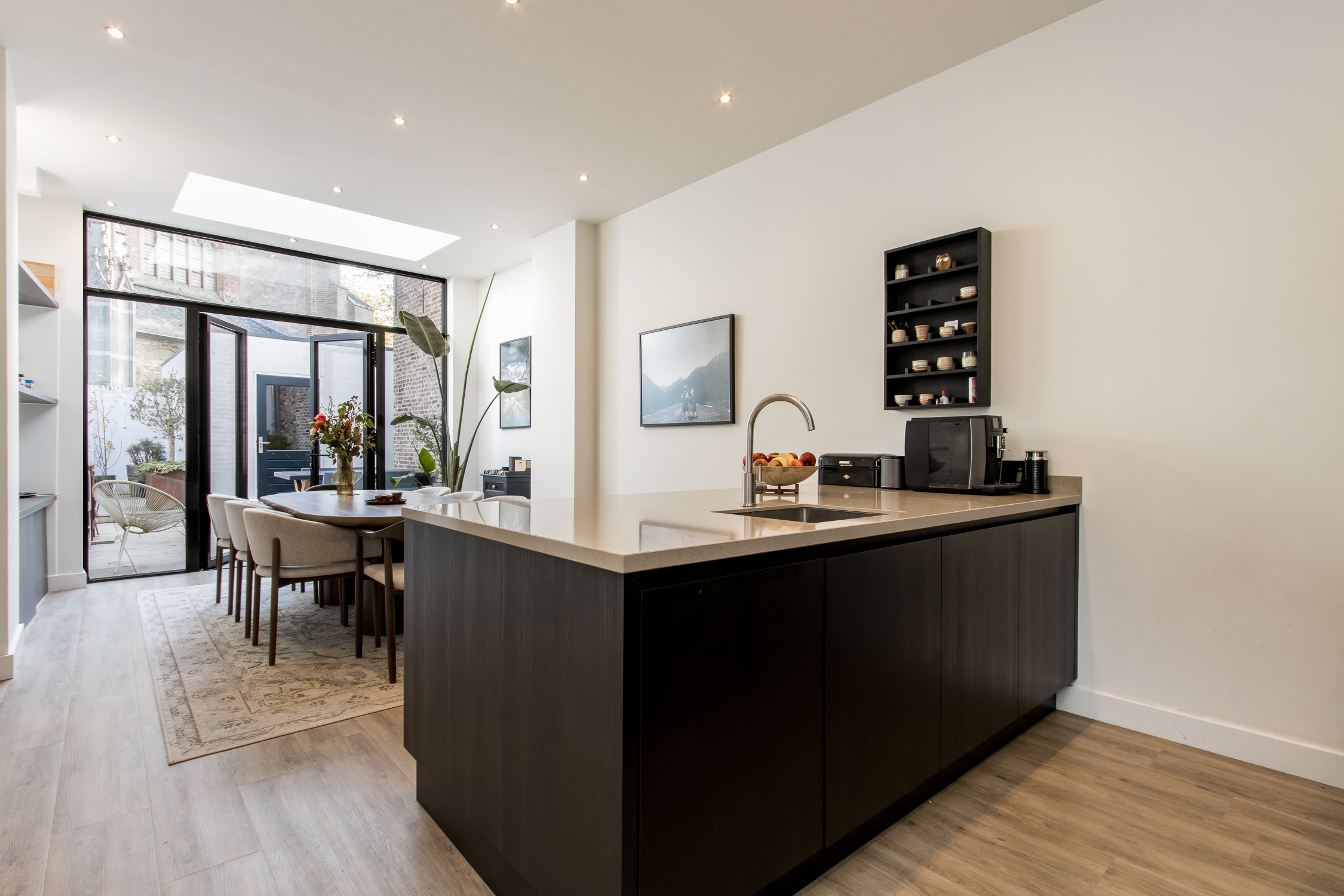 • moderne woonkeuken met spoeleiland en ruime eetkamer;
