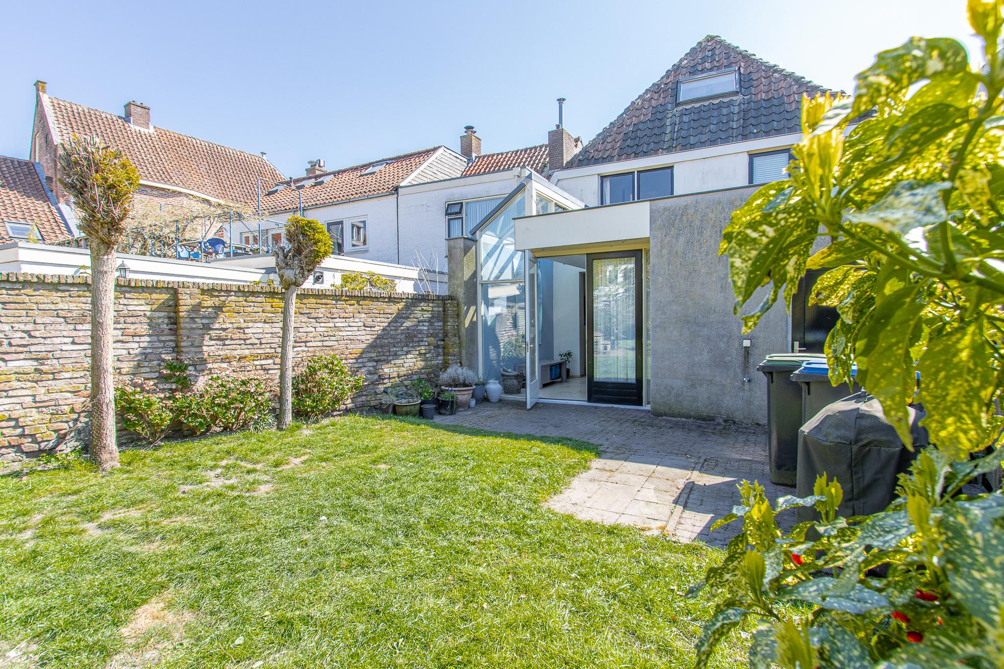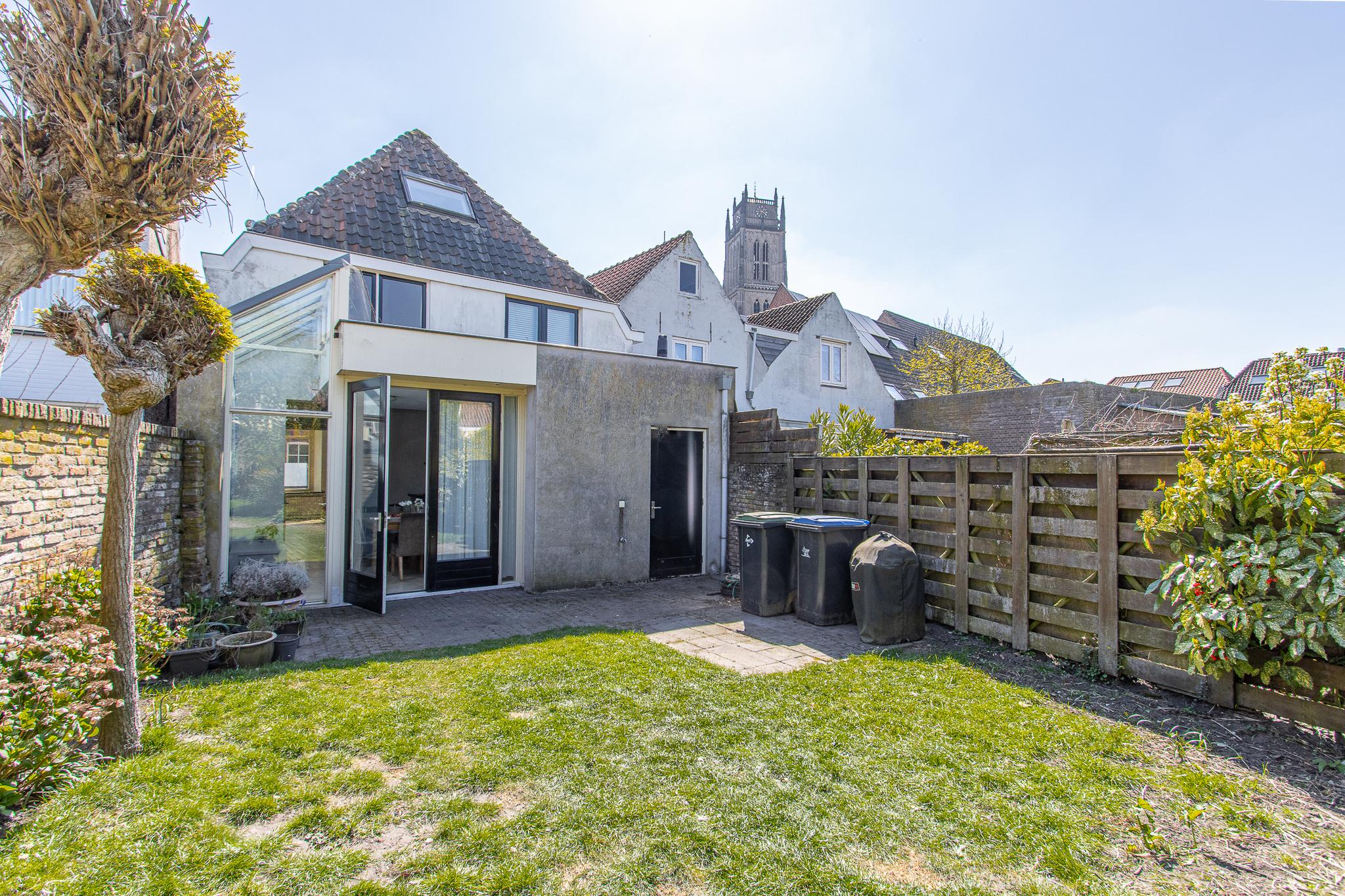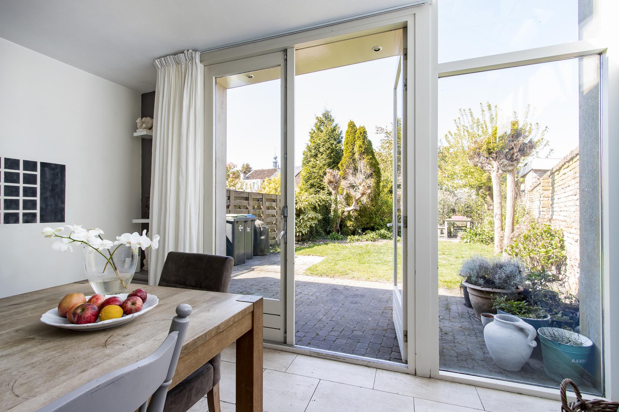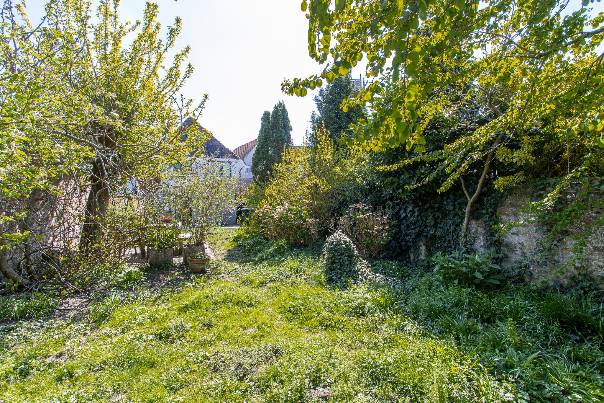 Tuin: de op het noordwesten gelegen tuin is een heerlijk beschutte plek, waar je volop kunt genieten van het buitenleven. Dankzij de vrije ligging en een indrukwekkende diepte van bijna 22 meter profiteer je hier van veel zonuren gedurende de dag. Het geheel is sfeervol aangelegd met een groen gazon, weelderige borders met vaste planten, twee terrassen en fruitbomen. Een karakteristieke tuinmuur van kloostermoppen voegt een authentiek accent toe. Vanuit de tuin heb je bovendien een prachtig uitzicht op de Sint Maartenstoren — een uniek en steeds wisselend decor.