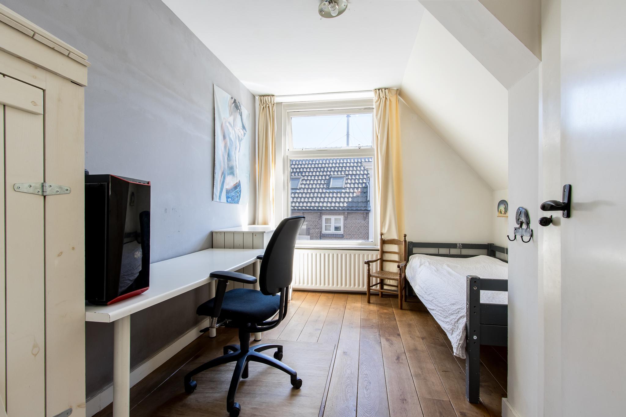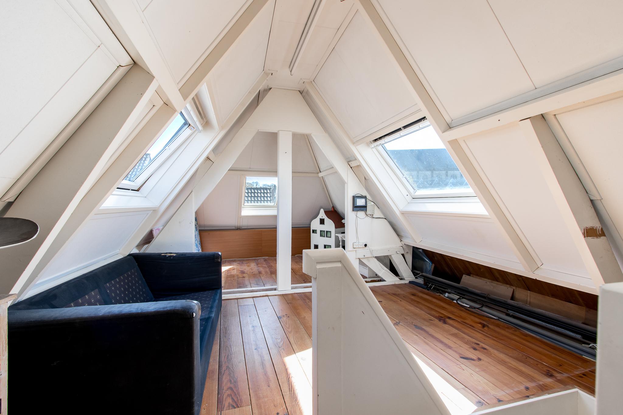 Tweede verdieping: de tweede verdieping biedt een open zolderruimte met een nokhoogte van 2,39 meter. Dakvensters aan beide zijden zorgen voor veel daglicht en een prachtig uitzicht op de toren. Een ideale, lichte plek voor een (thuis)werkplek, studeerkamer, speelruimte of hobbykamer.