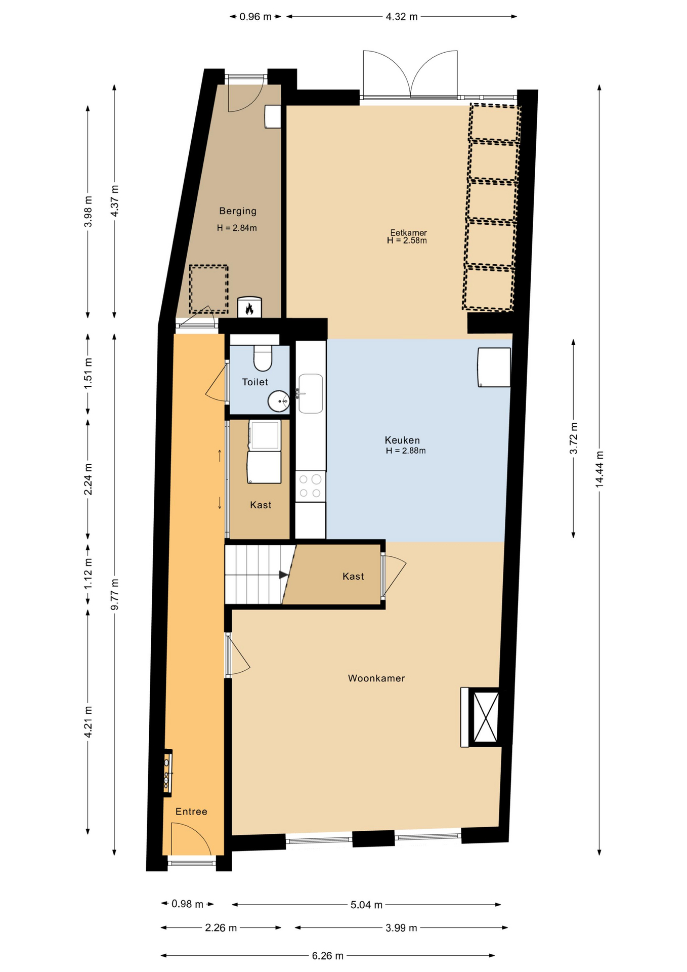 Indeling woning: bij binnenkomst word je verwelkomd in een lange hal waarin functionaliteit en comfort samenkomen. Hier vind je de meterkast, toiletruimte, een kast voor het witgoed en de trap die je naar de eerste verdieping leidt. Vanuit de hal heb je toegang tot zowel de praktische berging als de sfeervolle woonkamer die gelegen is aan de voorzijde van het huis. De woonkamer loopt naadloos over in de open keuken en de tuinkamer, waar het licht royaal binnenvalt via een stijlvolle lichtstraat. De openslaande deuren verwelkomen je naar de achtertuin en maken van binnen en buiten één geheel.