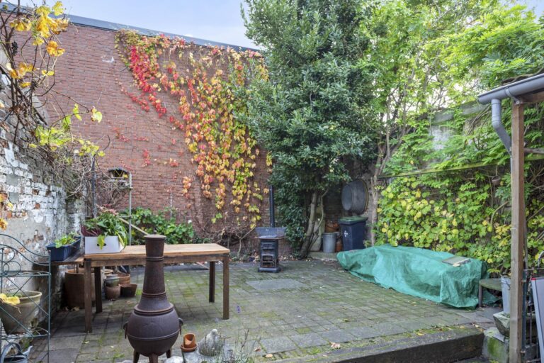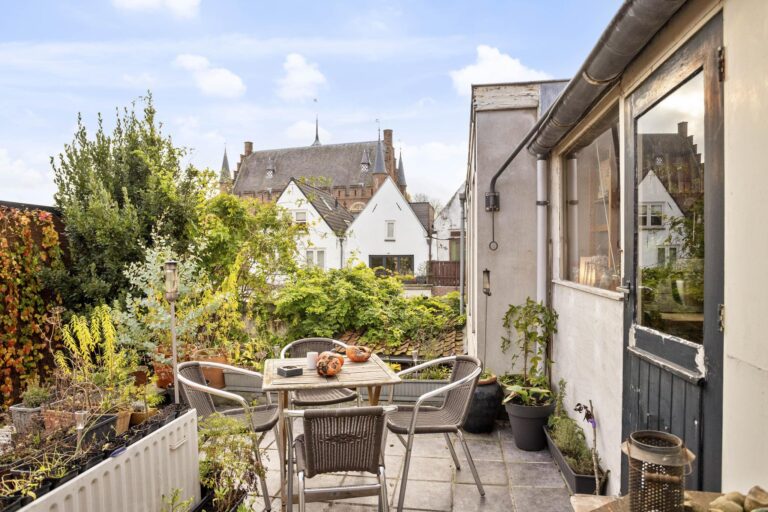 Vanuit het atelier en de kamer aan de achterzijde is de knusse achtertuin te bereiken. De onderhoudsvriendelijke binnenplaats van ca. 38 m² heeft een ligging op het oosten en is voorzien van terras en berging. Op de eerste verdieping beschikt het geheel over een sfeervol dakterras met prachtig uitzicht over de binnenstad en het fraaie Stadskasteel.