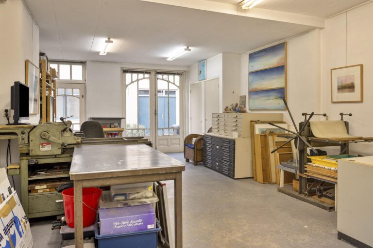 Atelier/ praktijkruimte: de royale ruimte aan de linkerzijde van het pand is middels loopdeur en openslaande deuren toegankelijk. Hier bevindt zich de CV-installatie en meterkast. Een loopdeur aan de achterzijde biedt toegang tot de binnenplaats met berging.