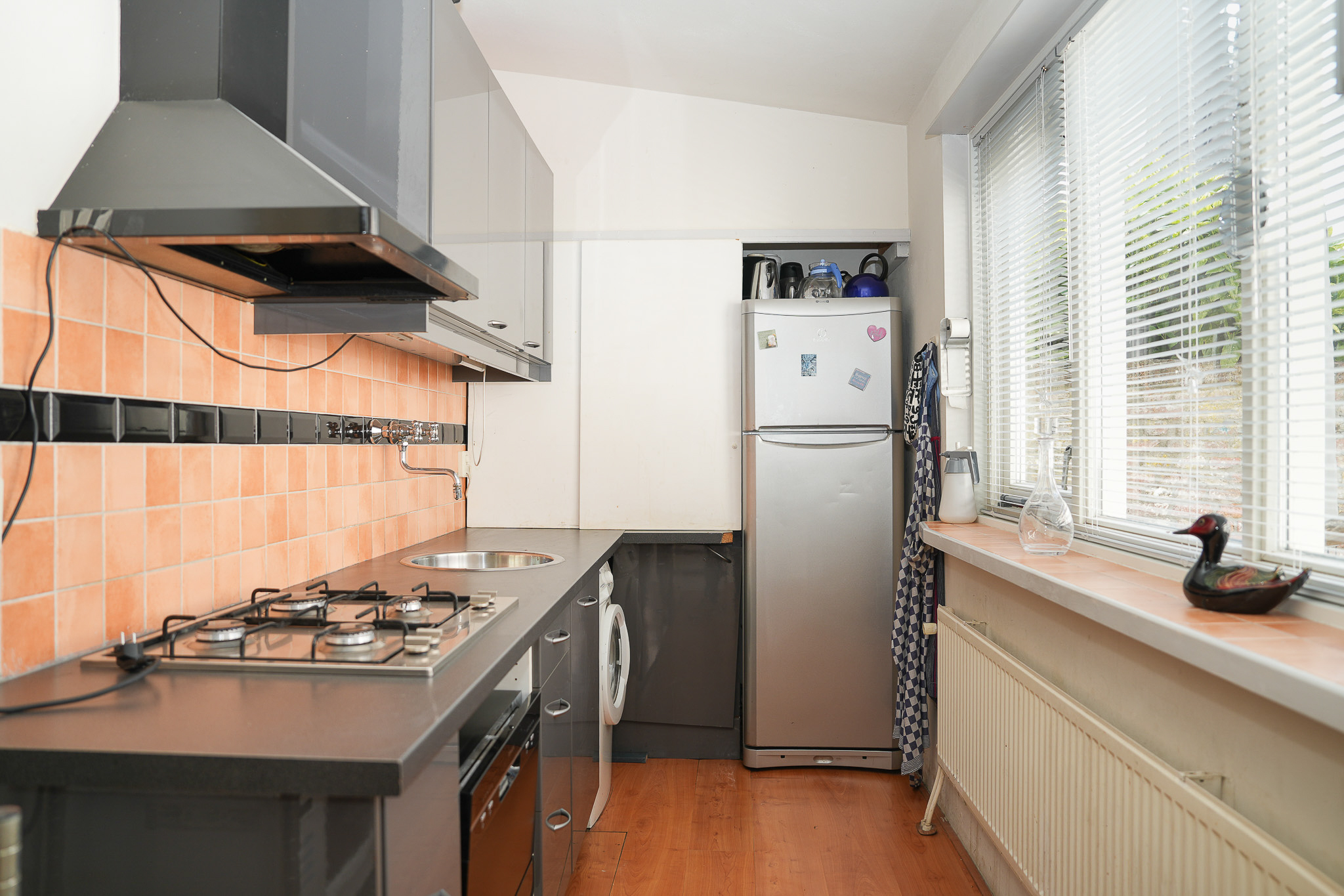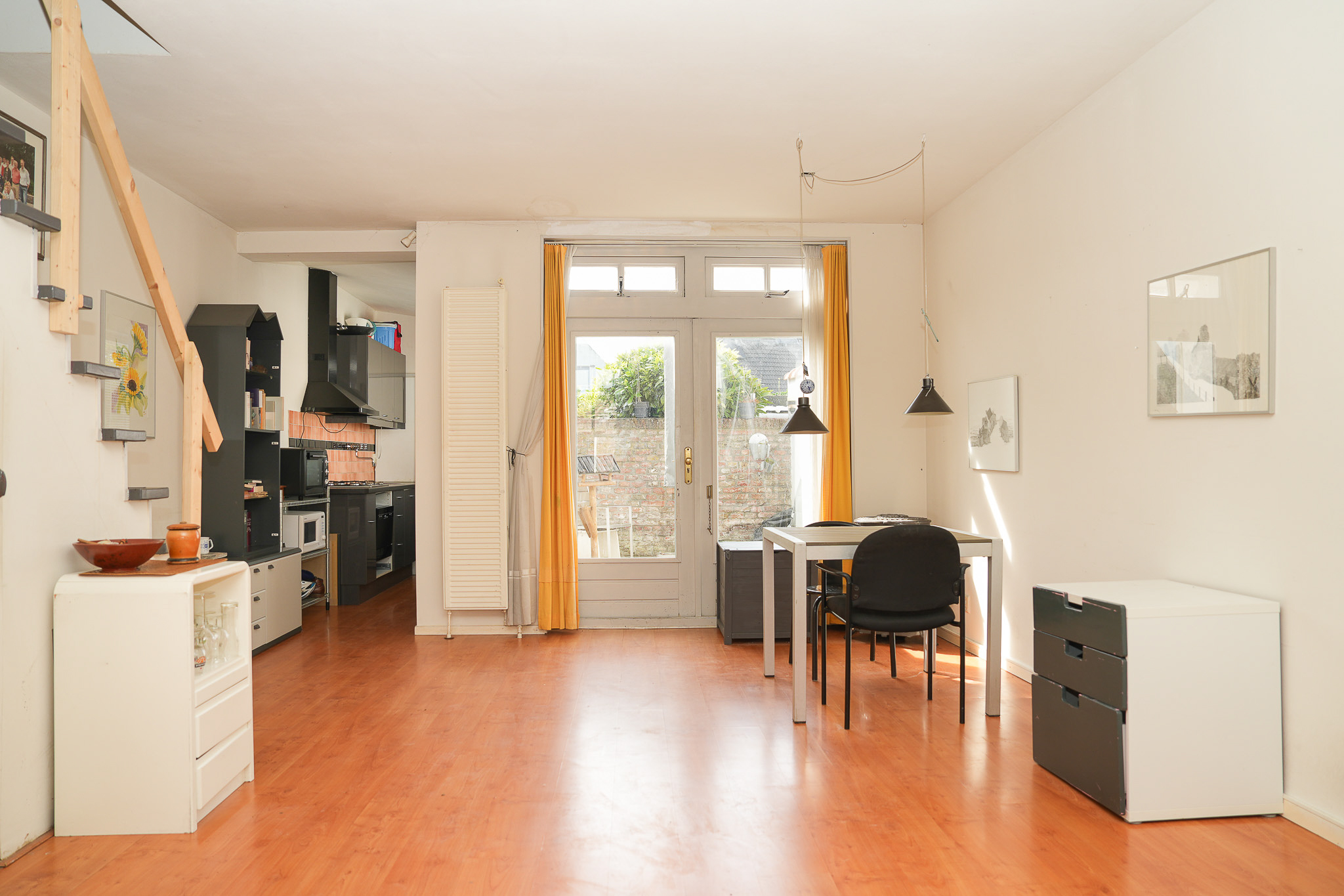 De woning straalt warmte en gezelligheid uit. De sfeervolle living aan de voorzijde is verrassend licht en biedt via openslaande deuren toegang tot een beschutte patio: jouw eigen stadsoase, perfect voor een kop koffie in de ochtendzon of een borrel aan het einde van de dag. De half open keuken aan de achterzijde sluit daar naadloos op aan.