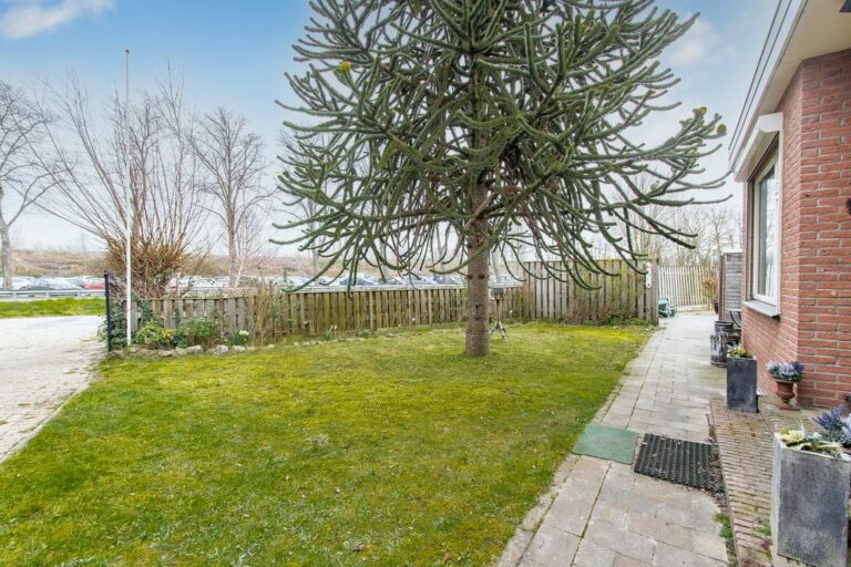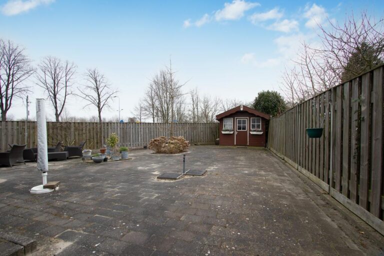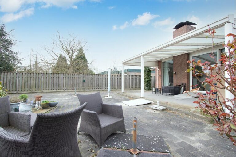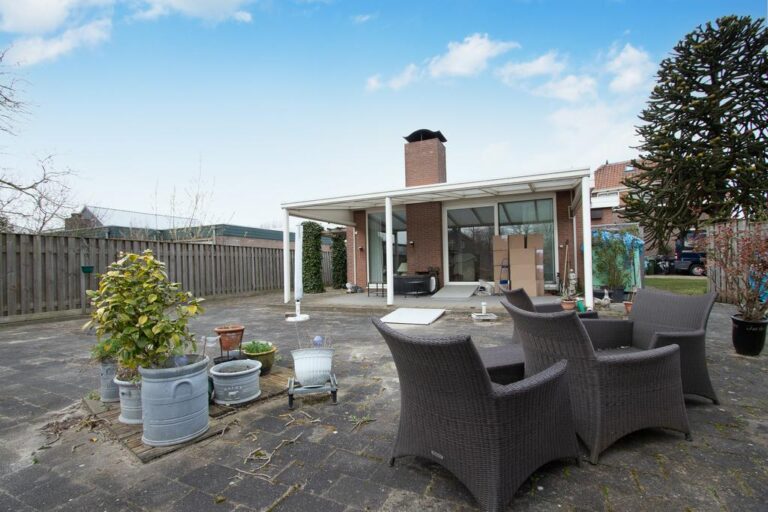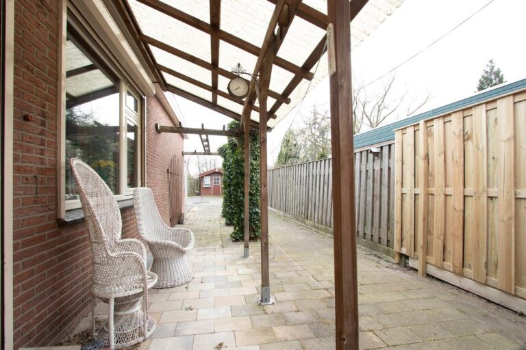 De tuin is onderhoudsvriendelijk aangelegd met ruime oprit, gazon en grotendeels sierbestrating. Daarnaast beschikt het geheel over een carport, inpandig bereikbare berging en een houten tuinhuis. Vanuit de woonkamer bereikt u het terras met een ruime veranda over de gehele breedte. De veranda is voorzien van elektrische screens waardoor het in ieder jaargetij heerlijk toeven is.