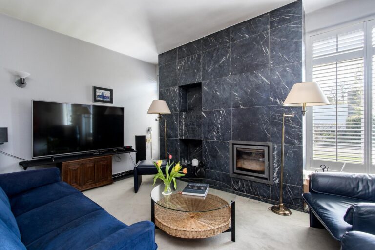 • fraaie onder architectuur ontworpen natuurstenenwand met houtkachel;