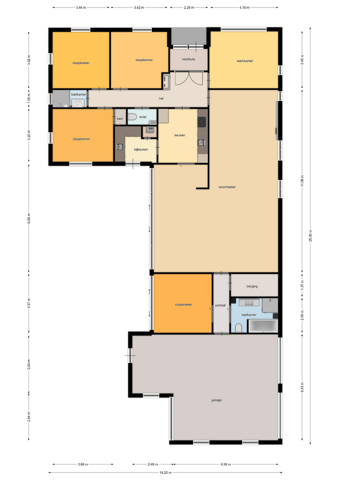 Indeling bungalow: de overdekte entree leidt naar een vestibule met openslaande deuren naar de hal met meterkast. Vanuit de hal zijn de werkkamer en 2 slaapkamers die gelegen zijn aan de voorzijde bereikbaar, evenals een badkamer met douche en wastafelmeubel, een 3e slaapkamer met vaste kast en de toiletruimte. De royale living voorzien van onder architectuur ontworpen natuurstenen wand met houtkachel is bereikbaar vanuit de hal. De woonkamer beschikt over veel raampartijen en een schuifpui, wat zorgt voor veel lichtinval. De keuken is toegankelijk vanuit zowel de hal als de woonkamer en grenst aan een praktische bijkeuken met C.V. kast. Vanuit de woonkamer is er ook toegang tot een portaal met de masterbedroom, voorzien van een schuifpui met directe toegang tot het terras, een berging en een 2e badkamer met ligbad, douche, toilet en wastafelmeubel. Via het portaal is de dubbele garage bereikbaar.