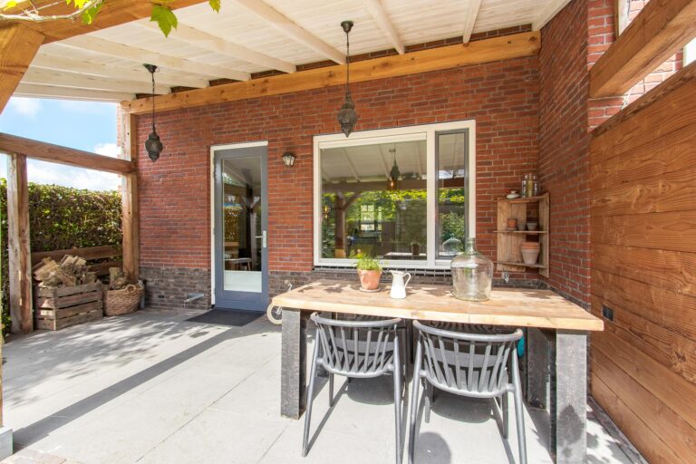 – sfeervolle achtertuin met houten overkapping;